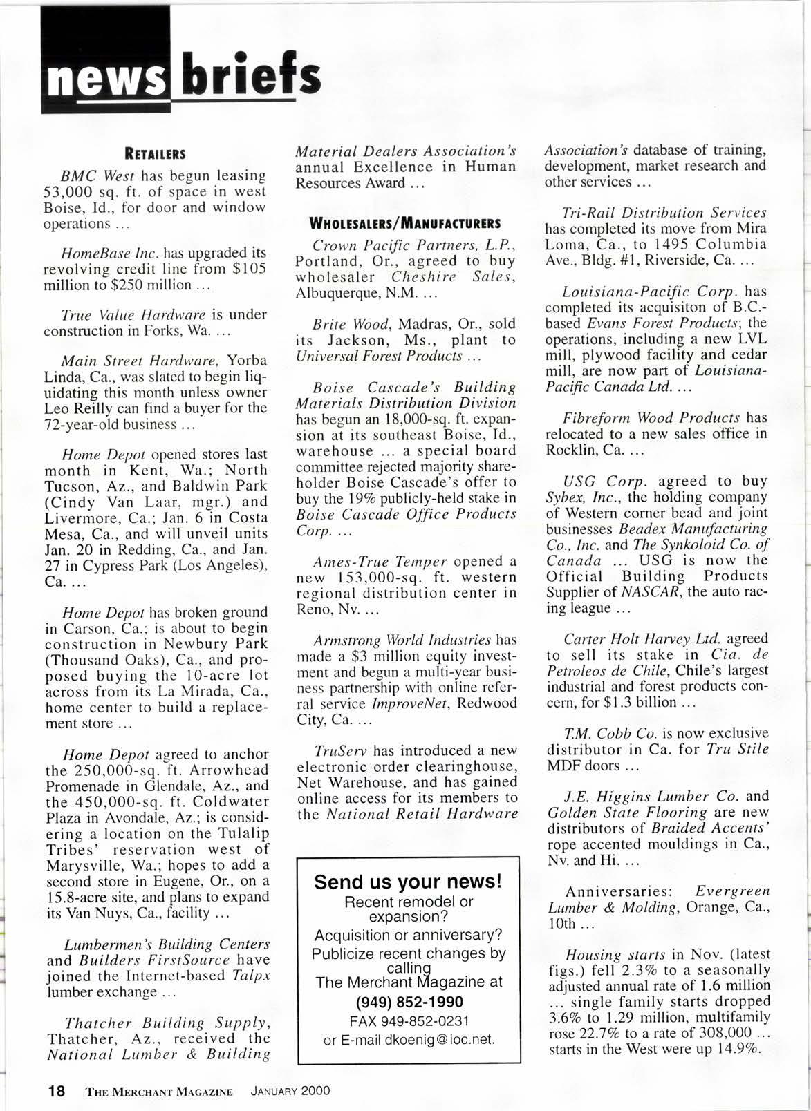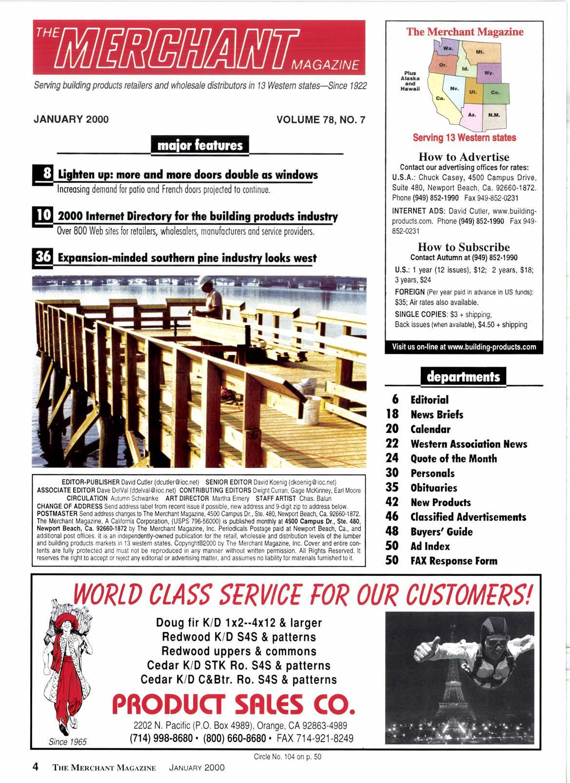 address below. PoSTMASTER Send address changes to The Merchant Magazine,4500 Campus Dr., Ste.480, Newport 8each, Ca.92660-1872. The Merchant Magazine, A Calilornia Corporation, (USPS 79$56000) is published monthly at 4500 Campus 0r., Ste. rl8o, Newporl Beach, Ca. 92660-1872 by The Merchant Magazine, lnc. Periodicals Postage paid at Newport Beach, Ca., and additional post otfices. lt is an independently-owned publicalion lor the retail, wholesale and dislribution levels ol the lumber and building products markels in 13 western states. Copyrighl@000 by The Merchanl Magazine, lnc. Cover and entire contenls are lully prolected and must not be reproduced in any manner without written permission. All Rights Reserved. lt reserves lhe nght lo accept or reject any editorial or adverlising matler, and assumes no liability lor materials lurnished to it. 5 Editoriol l8 llervs Brieft 20 Colendor 22 Weslern Assoriolion llews 24 Quote of the lllonth 30 Personols 35 obituories 42 llew Products 46 Clossified Advertisemenls 48 Buyers'Guide 50 Ad Index 50 tAX Response Jolm I I WORID CLASS SERVICE FOR OUR CUSTOMERS! Doug fir K/D 1x2--4x12 & larger Redwood K/D S4S & patterns Redwood uppers & commons Cedar KiD STK Ro. S4S & patterns Cedar K/D C&Btr. Ro. S4S & patterns PRODUCT SRL€S CO. 2202N. Pacific (P.0. Box 4989), Orange, CA 92863-4989 (714) 998-8680 . (800) 660.8680, FAX714-921-8249 Since 1965 Circle No. 104 on p. 50 4 THn MnncHaNr Macezrxri Jnruunnv 2000