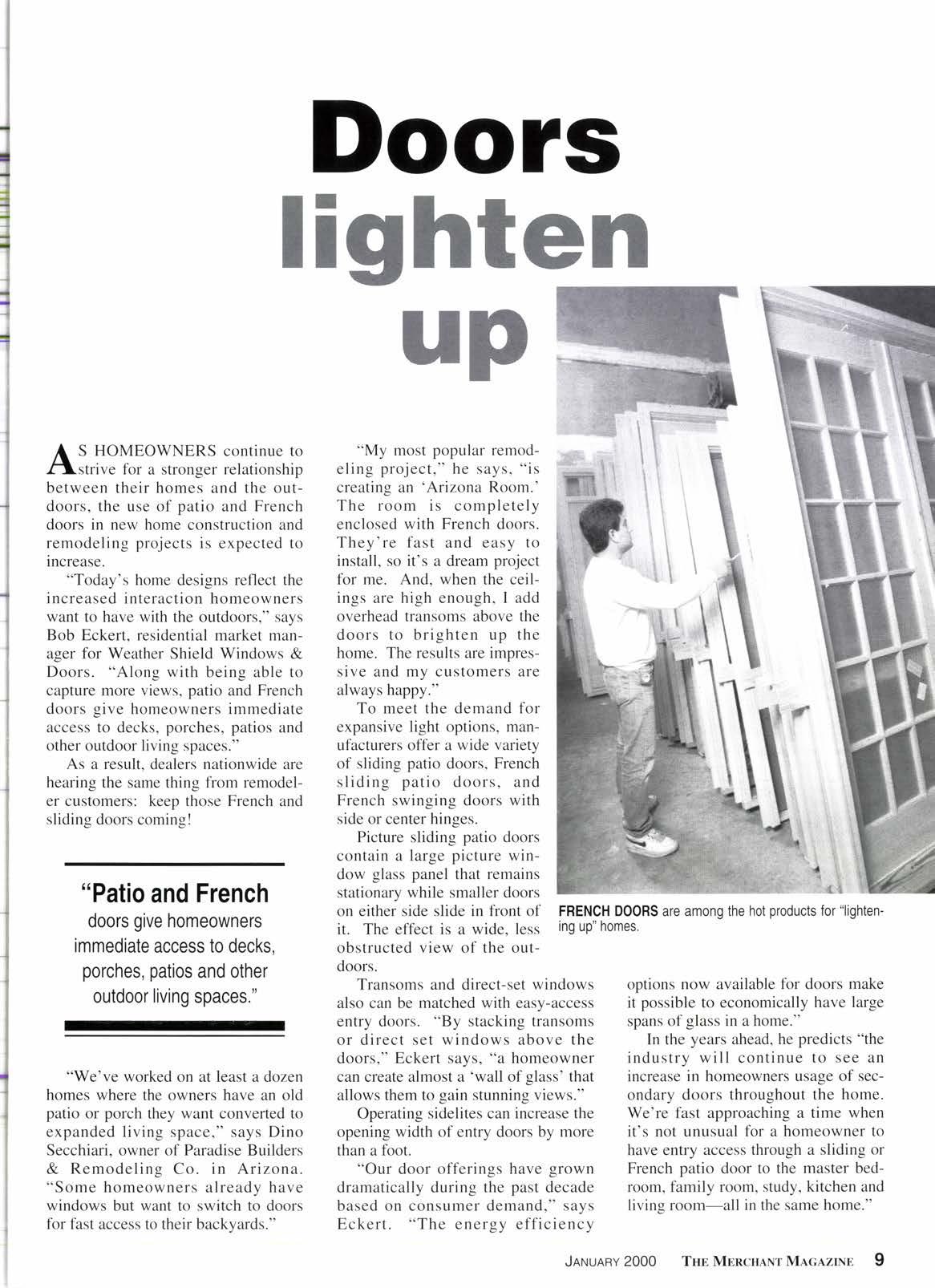 In the years ahead, he predicts "the industry will continue to see an increase in homeowners usage of secondary doors throughout the home. We're fast approaching a time when it's not unusual for a homeowner to have entry access through a sliding or French patio door to the master bedroom, family room, study, kitchen and livine room-all in the same home."