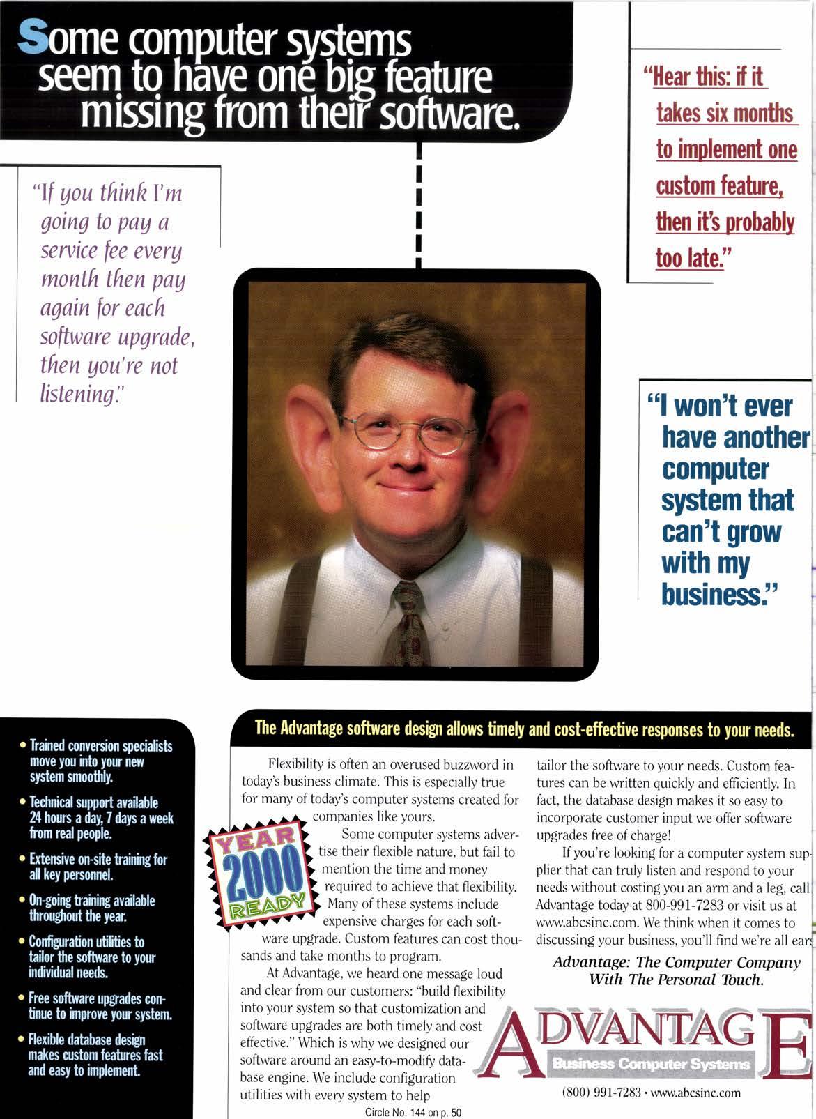 If you're looking for a computer system sup.l plier that can truly listen and respond to your needs without costing you an arm and a leg. calll Advantage today at 800-991-7283 or visit us at I www.abcsinc.com. We think when it comes to F discussing your business, you'll find we're all earf
