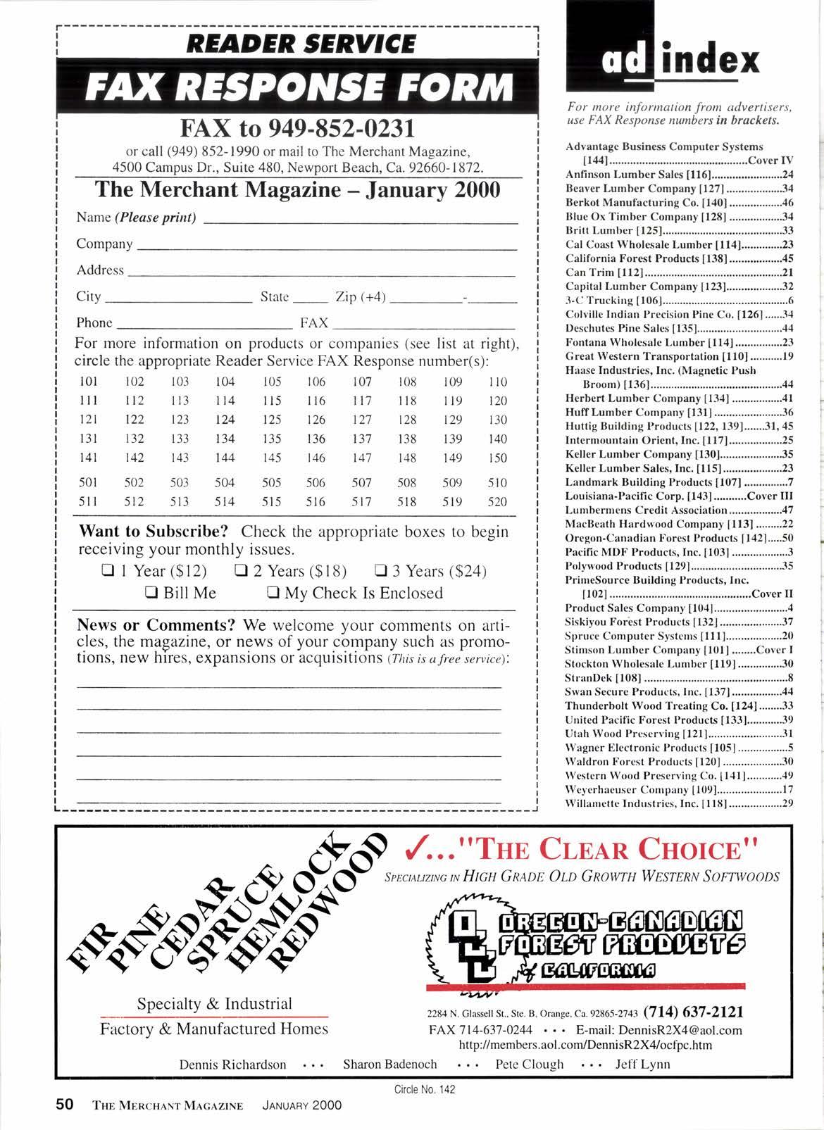 index For more information from advertisers, use FAX Response nwnbers in brackets. Advantagc Business Computer Systems t1441................. ....cover IV Anfi nson Lumber Sales If f 61........................24 Beaver Lumber Company 11271.......,...........34 Berkot Manufacturing Co. If 40] .................,46 Blue Ox Timber Company If 28] ................,.34
