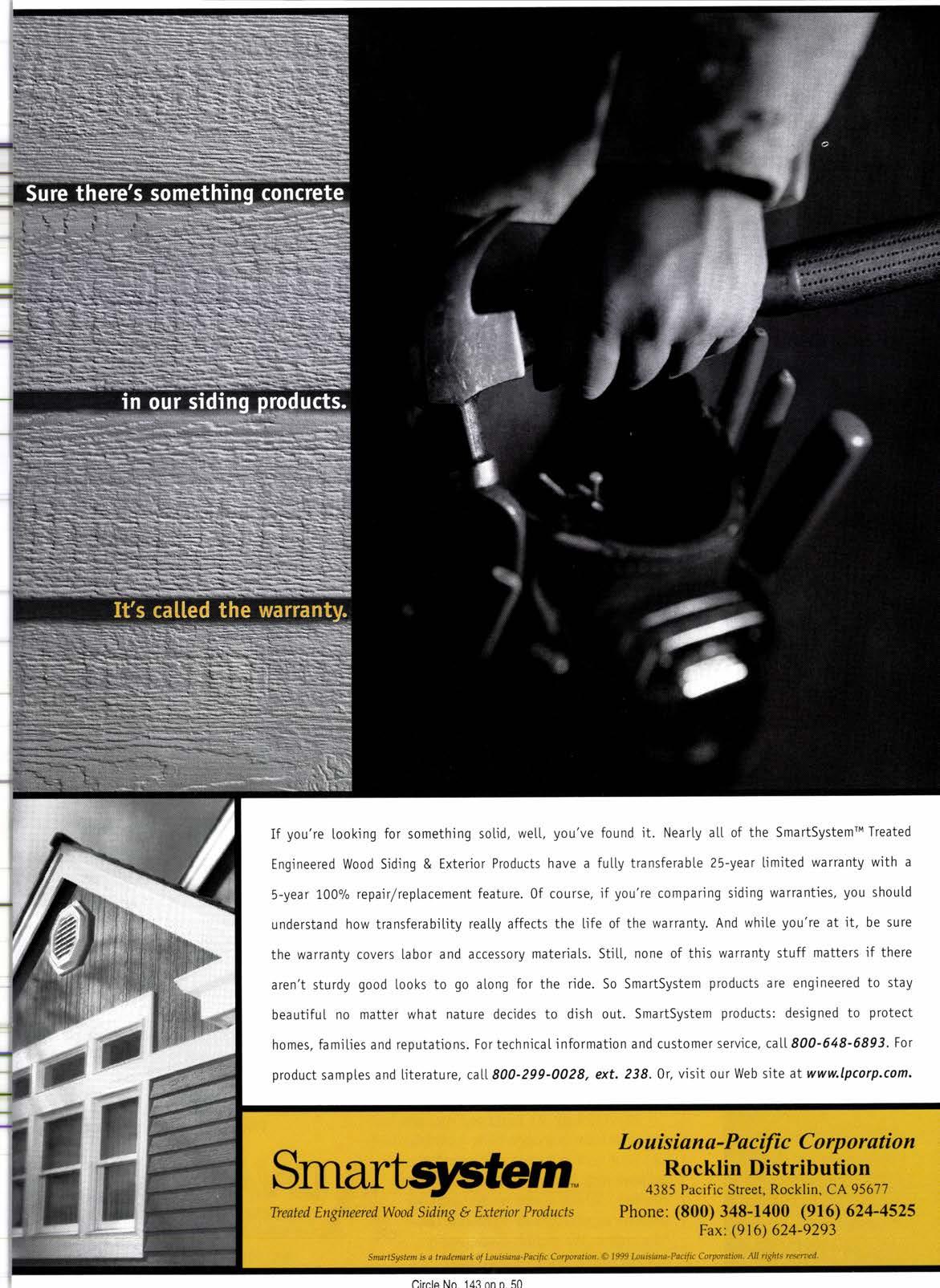 If you're Looking for something soLid, well, you've found it. NearLy all of the SmartSystemrMTreated Engineered Wood Siding & Exterior Products have a fully transferable 25-year Limited warranty with a 5-year 100% repair/repLacement feature. 0f course, if you're comparing siding warranties, you shouLd understand how transferabiLity realty affects the life of the warranty. And while you're at it, be sure the warranty covers Labor and accessory materiaLs. Sti[1, none of this warranty stuff matters if there aren't sturdy good looks to go along for the ride. So SmartSystem products are engrneered to stay beautiful no matter what nature decides to dish out. SmartSystem products: designed to protect homes, famiiies and reputations. For technicaL information and customer service, calL 800-648-6893. For product sampLes and [jterature, catl 800-299-0028, ext, 238. 0r, visit our Web sjte at www.lpcorp,com.