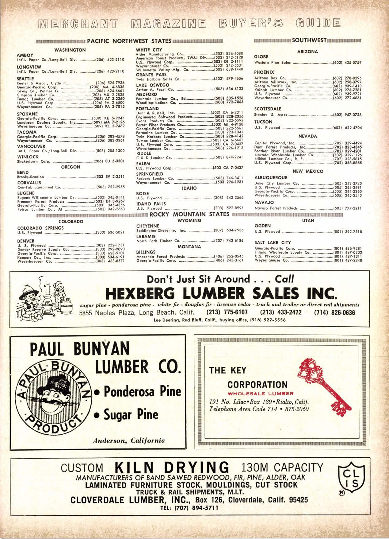 PORI1AND Dont & Rusrell, Inc. .....-..------..-.....(503) CA 6'2311 Ensinorcd solrwcod Prcduct3---lt0!l ??q.?9{q Evqns Prodvcb Co. .----------.----.-----.-.-.-.(5031 222'5592 Forut Fib.r Producb Cc*-.-..-.(5031 Ml 4'9158 G@rsio.Pqclfic Corp. ...--..--..-...............(503) 222-5561 Poromino lumber co. -.(503) 223-1341 Twin Hqrbon tumbn co.-.-*--.-...--..15031 228'1112 Tumoc Lumber Co............-..--------..----..--(503) CA 6'6661 U.S. Plywood Corp. ...-............-..-.........(503) CA 7'0137 Weyerhoeuser Co. .---........---...--......-...-.-.---(5031 226'l 21 3 RIDDLE C & D f-umber co. -...--.-......' ..---.-..--...--..-l5o3l 871-221l SATEM U.S. Pfywood Cotp, ...-....-.-*......--..(503 CA 7'0437 SPRINGFIElD Rosboro Lumber Co. ..--.......-..-.-..-.......-....(503J 246-841 I Wcyolhqcvrct Co. ---..-..-..--.......(503 226'1231 IDAHO BOISE U.S. Plywood ............-.(208) 312'3566 tDAllo FAtts U'5. Plvwood ......-----..-(2081 522-8991 ROCKY MOUNTAIN STATES WYOMING CHEYENNE Boddinston-Chey€nne, Inc. ...-.----.---.......(3071 631-7936 TARA'IAIE North Pcrk Timbcr Co. .....-....-...............(3O71 712-6186 MONTANA BttuNG9 Anocondo For.tl Producb ...-..-....---...-...(,1061 252-0515 G@rgio.Pqclflc Corp. ...--.-....--..-.-............(406) 215-31 61 ARIZONA GTOBE W.rfcrn Pine Soler .---...........-...--.-..-..------(6021 125-57 59 PHOENIX Arlzond Box Co. .-.-..........................-...-..-(6021 27 8-829 5 Arizonq t|llllwcf k, Inc. ...--................-.....(6021 258-3797 Gorslo-Pocific Co. ...-....-................-..--(6021 939.141 3 Koibqb Lumber Co. .--------...-...-.----.----------{6021 273-7281 U.S. Plywood ....-..-.-...-16021 939-9721 Weyerhoeurer Co. .---.........--.........-.-----..-.-..16021 272-6861 SCOTTSDAIE Stqnl.y & Arroc....-.-..-------........-.............(6021 917-0728 TUCSON U.S. Pfywood ..............(6021 622-1701 NEVADA Copitof Plywood. Inc, --.--.------..---.--...17021 329.1191 Donf Forcrl Producft, ltrc.----..-..-...17021 323-4315 Fothcr llvor lunbrr Co.---*.-.---.-(7021 329-1201 Nevodo Wholesql. lumber Co. ...........-..(7021 329-1126 NikkEl LumbEr Co., R. F. -.............-:...-...(702' 323-5815 U.S. Plywood farp. .-..-....--...-..*...-...17021 358-8855 NEW '\AEXICO ATBUOUEROUE DukE Cily Iumber Co. .......-----.-------.-....-(5051 213-3725 U.S. Plywood -.............(505) 344-3491 Georsio-Pocific Corp. .---------....-----.-.-..(505) 311-2365 Weyerhceuser Co. ..--..-.--.............---.-.-.-.--..-(5051 315.2545 NAVAJO Novoio Foresf Producl. .....-........-...----------.-l5O51 777 -221 | UIAH OGDEN U.S, Pfiwood .:......-...-...(801) 392.7518 SAIT TAKE CITY Gcorgio.Pocific Corp. ----------.............(801 I 186-9281 Inlqnd Wholerolc Supply Co. ..........-.......(80ll 1187-0303 U.S. Pfywmd .-------.(801) 187-1311 Weycrhoauscr Co. .........---...-.....--...-.........-(801 ) 187-2218 Don't Just Sir Around . . . Cqll HEXBERG LUffIBER SATES INC. sugar pine - ponirerosd pine - white fir - douglas fir - incense ceilar - truck and trailer or d,irect rail ahipmcnn 5855 Naples Plaza, Long Beach, Calif. (213) 775-6107 (213) 433-2412 (714) 826-0636 Lee Deering, Red Blufi, Colif., buying ofice. 19l6f 527-5556 PAUL BUNYAN TUMBER CO. o Ponderosa Pine o Sugu Pine Anderson, Calitornia THE KEY CORPORATION WHOLE!'ALE LUMBER 19 I No. Lll,ac. Box 189. Rialn, Calil. Telephone Area Code 714 . 875-2060 CUSTOM KILN DRYING l3OMCAPACITY MANUFACTURERS OF EAND SAWED REDWOOD, F/lR, PINE, ALDER, OAK LAM r N ArE o r YIJ.|JIT R^lrt3$|[,"LP#lt"i N G s, c ur sro c K CLOVERDALE LUMBE& l!!-G., 911_1?s, Cloverdale, Calif. 95425 TEk (702 8%-57rr