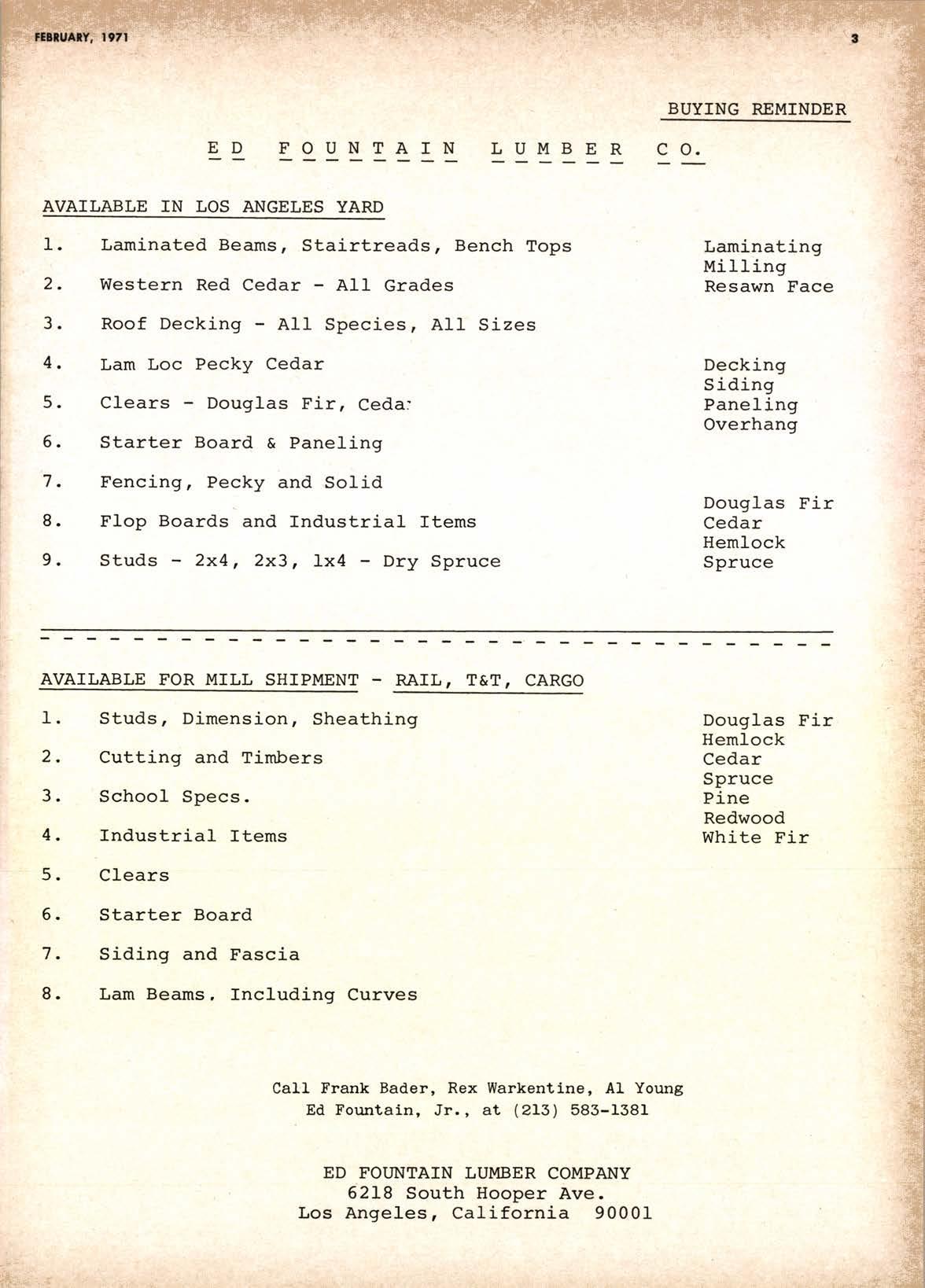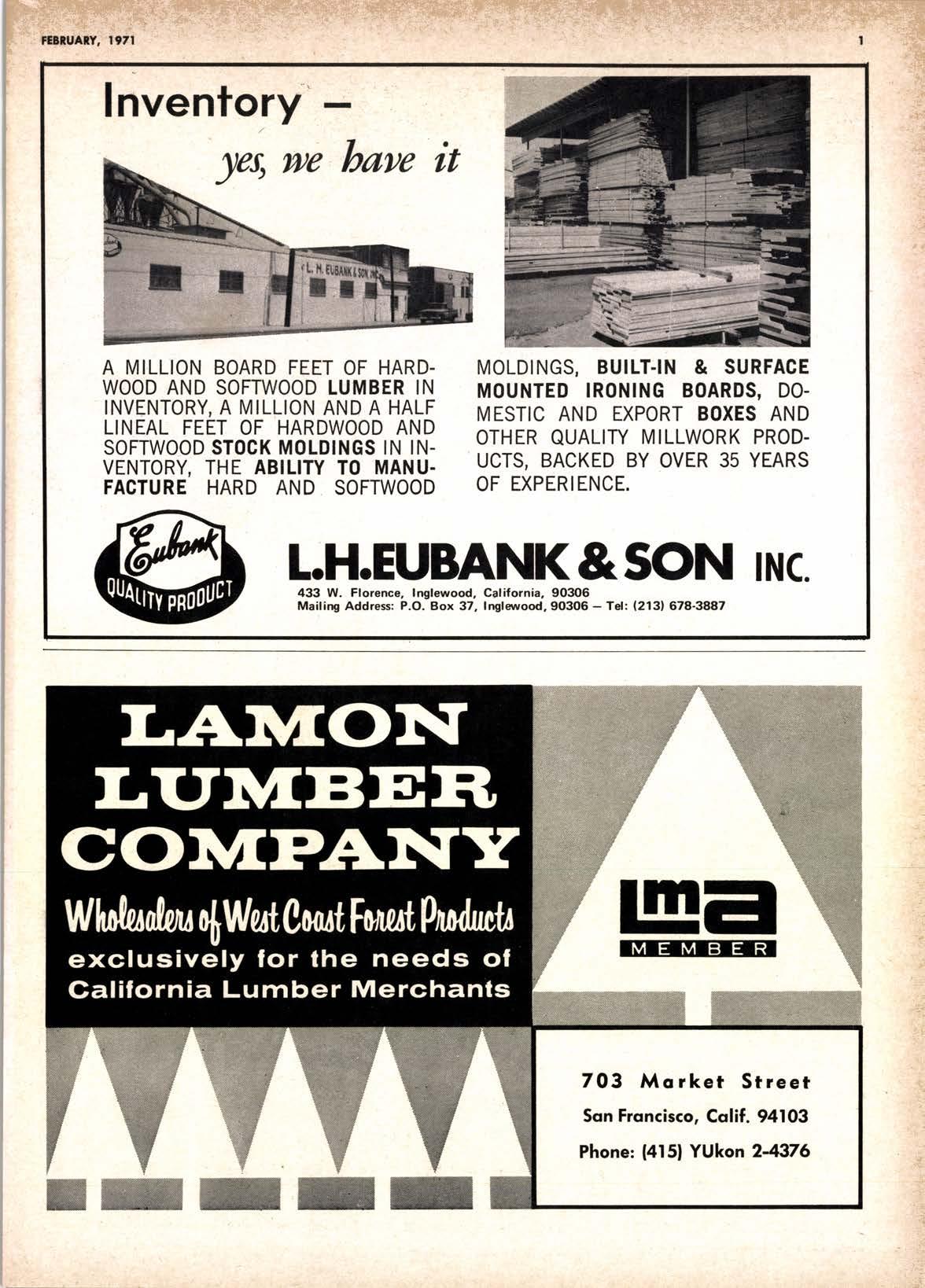 At PETRCE CO. -...-...........-........._......_.....--....._.._- r5 AA,TERICAN FOREST PRODUCTS CORP. ......COVER I ARCATA REDWOOD CO. ...............-.....-......---....--.. 9 BEL-AtR DOOR CO. ............................................20.21 BEVERTY MANUFACTURTNG CO. ...........:-...._......-_ 37 coNNoR tur BER sAtES .......,..-,................--........ 26 CRANE MtrrS _........................... 23 cRYSTAt f.AMp pARrS ....._........".............--..--...-.-.- 29 DANT & nUSSElr 3l DEFT. lNC. --._._._.__._..........._ 29 DOOTEY & CO. _......_...-_..__-.....,...........-.._...........,- 23 ESSTEY & SON, D. C, --.......... 26 ECKSTROM PT.YWOOD CORP. .-...-..-.......----....... 22 EUBANK & SON, t. H. ........._ I FOUNTAIN TUABER CO., ED ..........-..-.................. 3 FREEMAN & CO,, STEpHEN G. ........-.................-. 28 FREMONT TOREST PRODUCTS ................_.......-......- r7 G & R IUMBER CO. ....._.._....._,...........-.................. 40 GAf.tE+fER HARDWOOD CO. .............._....,....-..__., 1 HEXBERG TUMBER SALES .-.........-.......................... 40 HOEBS HAt t TUMBER CO., tNC. ....--.....-.....-........ 27 HOLMES tUl^BER CO., FRED C. ........-..............:..-. 3l HUFF TUMBER CO. ..........._.................................-... t9 HUNTER WOODWORKS, tNC. ....._,_....._.......-..._.._ tl rNr.AND tUMEER CO. ...........-..._.............COVER ill KELLEHER T UMBER SATES ........._-..--._.--.-...-,... 37 KEY CORP, .....-..........................22 IAMON T.UMBER CO. .........-.......-...-.........-.....-..-.. I tOOP LU ,tBER & Mll.L CO. ...---...-..-.----.-... 39 POtY DESTGN, rNC. ....--...-.-.-...._-............-.-....--.... t3 MAPTE BROS. ...........-..........-..- t9 MARQUART-WO|.FE TUMBER CO. .....-...-............-. 30 MUTUAT AOUtDtNG & tUMSER CO. ........---..... 25 NICOLET OF CALIFORNIA ................-....-..-........ 2/t PAN-ASfATtC TRADTNG @. -......-....-..-......-_-..-.-_ 2 PAUf. BUNYAN f-Ut BER CO. -............-....-------..-.--. 27 PH|ltPS tUI BER SATES .....-....-...---.----...... 40 ROf.ANDO tUl,tBER CO. ....-.-.-. l7 souTH 8AY REDWOOD CO. .........-...-.-...,....,......_. 30 srRArT DOOR & PT.YWOOD ...............-.-..-COVEI tV suN tul BER co. .......................--.....-.....-......-..-..-.. t5 MApr.E BROs. .,..........._............. t9 \MESTERN ptNE SUPptY CO. -........."...-................_ 35 wEsT RANGE CORP. .........--.-..-.........._--.......-........ 39 wESTERN WOOD PRODUCTS ASSN. ..........-...-..- 5