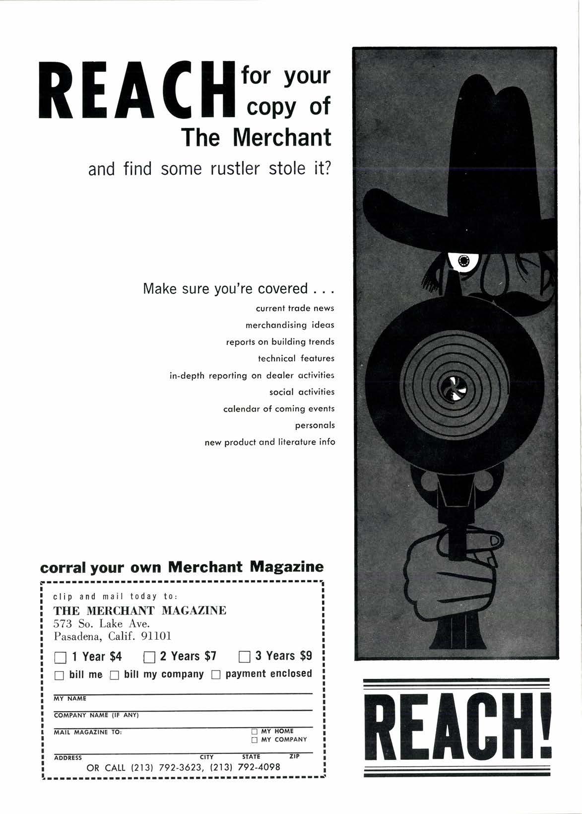 Merchant and find some rustler stole it? Make sure you're covered . . current trqde news merchondising ideos reports on building trends technicol feotures in-depth reporting on deqler octivities sociol octivities colendqr of coming events personols new producl ond literolure info corral your own Merchant Magazine I clip and mail today to: THE MERCHANT MAGAZINE 573 So. Lake Ave. Pasadena, Calif. 91101 [ 1 Year $4 ! 2 Years $7 ! 3 Years $9 i n bill me n bill my company a payment enclosed : MY NAME c6MPANY intiF(lF ANY) MAir-MAGETNEio: E MY HOME [] MY COMPANY I AEDFESS CITY STATE I oR cALL t2t3r 792-3623, 1213t 792-4098 I I ! I ! I I I I REAO]|!
