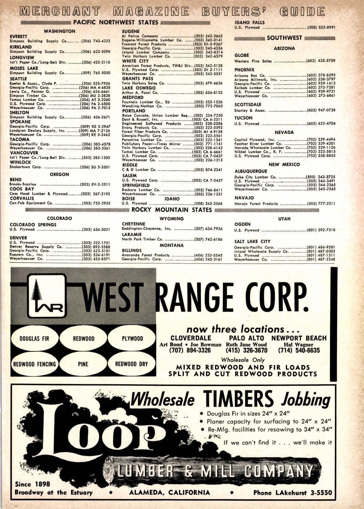 631-7936 TARA'IAIE North Pqrk Timbor Co. ---...---..------.....---(3071 712-6186 iAONTANA BIILINGS Anacondo Fdst Producit ------.-----.--..---(,{06) 252-0515 G@rsio-Pocific Corp. ----..-------.--.--.----.-{/t06) 2,15-3t61 IDAHO T.A[3 U.S. ?lywood ililililulililuilrM||lllillmru souTHwEsT ilmlmmuflmml[u AnlzoNA GI.OBE W6tdn Pin. Solq .---..------.---..-------(6021 125'5759 PHOENIX Arizono !ox Co. --..--..-.---.-...-.-----.---.-(6021 278'8295 Arirono i^if lwork, nc. .....----.......-...-.-16O2't 258'3797 Gorgio.Pocific Co. .......-.-...---..-----...---(5021 939-1413 Kqibob f,unbcr Co. .--.-..---.---....-.---...-.(602) 273-7281 U.S. Pfywood -.--.--.(602) 939-9721 Wcyerho.ur.r Co. -.-........-.-.-..............-(602) 272'6861 SCOTT5DALE Stonfsy & Arcc, .....-........-............-..-(6021 917 -O728 TUCSON U,S. Plywood --........(6021 622-17U NEVADA Cqpitol Pf ywood, Inc. .-----.------.....17021 329 -1191 tqther Riv.r [unbr Co. --..------.....---.-l702l 329-1201 Novodq whol!rcla Lumbcr Co. ............(7021 329'1126 Nikkol Lumbar Co., R. F. ..-..---...-..-....(702) 323-5815 U.5. Pfvwood Corp. ----.--.-.-.------lr02l 358-8855 NEW MEXICO ATBUQUERQUE Dckc City lunba Co. -..---------.--(5051 213-3725 U.S. Pfywood ..........(5051 3{,1-3191 Gorgio-Pocific Corp, .-..........----.----..--.(5051 311-2365 Wcycrhqeursr Co. .---...............-....---...(505) 315-2515 NAVAJO Novoio Forcst Prodsclt .-.-..----..------.-..--(5051 777-221 | UIAH OGDEN U.S. Pfywood .......-..(801) 392-7518 SAIT IAKE CITY Gorsio-Pocific Corp. ---..-..-----....------(801 l 186-9281 Inlond Wholcrqls Supply Cp, .........-..--(8011 487-0303 U.S. Plywood -.--.--..-(8011,187-13ll Wsyerhocurer Co. ---...------.--.--..----...-----(801 I 18r-2218 NGE CORP now three locofions . CLOVERDALE PALO ALTO NEWPORT BEACH Arf Bond . foe Bowman Ruth lane Wood IIal Wagner (707) 894-3326 (415) 32S3670 0r4) 54&6dt5 Wholesole Only MIXED R,EDWOOD AND FIR, LOADS SPLIT AND CUT REDWOOD PR,ODUCTS le