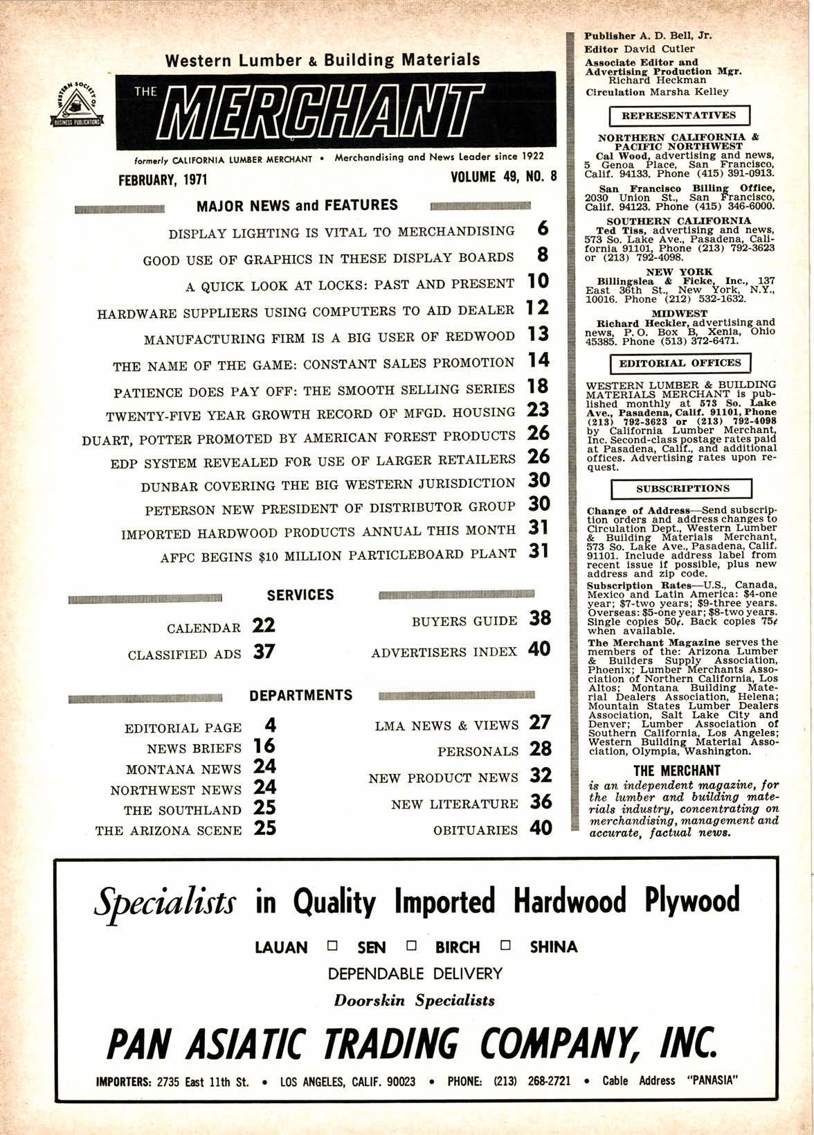 Western Lumber a Building Materials fornrrly CAI|FORNIA tuilaEt ^lERCflANT . Mcrchqndising ond Ncwr teodcr rlncc 1922 FEBRUARY, 1971 Y0tuME 49, ll0. I umtltmilffiffififiuntllrttlilltutflln MAJOR NEWS and FEATURES rulilllllilmrfrr[llffillfilnlllllllllillllllffilll DISPLAY LIGHTING IS VITAL TO MERCHANDISING 5 GOOD USE OF GRAPHICS IN THESE DISPLAY BOARDS 8 A. QUICK LOOK AT LOCKS: PAST AND PRESENT l0 HARDWARE SUPPLIERS USING COMPUTEBS TO AID DEALER 12 MANUFACTUR,ING FIRM IS A BIG USER OF REDWOOD T3 THE NAME OF THE GAME: CONSTANT SALES PROMOTION 14 PATIENCE DOES PAY OFF: THE SMOOTH SELLING SERIES 18 TWENTY.FIVE YEAR GROWTH RECOR,D OF. MFGD. HOUSING 23 DUART, POTTER PROMOTED BY AMERICAN FOREST PRODUCTS 26 EDP SYSTEM REVEALED FOR USE OF LARGER RETAILERS 26 DUNBAB COVERING TIIE BIG WESTERN JURISDICTION 30 PETER,SON NEW P&ESIDENT OF DISTRIBUTOR GROUP 30 IMPORTED IIARDWOOD PRODUCTS ANNUAL THIS MONTH 3I AFPC BEGINS $10 MILLION PARTICLEBOARD PLANT 3I CALENDAR CLASSIFIED ADS EDITORIAL PAGE NEWS BRIEFS MONTANA NEWS NORTHWEST NEWS THE SOUTIILAND THE AR,IZONA SCENE SERVICES 22 37 DEPARTMENTS BUYERS GUIDE 38 ADVER,TISERS INDEX 40 LMA NEWS & VIEWS PERSONALS NEW PRODUCT NEWS NEW LITERATURE OBITUAR,IDS 27 28 32 36 40 4 16 24 A 25 25 rl'" :\. ;ld,,' Specialists in Quality lmported Hardwood Plywood TAUANtrSENDBIRCHDSHINA DEPENDABLE DELIVERY Doorskin Specialists PAil ASIAflC 1RADI|IG C0lrlPANV INC. llrfP0RTERS: 2735 EGt llh St. . [0S Al{GELEli, CAtlF. 90m3 . PH01{E t2l3l 2*2m o Cable lddrsss "PAllASlA"