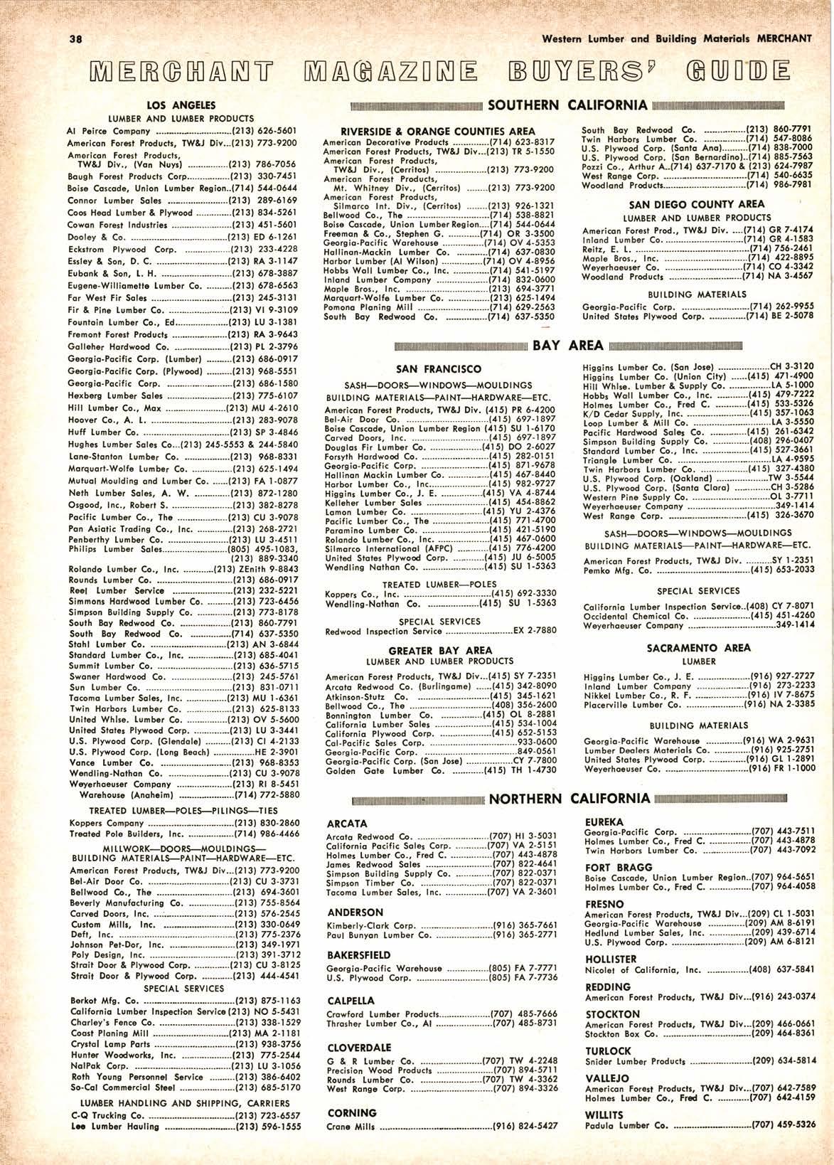 2-5151 Hofncr Lumbcr Co., Frcd C. ..-......---...-(707) 113-1878 Jqmc Rcdwood Sqle5 --...-.....-.....-. --..--l7o7l 822-1611 Simpton Buifding Supply Co. ---..--.......(7071 822-0371 Simpron Timber Co. .--.--.-.--...---.... --.---l7i7l 822-037 | Tocomq Lumber Sales, Inc. ---.............(7071 VA 2-3601 ANDERSON Kimborf y-Clork Corp. ..--.--..........-..-....-.(91 6) 365-7 661 Pouf Bunyon Lumber Co. .---.-.....---.-..-...(9161 365-2771 BAKENSFIETD Gcorgio-Pocific Worehourc ..--...--....-.-(8051 FA 7-7771 U.S. Pfyw@d Corp. .....-..--.........-.-.-.-(805) tA7-7736 CAtPEItA Cwford lumber Produclr.---.......----. -..17071 18r-7666 fhroshcr Lumbcr Co., Al .......---------.-----(7071 185-8731 CLOVENDALE G & R lumbcr C,o. .......-...............17071 fw 1'2218 Prccision Wood Produclr ....-.------....---(7071 891-571 1 Roundr Lumbcr Co. ..-..-....--.-...---...17071 fW 1-3362 Wat Ronsc Corp. .....,.......-..................(707'l 891-3326 CORN!NG Gon. ,rtillt ..............(9161 821-5127 EUREI(A Georsio-Pqciffc Corp. ..-..--.-.-.-...........-17071 1,t3-7511 Hofme Lumbcr Co., Fred C. .----.-.......(7021 113-1874 Twin Hqrbon Lumbqr Co. ----...-..-.-....(707) 1,1,3'7092 FORT BRAGG Boirc Corcode, Union Lumbcr Rcglon..(7071 964-5651 Hofmer Lumbcr Co., Frcd C. .---.....-....-l707l 964'4058 FRESNO Ancricon Forest Produclr, TW&J Div'--(2091 Cl l'5031 G€orsiq.Pqcific Wqrehourc ..-...........(2091 Af 8-6191 Hcdf und tumbqr Sol$. lnc' .--.----....--.-{209} 1X9'671 1 U.S. Plywood Corp. ----.--...........-..-(209) Al 6'8121 HOLtlSIER Nicotrt of Colifornio, Inc. ..--....-.--(4081 637-5841 IEDDING Americon Fmit Produclt, TW&J Div...(9161 213'0371 SIOCKTON Amcricon Forgt Ptoductt, lW&J Div..-(2091 466.0661 Stockton 8ox Co. .....--.........-....-.....-..-12091 46,4-8361 IURTOCK Snider tumbor Prodgclr .....-...............-.l209l 634'5814 VA]IEJO Am.ricon Fqctl Prcductt, tW&J Dlv...(ZQZl 6,|-2'7589 Holma Lunbr Co., Fnd C. ............(7071 6121159 willtI5 poduto tunbcr co. ....._-...__... -_.....170:ll 159.5325