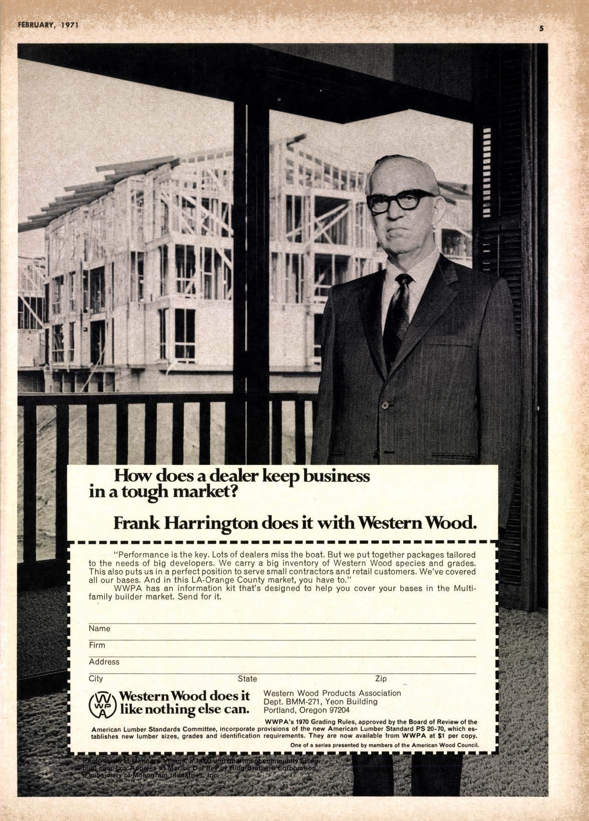 "Pe'Io,rra^ceist^ .ey,Lotsof dealersmisslhcboat.ButweputtogoIh^.packago5 lailored to the needs of big developers. We carry a big inventory of Western V/ood species and grades. This a so puts us in a perfect position to serve small contractors and retail customers. We've covered all our bases. And in this LA-Orange County market, you have to," WWPA has an information kit that's des gned to he p you cover your bases in the Multifamily builder market. Send for it,