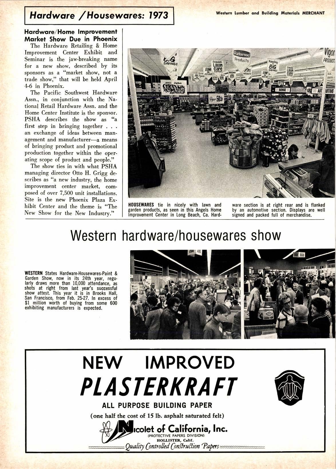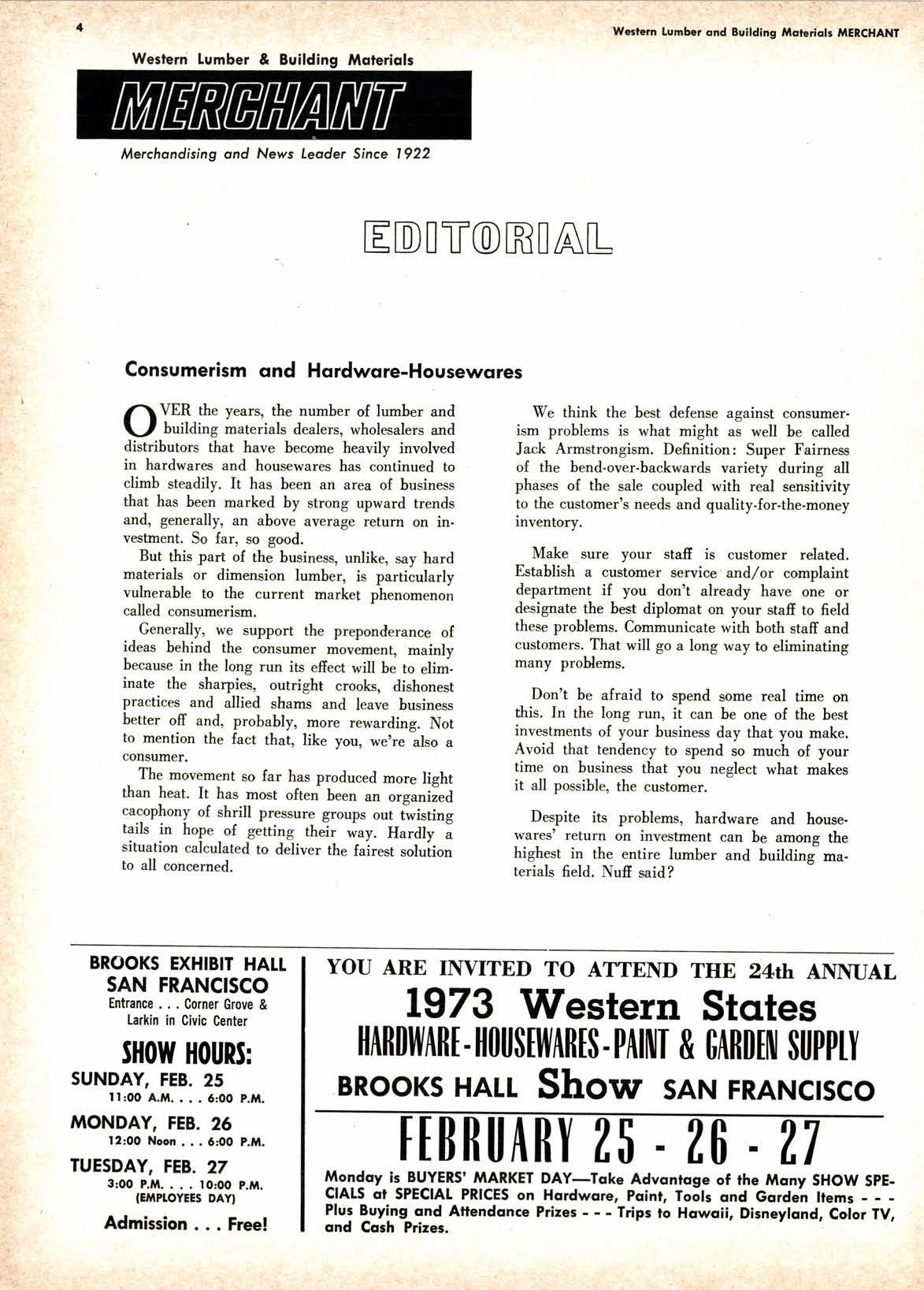i- t;'0. Western Lumber a Building Materials fornrrly CAI|FOINIA LUI lER I ERCHANT Mcrchondiring ond Ncws lcsder rince 1922 FEBRUARY 1973 Y||TUME 5I, II(l. 8 m|liillllllllllllllllllllllllllllllllllllllllllltlll MAJ0R NEWS and FEATURES mitntuinmtminnmtmi0iiiiitr AN IN-DEPTH LOOK AT A IIARDWARE SUCCESS STORY 5