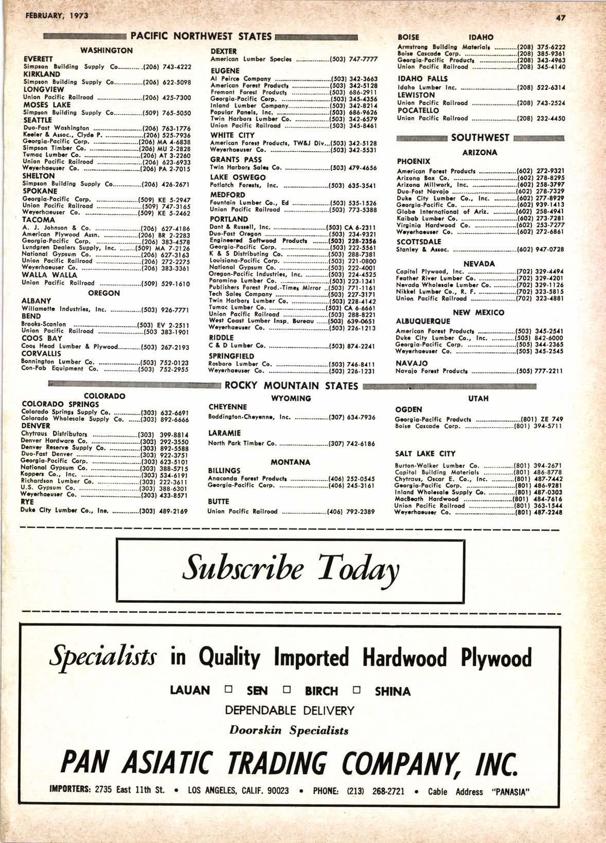 Rorwr Suppty Go. ................ir0gi 892.558s Duo-Forr D.nv.r -..-ifOgi fZZ-fZOl 9rqrsic-Poctflc Gorp. ..-.-................-...isOf t 623-ttol Noflorct _cyFum C., ..........._......_....-(3ogi 3S8-52t5 f,oppm Co., lrc. ...-....-....-...._...-...(303) 531-6191 liclrordrn tunb* Go. -_-___.___.-.(bOSi ZzZ-SCti -U.S. Gyprun co. ..----......--..-.-....-.-...-..isoai 388.630r Wryrrhoouc Co. -.._-..._...............-...(30il 433-S5tl IYE Duto Clty lonb.? Cc., lna .....-...--.13031 tg9-216? ;j .i: ::ll Subscribe Tfuy Specialists in Quality lmported Hardwood Plywood IAUANtrST{OIIRCHtrSHINA DEPENDABLE DELIVERY Doorskin Specialhtt PAN ASIATIC TRADING COInIPANY, INC. ft?0ll[t3: 27:15 Elst llh St . LOS AI{GELES, CALIF. 90023 Ptl0fl& Qt3l 2*2721 Cabte Addrcss "pAItAStA" .t; :. ''i ;.r';.1