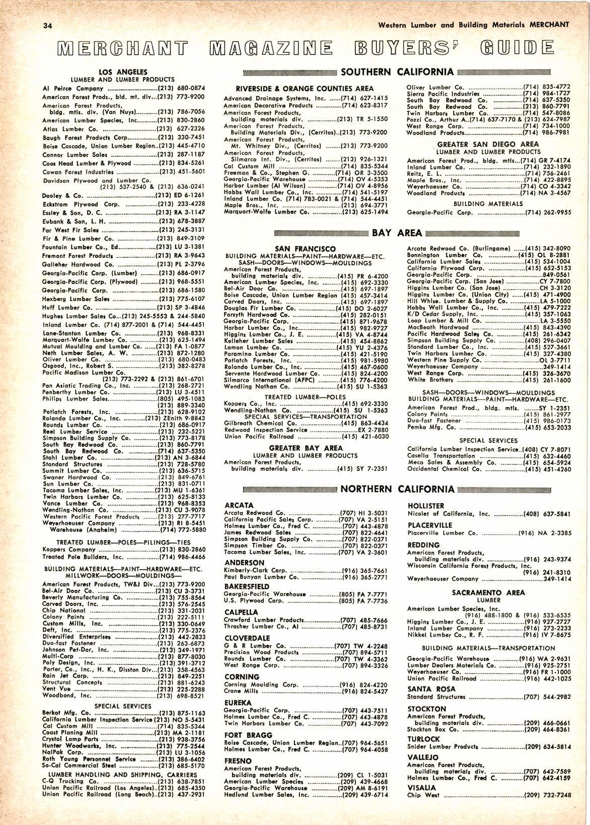 LUl,tBER AND IUMSER PRODUCTS Amcricon forcl Product!, bulldlng notcrloh dlv. .-.---.---.---..(4151 SY 7-2351 Arcota R.dwood Co. (Burlingqmc) .---.-(4151 342-8090 Sonlnslon lumbc Co. -...----...-.--(4151 Ol 8-2881 Collfornic Iumbcr Solcr ------..-....--...----(/al5l 534-1004 Crlifornio Plywod Corp. -.-.....--.........-(41 5) 652-5153 Gcorsio-Pocific 6rp. -......-....--...-...---.-.---.---..849-0561 Gcorgic.Pqcifls Corp. (Son Jor) .---.-----------..CY 7-7800 Hiesins lumbcr Co. (Son Joro] .----.----------.--.CH 3-3120 Hisglnr lumbrr Co. (Unlon Clry) .---..(4151 471-19OO Hill Wh|s. lumbor & Supply Co. -.-.............1A 5-l000 Hobbr Woll lunbcr Co., Inc. ...-.......(4151 179-7222 K./D Ccdor Supply, Inc. ..............-.......-.(/al 51 357.1063 lop Lumbcr & ilill Co. LA 3-5550 Alo<Booth Hordwood .-----.-(415) 8,13-4390 Poclflc Hordrcod Solt Co. ..............(4151 261-6312 Sinpron Euildlng Supply Co. .--....---.--.1/a081 296-010l Slqndord Lumbrr Co., Inc. .........----...(4151 527-3661 Twln Horbor. Lumbor Co. -------.-.....----(,ll51 327-1380 Wrstcrn Pinc Supply Co. OL 3-7rll Wcycrhocurrr Conpony .....-...-.-......-........-..--..349-lal/a W6t Rongc Corp. -......-..........-.-.....-.lal51 32646m Whitc Brofhqr .....-lal5l 261-1600 sASH-DOORS-Wt NDOWS-I{OU LDt NGS BUI I.DING MATERIAI,'_PAINT-+IARDWARE_EIC. Amcricon Forcl Prod., bldg, ntb. ........SY l-2351 Cofony Points --.....--.(415) 861"2977 Duo.foet tq5lqor ..(,1151 986-0173 Pemko Mfs. Co. -..---.-.-...............-.......-.(41 5l 653.2033 sPECtAt SERVTCES Colifornio lumbrr lmplction Scryia--(4081 CI 7-8071 Cq$llo Tronsportolion .------------- --111 51 632-460 lrloe Sqle & Arsmbly Co. -----.--.-(415) 651-5921 Occidoniol Chcmicql Co. .--.....-.-..........-(41 5l 151 -1260 NORTHERN CATIFORNIA ARCATA Arcoto Rcdwood Cr. ...-..---...--......-...--..(707) Hl 3-5031 Colifornio Pocific Solct Corp. ...-...-----(707) VA 2-5151 Holmq Lumbor Co., Frcd C. .......-..--.-..(7071 U3-1878 Jqmc Ridwood 5016 ----..---------.-.-..-.-l70irl 822.aU1 Simpto Building Supply Co. .-........-..17071 822.0371 ANDENSON Klmbcrly.Clork Corp. .--...--.-.-.--...-.-.-...--(91 6l 365.7661 Pouf lunyon lumbcr Co. -----.---...--.-.-----(91 61 365.2771 BAKENSFIEID Gccalo-Pocific Worchour --------..-..---l8O5l lA 7 -7771 U,5, Pfywod 6rp. ---------.....-...(8051 FA7-7736 CALPETIA Cwford Lunbor Prodccb---..-............--17071 185-7 666 Threrhor lumbcr Co., Al ..-.........--......(7O7t 185-8731