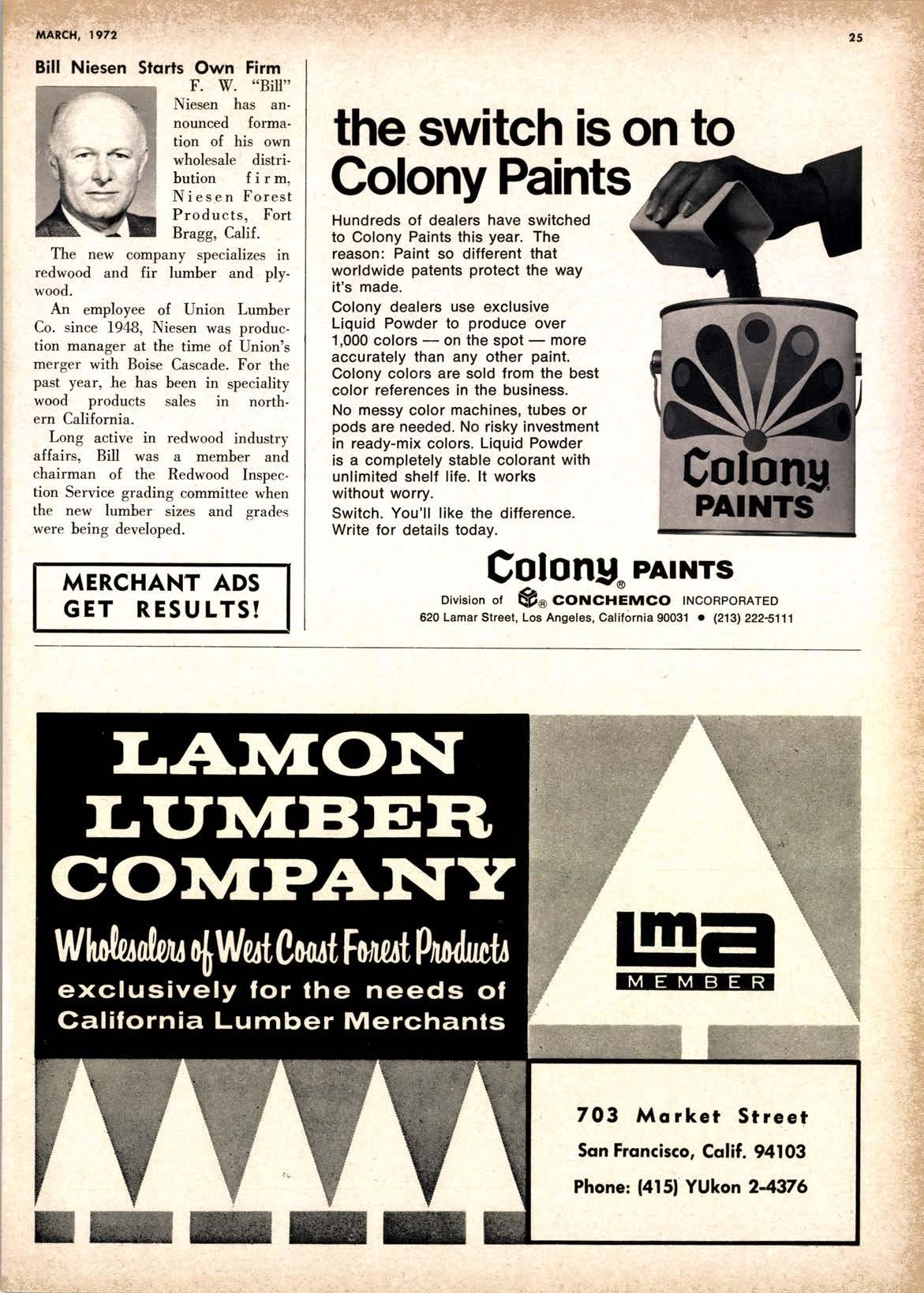 Ar. pErRcE co. .........-....-........---.--...............--..-....... 9 AMERICAN TOREST PRODUCTS CORP.. BUIDING MATERTAT.S DrV. ....-.-.-.........COVER I AT ERTCAN tUtiEER SPECTES ..........-.............20 & 2l BEr.-ArR DOOR CO. ...-........-.....................-.....r3 & 33 EERKOT MANUFACTURTNG CO. ..-...-,...-............. 36 BEVERTY l{ANUFACTURTNG CO. ...,........-............. 3l cAt cusToM Mil.t ........................--.........--..,...-.-.. 33 CATIFORNIA I.UMBER INSPECTION SERVICE.......- 35 cAsEil.A TRANSPORTATTON CO. ._.,_...............-... 35 COI.ONY PAINTS tNtAND LUMBER CO. ............-...-"..............COVER lll JOHNSON PET-DOR ....-..-.....-................-............-... 3l TAMON t UMSER CO. ......,-.-...-....-.,-......-.............--.- 25 LOOP TUMBER & l,tll.t CO. .--.-........,,...-................ 32 MARTf NGATE PAPER CO. ......--...-...-...-....-......... 27 T ARQUART-WOf,FE f,Ul,lBER CO. -.-....-.................. 21 t uTuAt Aouf.Df NG & tUMBER CO. ......--.....-..-.,. 22 NETH TUAABER sAtES, A. W. -............................... 36 NrcotET oF cAUFORNtA ....-...........-.....-..,.......... 32 oscooD, rNc., R. s. .,.,.-........ 2 pActFfc MADrsoN IUMBER co. ...-.,-.,.-.-...........-. 27 pAN AStATTC TRADTNG CO. ....,,.--,.-.-.,-.-.,..-........ l8 PAUt BUNYAN tUri,tBER CO. .....--....-.-.---....-..-. 29 PENBERTHY LUT BER CO. ................-......-....COVER rl PHTUPS tUMSER SAtE5,...........-.--..--.-..--.,........... 3l PI,ACERVlLtE lUl,tBER CO. ....-..-..........-....-.......-,... 35 POPUTAR PANELS. tNC. I RODMAN |NDUSTnTES ......._..._.. 20 ROf-ANDO tUT BER CO. .,.--..-.. 26 S|ERRA PAC|FTC ......-.....-...........',14 STANDARD STRUCIURES 23 suMMtT f.uA BER CO. ...._..............-.-.--.-...-.....-.._-.-. 1 suN tUMBER CO. .....,.............................-.._..."......_-. t,t TWIN HARBORS IUl,tBER CO. .-.........,--.......-..----. 29 uNloN PACtFIC RATtROAD ...._...-_.....-_....-COVER lV wtscoNstN-cAilFoRNtA FoREST pRoDucrs.-.... t9 WOODBOND, INC. Don't Just Sit Around . . Gall HEXBERG LUffIBER SALES INC. tugar pine - pondetoca pine - whita fir - douglat fit - incente cedat truck and tlrailer or direct tail chipmcnu 5855 Noplcr Plozo, long Bcoch, Colif. {2131 775-6107 l2l3l 433-2172 lTlal 826-0636 tUMBil ONilERT fiom Be*of y' EsPEctAtrY ADAPTABU to cuslomEn IGEDS y' sctENTrFrcAttY DES|GNED FOR AtI. TY'ES OF WORK y' BAtANcEo K'R EASE OF HANDII]{G Let Us Prove This ls lhe Cqrf for You ! Cqll or write for frce brochurc BERI(()I MAilUTAfiURIlIO (OI,IPAIIY THE WORLD'S BEST \^/OOD PRESER\,ATIVES Com9ry with F.d.r.r Sp.citic.tio. fr-W-62 COPPERilATE "250'' lyp. rr, comp. B l(rillrE "9" TyP. il. Cohp. A 11285 Gosr Sl., Sun Volley, Cslif. Phoner 12l3l 875-1163 A.'TV" NETH LUMBER SALES Douglas fir dimension boards & studs ue sb;p o;d Western hemlock dimension boards & studs utater and. roil. Douglas fir, white fir and redwood studs 13111 Ventura Blvd., Studio City, Calif. 91604 r (213) 783.0544 & (213) 872-l2t0 SOUTHERN CALIFORNIA REPRESENTATIVE FOR DANT & RUSSELL. INC.