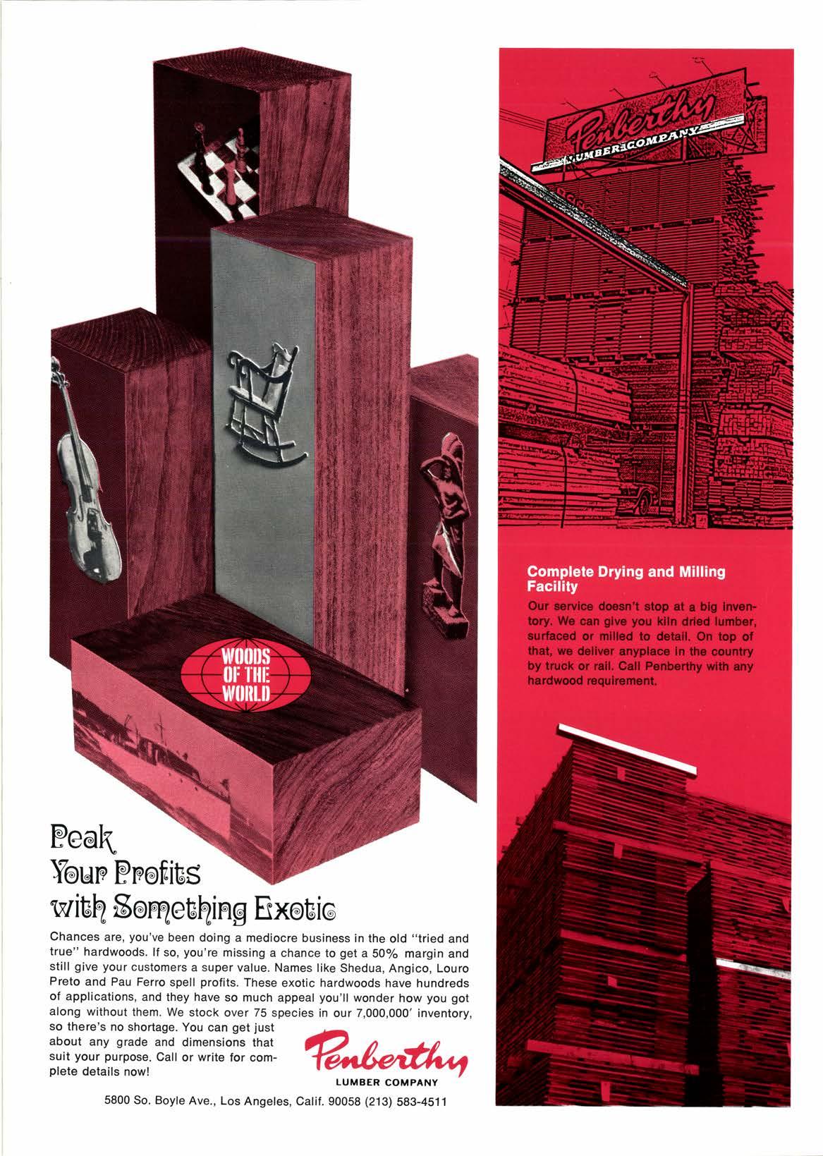 Chances are, you've been doing a mediocre business in the old "tried and true" hardwoods. lf so, you're missing a chance to get a S07o margin and still give your customers a super value. Names like Shedua, Angico, Louro Preto and Pau Ferro spell profits. These exotic hardwoods have hundreds of applications, and they have so much appeal you'll wonder how you got along without them. We stock over 75 species in our 7,000,000' inventory, so there's no shortage. You can get just about any grade and dimensions that suit your purpose. Call or write for complete details now!