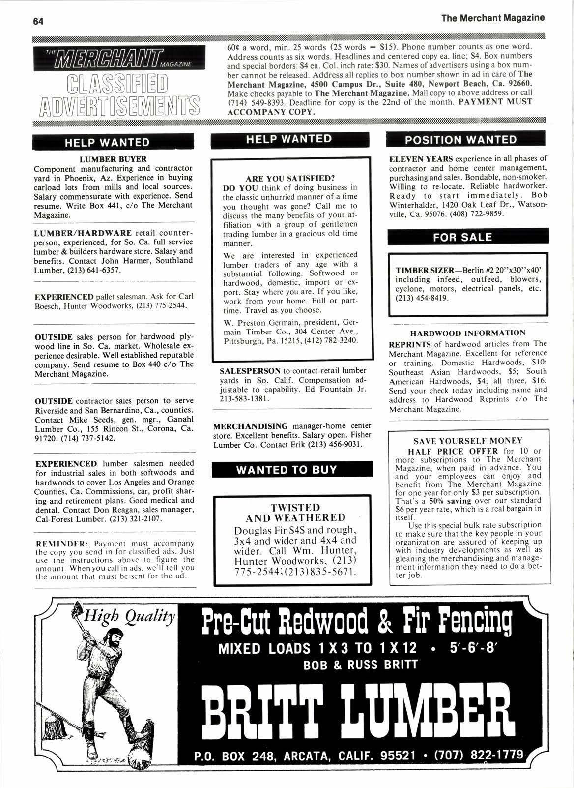 The Merchant Magazine Eugene-lVillrmette ... 67 Fishmen & Associetes, Bill. 5l FloorServiceSupply... 20 Fontrnr Wood Prescrving 60 FrostHardwoodLumbcrComprny.... 6l Furmen Lumber Co.. 42 G&RlumberCo...... 24 Gemini Forest Products 57 i Georgir-Prcific 7 i GreenBook,The.... 53 GriffolynCo.,The... 36 Herbert Lumber Co. . 54 Hill Lumber Co.. Max . 6t i Hirt & Wood Lumber Co. 22 HufflumberCo...... 5 InlandlumberCo..,.. 43 t KellerlumberCo...... 54 Koppers Co., Inc. , Cover II LamonlumberCo..., 32 LeBeck Forest Products 52 Lewis Co., lnc., Palmer G. 39 Little Lake Industries . 60 Mary's River Lumber Co. 33 i Mrsonite Corporadon . Cover I MutuelMoulding&LumberCo. 49 Niesen-WrrdForestProducts 6 Noyo Forest Products. . 55 Osgood, Inc., Robert S. 51 Pacilic Forcst Products, Inc. 44 PsclficlumberCo...., 25-26 PacificMadison LumberCo.. ..,...... 46 Panel-Tex 37 Prramino Lrmber Co. 47 r Philips Lumber Sales 56 l ProductSales .....,.. 4 I P.R.O.D. Wholesale. 41 Publishers Forest Produc'ts 62 f ReddlnglumbcrTransport 4t Redwood Coast Lumber Co. , . 4t Rocklin Forest Products. 23 RolandolumberCo.. 2l Roy Forest Products 21 Sanford-Lussier...... 55 Simpson Building Supply 9 South Bay Forest Products. 31 TriadSystemsCorp.... 13 Twecdy Lumber Co. . 49 Union Fortst Products 35 Unlted Wholesale Lumber Co. Cover IV WeblumberCo...... 41 W€stern Internrtionrl Forest Products 65 Western Wood Preservers Institute Cover III Willamettelndustries.. 50 Winton Sales Co.. 16