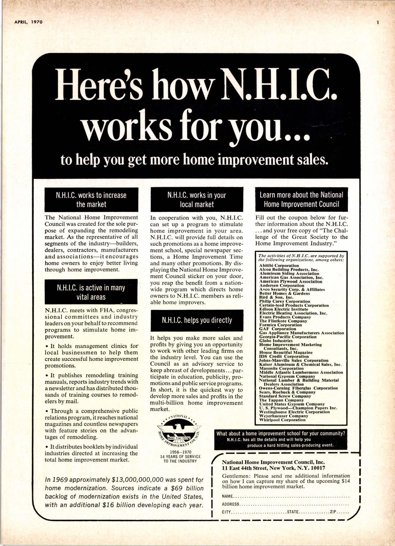 In cooperation with you, N.H.I.C. can set up a program to stimulate home improvement in your area. N.H.I.C. will provide full details on such promotions as a home improvement school, special newspaper sections, a Home Improvement Time and many other promotions. By displaying the National Home Improvement Council sticker on your door, you reap the benefit from a nationwide program which directs home owners to N.H.I.C. members as reliable home improvers.