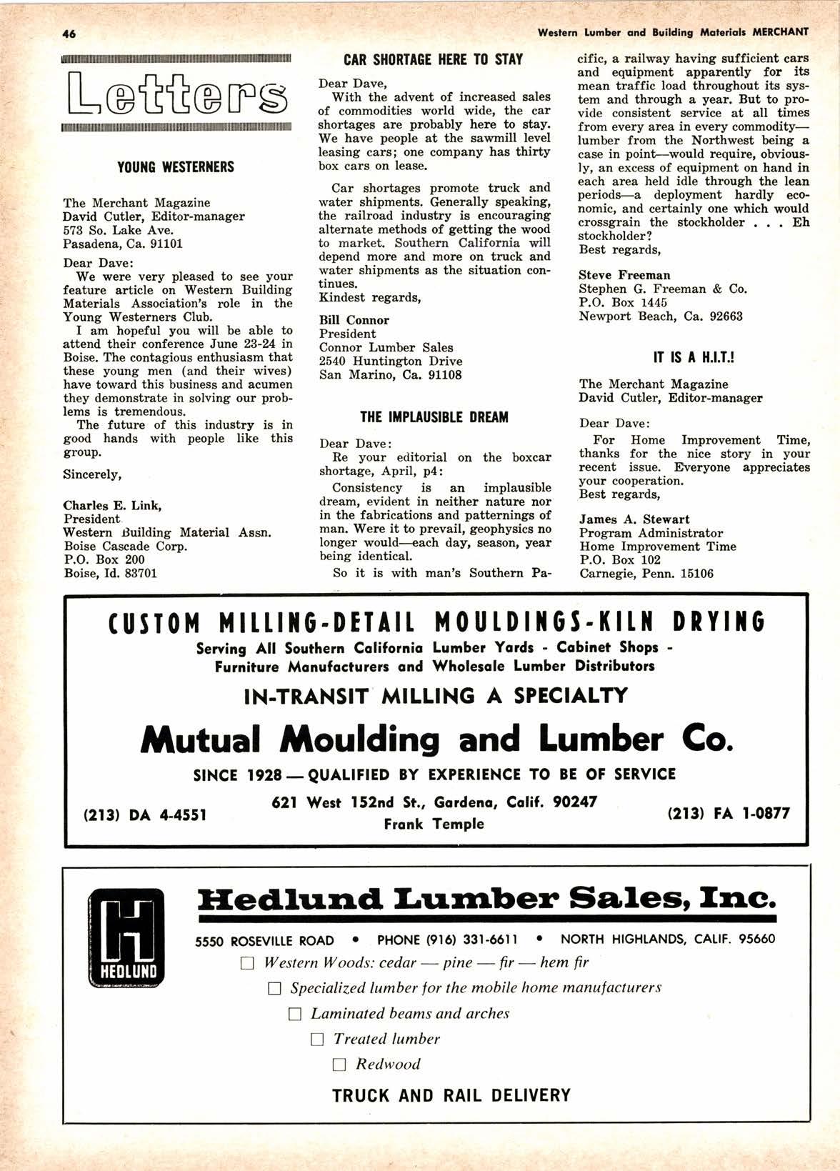 At PTERCE CO. ...-....._.......----._--.._........_.........--.. 29 ATAENICAN FONEST PRODUCIS CORP. BUil.DTNG I ATERTAtS DtV. .---.....-._..-._........... 3 A {ERfCAN tUAfEER SpECtES ---.......--..._..............- 27 ARCATA nEDWOOD CO. ...............-......-.-..._....--..- | BEt.ArR DOOR CO. ..._..-..-..-............._-..............-... 2l BERKOT fiANUFACTUHNG .-.-.......-...........-..-......... al Btco-KNzuA BEVERT.Y MANUFACTURTNG @. .-..........-.........._-. 28 cAsEtrA TRANSPOTTATTON CO. ......-_-....._....... aO c}tYrRAus co., oscAr E. 30 coNNoR tur EER sAlES -..-...-...........-............--.-.. 3l CRANE. Mf rf.S .........-..-..-............ 21 DANI & RUSSEIT ................--.... 32 FSSTEY & SON, D. C. .....-.-........._-._...._.._..__.... 34 EroF HANSSON, lNC. ._.....-...-........-.-.--..._....-...... 50 G & n IUMBER CO. ................-.-.......-........-..-....... 50 HEDf.UND IUMEER CO. ....-....... 16 HEXBERG tUMEER SAIES rNC. ..........-.......".-......... 50 HTGGTNS lUA BER CO. ......-..... n HIGH SIERRA tUMBEn SAIES -.......-.-..-.-....-........... /43 Hf f.f- f.Ul,tBER CO., r,lAX --..--... 21 HOBBS WAtl tUMEER CO. ..--....-.......-....-........... 25 HOTMES IUT BER CO., FRED C. -..........-......-..-.... 28 HOWARD JOHNSON'S ..-..-........ /tl HUFF IUMSER CO. ................-...._............-.............. 3l lNl.AND LUMBER CO. ....--........-...........--......Cover tV Wcrlrrn Lornbcr ond Bulldlng llatcrlob ,$ElCHAil[