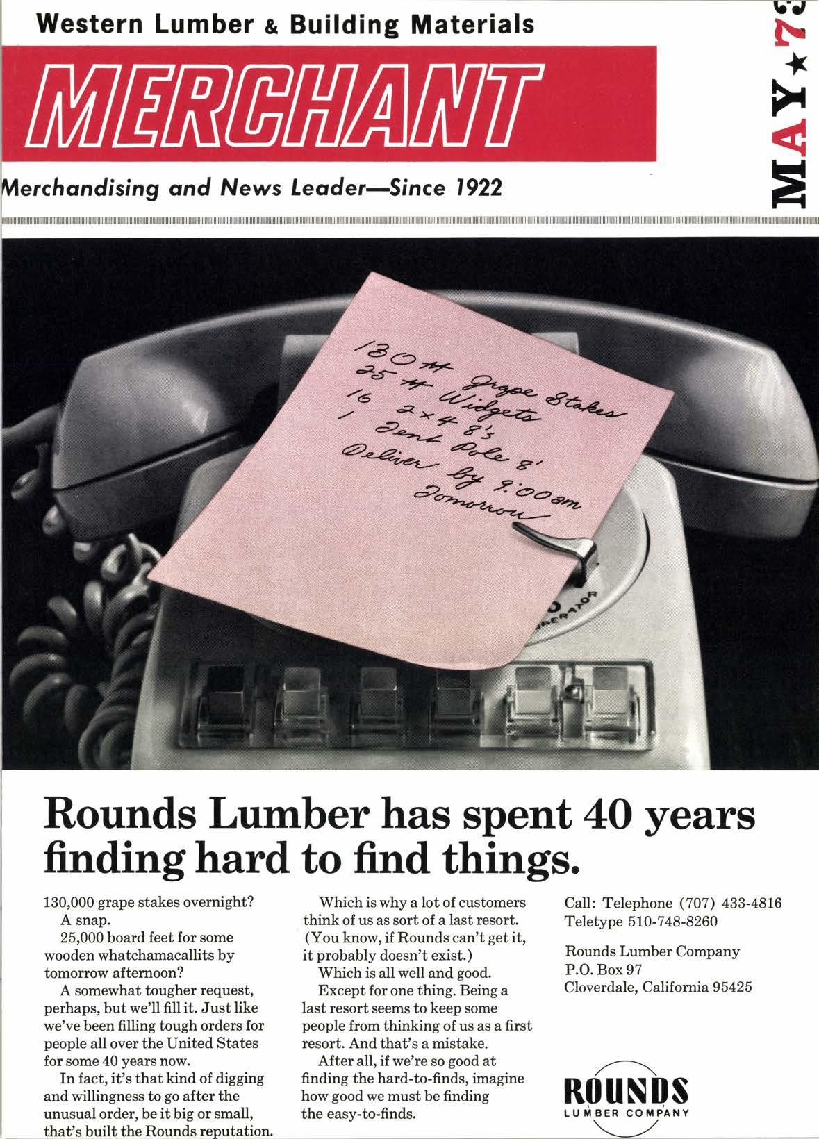 Western Lumber e Building Materials rchondising ond News leoder-Since 1922 rr-J I\ I )r = lti.::l ' iEu :.: |:;: ile Nrt i$ Call: Telephone (707) 433-4816 Teletype 510-748-8260 Rounds Lumber Company P.O. Box97 Cloverdale, California 95425 ROUNIIS LU M BER COTPANY \/