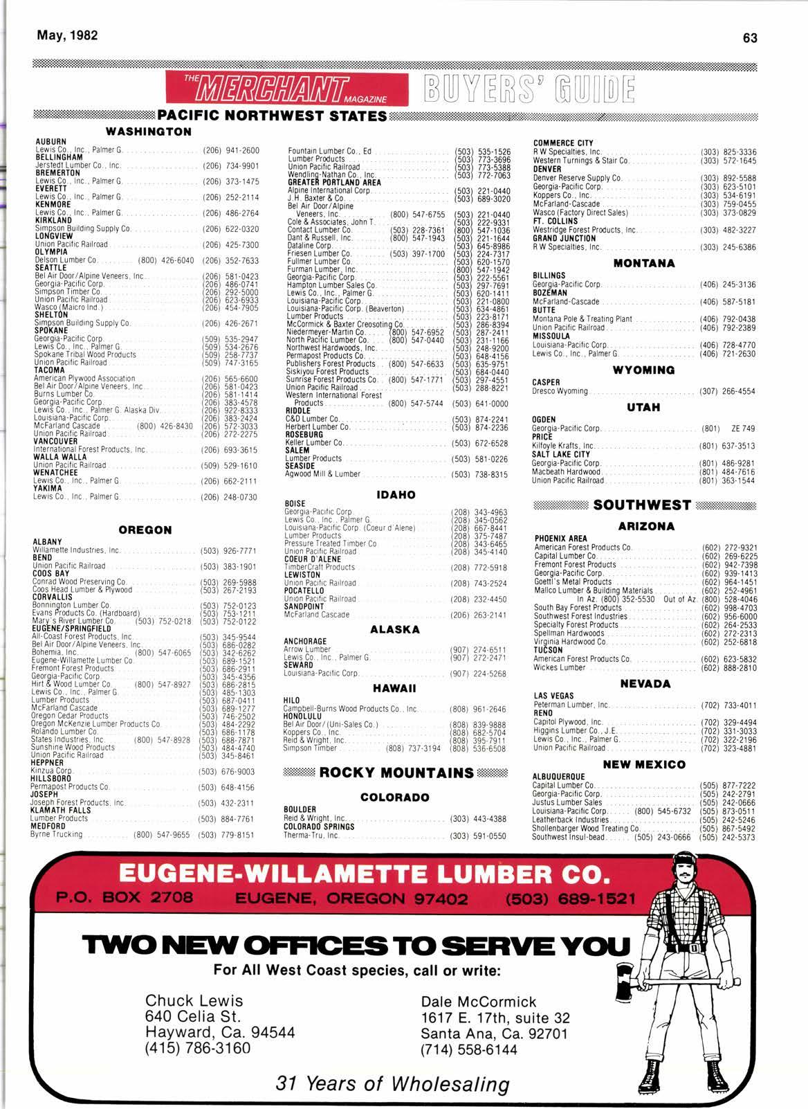UTAH 0G0Er{ Georgia-Paciliccorp. (801) 2E749 PRICE KilloyleKrafts,tnc....... (801) 637-3513 SAI.T I.AKE CITY Georgia-PacificCorp. ......... (801) 486-9281 lvacbeath Hardwood. {801 ) 484-761 6 Union Pacilic Railroad. (801) 363-1544 iiititil!::###:f i.{: s o u T ll w E s T iliih\-$-:.is.iitsi.r ARtZOXI PH(|ET{IX ABEA American Forest Pr0ducts Co. (602\ 272-9321 Capital Lumber C0. (602) 269-6225 Fremonl Foresl Producls (602) 942-7398 Georgia-Pacific Corp. (602) 939-1413 Goettl s Metal Products (602) 964.1451 MallcoLumber&SuildingMaterials....... .. (602) 252-4961 In A2. (800) 352-5530 out or A2. (800) 528.4046 OREGOl' 208) 343-4963 208) 345-0562 208) 667-8441 208) 375-7487 208i 343-6465 208) 345-4140 (808) 961-2646 (808) 839-9888 (808) 682-5704 (808) 395-791 1 (808) s36-6508 (503) 383-1901 (503) 269-5988 (s03) 267-2193 (503) 752-0123 (503) 7s3-1211 1.503) 752-0122 503) 345-9544 503) 686-0282 503) 342-6262 503) 689-1521 503) 686'291 1 503) 345-4356 503) 686-281 s s03) 485-1303 s03) 687-041 1 503) 689-1277 503) 746-2502 503) 484-2292 503) 686-1178 503) 688-7871 (s03) {503) 484-4740 (s03) 345-8461 (503) 676.9003 (503) 648-4156 (503) 432-231 1 (503) 884-7761 (503) 779-8151 (208) 772-5918 1208) 743-2524 1208) 232.4450 1206J 263-2141 752-0218 Soulh BayForestProducts Southwest Forest Industries... Specialty Forest Products... Spellman Hardwoods Viroinia Hardwood Co. TUCS0T{ American ForestProductsCo. Wickes Lumber 1{EYADA rAs VEGAS Pelerman Lumber, Inc.......... REII(l Capilol Plywood, Inc. HigoinsLumberCo.,J.E.... LewisC0., Inc., Pa|merG. Union Pacific Railroad. Inc Bel Air 0oor/Alprne Veneers, Inc. Bohemia, Inc. (800) 547-6065 Euqene-Willamelle Lumber Co. Frehonl Foresl Prooucts (907) 274-651 1 1907) 272-2471 (907) 224-5268 Geotoia-Pacrfic Coro Hrrt & W00d Lunber C0. (8OO) 54i.0927 Lewis Co., Inc , Palmer G Lumber Producls McFarland Cascade 0reqon Cedar Producls 0reo0n lllcKenzre Lunber Products Co Roldndo Lumber Co Slales Induslries, Inc. (800) 547.8928 Sunshine Wooo Products LJnion Pacrlic Rarlroad HEPPNEB Krnzua Corp. HrLrs8080 Permapost Products Co. JOSEPH JoseOh Foresl Producls. Inc KI-AiIATH FALTS Lumber Products MEt)FOsO Eyrne Trucking. (800) 547-9655 Koppers Co Inc. Reid & Wrioht. Inc SimDson Timb€r. (808) i37-3194 Itii:il,rltittt ROCKY tOUl{TAlilSl+.a.ttr$+ ArBUouERouE llEw tExlco capital Lumber co. (5051 877-7222 coLoRADo ,G,i3.?,',lii,'.j33i3; . . . [!!3ilii.fil3l 80UL0ER Louisiana-pacitic0orp... .. (B0O) SqS.SffZ isOsi Azg.OStt lgld-&_!v_ll9!r.Ll.q!r (303) 443-4388 Leatherbacklnduslri;s... ......'.......... iSOSi ZqZ.SZIO C0L0RA00 SPRII{GS Shoilenbarger Wood Trealing Co. iSOSi 8OZ.SCSZ Therma-Tru, Inc. (303) 591-0550 southwesrinsut-bead.....-. tsost zcl-oooo isosi zaz-sszg TWOIEWffiTCDSEI|I'EYOI.' For All West Goast Chuck Lewis 640 Celia St. Hayward, Ca.94544 (415) 786-3160 31 Years of Dale McOormick 1617 E. 17th, suite 32 Santa Ana, Ca. 92701 (714) 558-6144 W holesaling