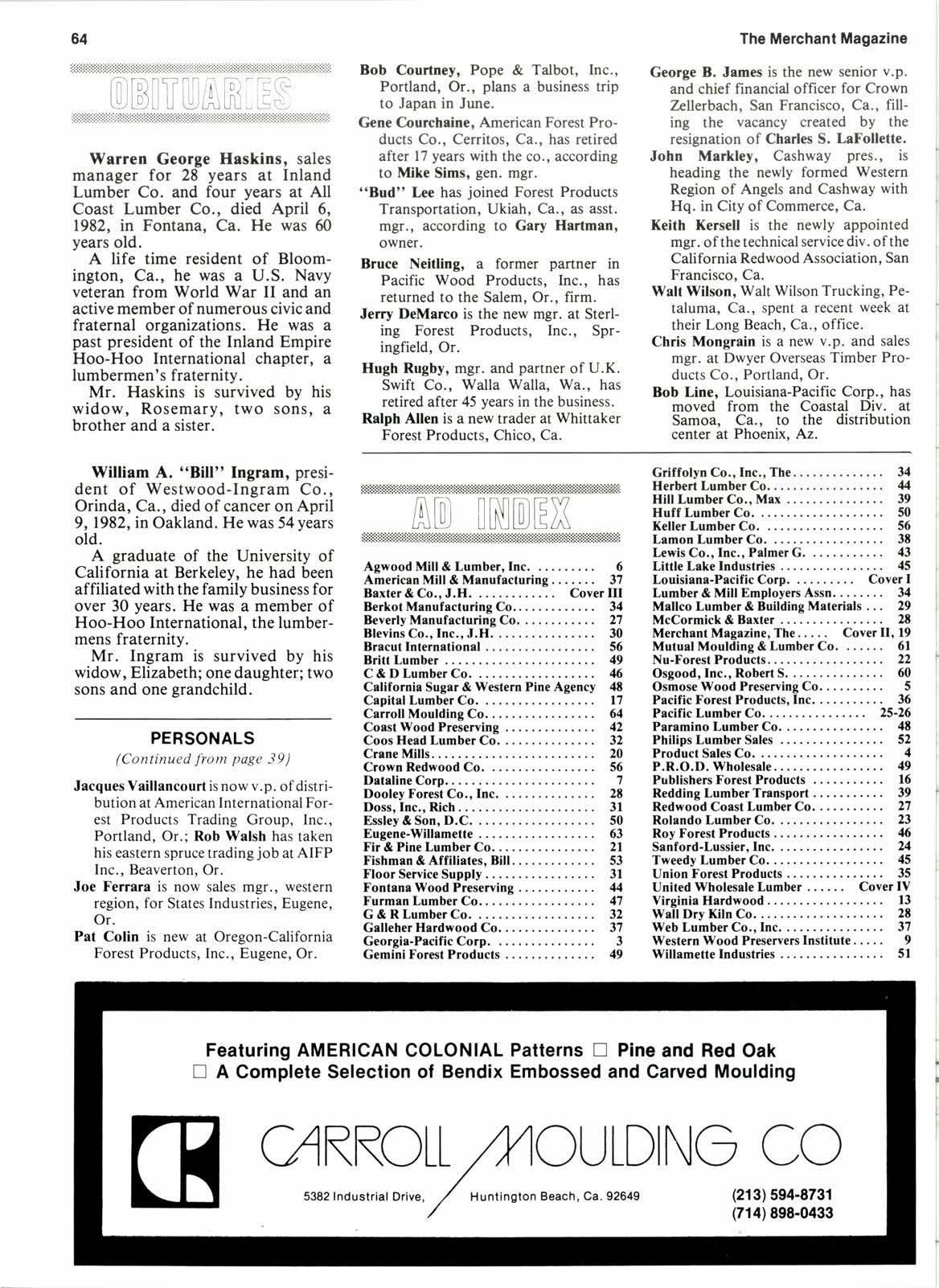 NNDEX AgwoodMill&Lumber,Inc. .,....... 6 AmericanMill&Manufacturing...,... 37 Baxter&Co..J.H..... CoverIIIBerkotManufacturingCo.. 34 Beverly Manufacturing Co. 27 Blevins Co., Inc., J.H. 30 Brrcutlnternrtional.. 56 Britt Lumber 49 C&DlumberCo...... 6 California Sugar & Western Pine Agency .fE Capital Lumber Co. . 17 Carroll Moulding Co. . 64 Coast Wood Preserving 42 CoosHeadlumberCo.. 32 CraneMills. ......... 20 CrownRedwoodCo... 56 Dataline Corp. 7 DooleyForestCo., Inc. 2t Doss, Inc., Rich. . 3f Essley&Son,D.C... 50 Eugene-Willamette .. 63 Fir & Pine Lumber Co. 2l Fishman & Affillates, Bill. 53 Floor Seivice Supply. . 3l Fontana Wood Preserving 44 Furman Lumber Co.. 41 G&RlunberCo...... 32 Galleher Hardwood Co. 31 Georgia-Pacific Corp. , 3 Gemini Forest Products 49 Featuring AMERICAN COLONIAL Patterns n Pine and Red Oak n A Complete Selection of Bendix Embossed and Carved Moulding C,4RROLL ULDING CO (213) 594-8731 (714) 898-0433 5382 Industrial Drive, Ca. 92649