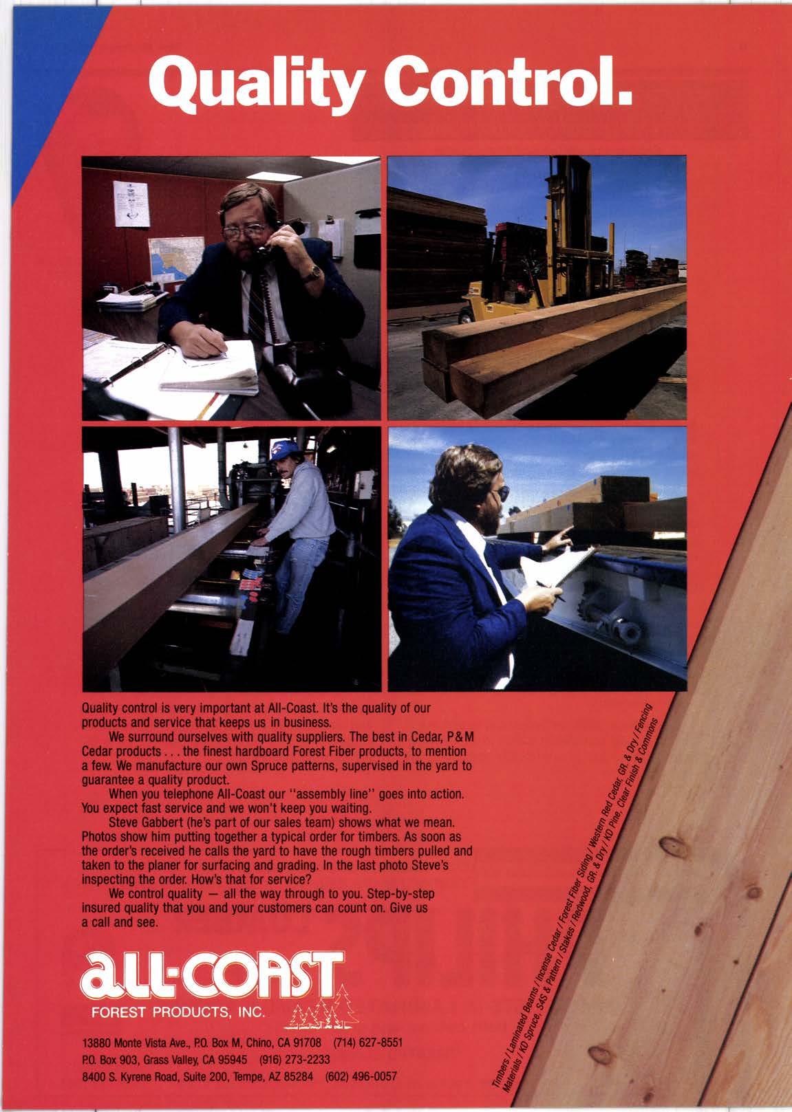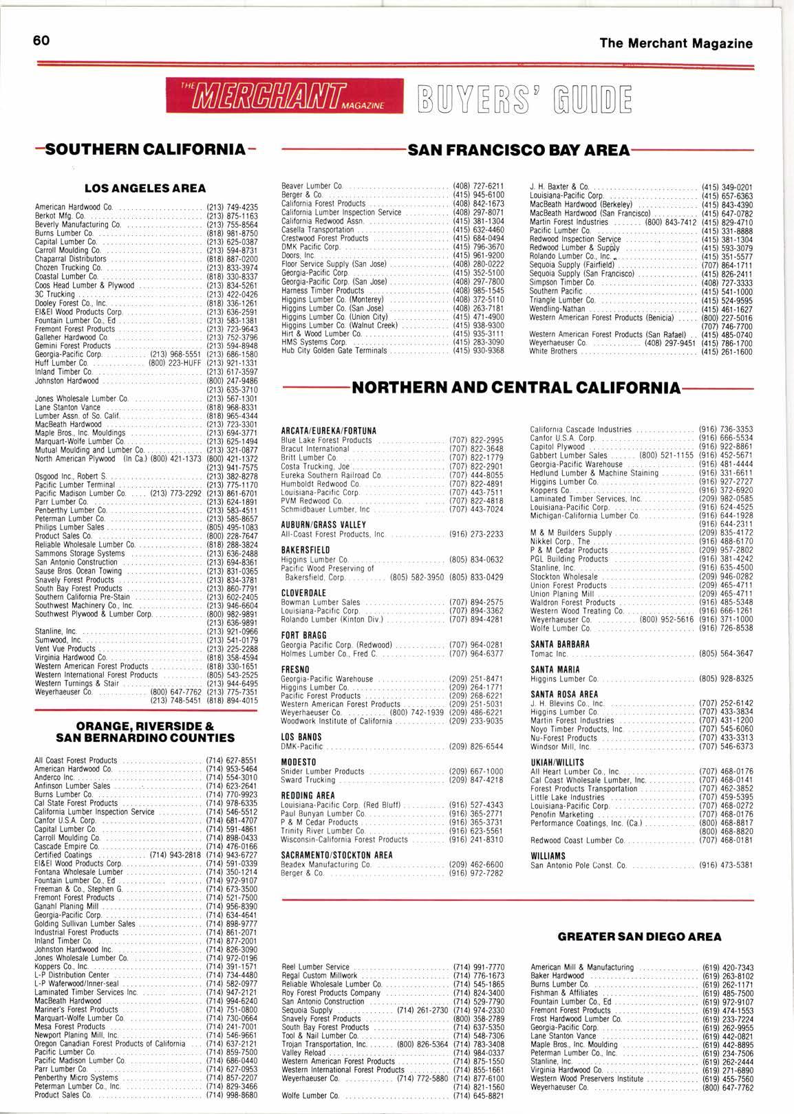 Artis Metals, Inc. ..........20 Beadex Manufacturing Co, .....2E Berkot Manufacturing Co. .....59 Beverly Manufacturing Co, ... ......,..46 Bfevins Sawmills, J.H. ... ..,..22 Blue Lake Forest Products .............57 Bracut International.. .........57 BrittLumber .........48 Cal Cosst Wholesale Lumber. Inc. ......4? CascadeEmpire .....58 3C Trucking ..........54 Central Builders Supplies Co.,.........48 Certified Coatings ..,..21 ChozenTrucking ....,.59 Coastal Lumber Co. .... .......55 CornettLumberCo..... .......40 Disdero Lumber ,.......Cover IY Duke City Lumber Co. .. ...42 Fontana Wholesale Lumber. Inc. .....,,50 Furrnan Lumber Co...,. ....12-13 Gmrgia-Pacific Corp. Cover I Gemini Forest Products ......,.. .......57 Hedlund Lumber & Machine Staining ..23 HerbertLumberCo..... ...:...53 Hirt& Wood ..........41 Holtec (USA) Corp. .. .........45 Huff Lumber Co. ... ....,,....44 InlandTimberCo. ... .........52 JohnstonHardwood ...........54 Jones Wholesale Lumber Co. ..........36 KellerLumberCo..... ........31 Kuzman Forest Products ...... .........42 Lewis Co., Inc., Palmer G. ,,...21.34 Little Lake Industries .........50 M&M BuildersSupply ........54 Martin Forest Industries ......,.3 McFarland Cascade ........, ..33 Mesa Forest Products .........52 Mutual Moulding & Lumber Co. .......31 Nrvqio Forest Products Industries ,,,...37 North American Plywood Corp. ........35 Northgate Lumber ....,61 Owens Forest Products ,...32 PacilicForestProducts ........49 Pacific Lumber Co. ........7 P&M Cedar Products .....24-25 Panel Products Special Issue Cover III Philips Lumber Sales ........ .6 Product Sales Co. 4 Redwood Coast Lumber Co. ........ 46 Reliable Wholesale Lumber ............43 RSG Forest Products ..........45 Snavely Forest Products Co. ...... .35 Southern California Pre-Stain ....,.....30 Southwest Plywood & Lumber Corp. .,..4? Stanline, Inc. Starlire Lumber Co. ..... ......29 Thunderbolt Sales. Inc. ........30 Tool & Nail Lurnber Co. ...............23 Union Forest Products .........51 Yaagen Bros. Lumber Inc. .............19 Yalley Reload ....43 Waldron Forest Products, Inc. ..........20 Western Wholesale Moulding, lnc. ....,l9
