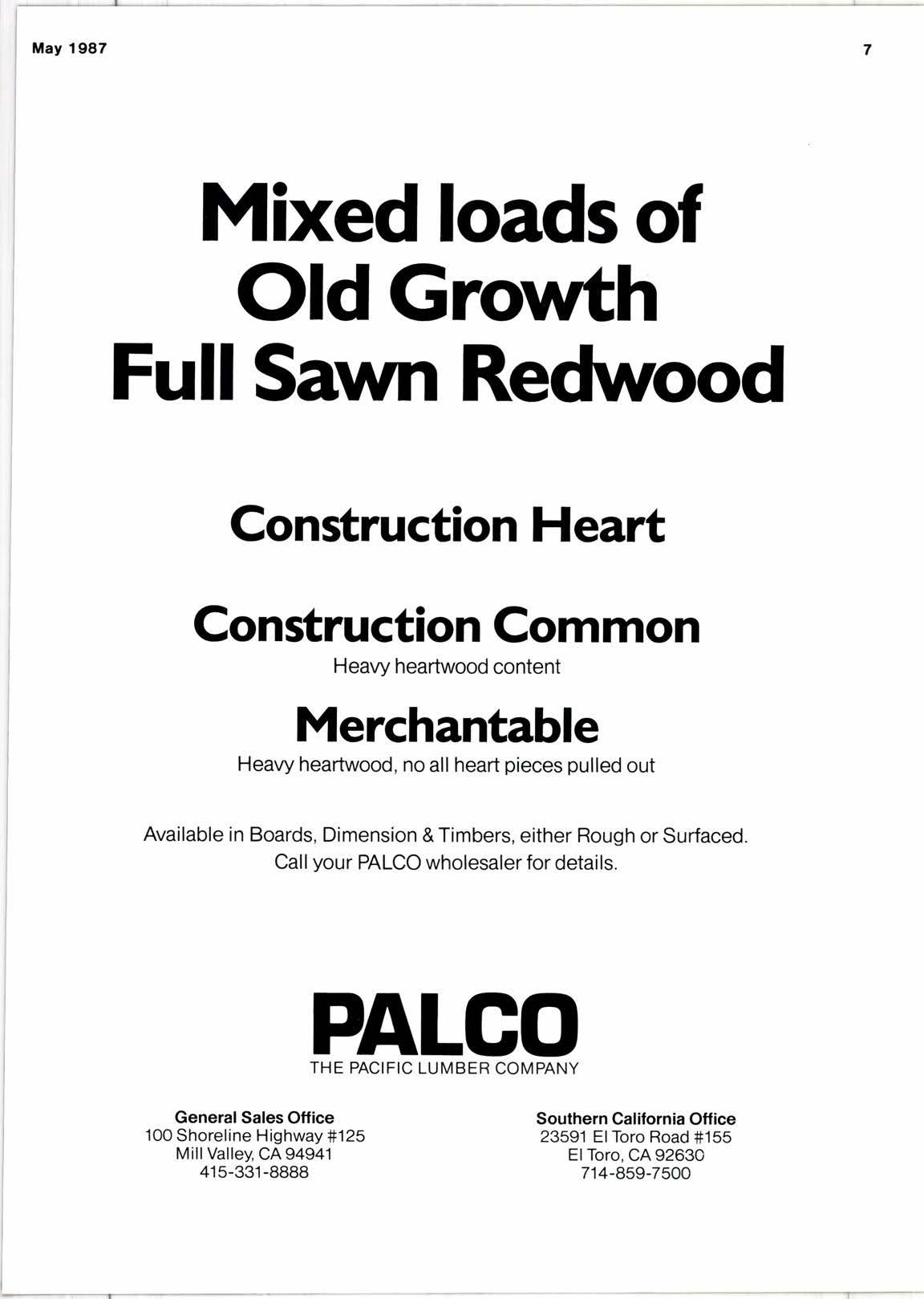 May 1987 Mixed loads of Old Growth Full Sawn Redrnrood Construction Heart Construction Common HeaW heartwood content Merchantable Heavry heartwood, no all heart pieces pulled out Available in Boards, Dimension & Timbers, either Rough or Surfaced. Call your PALCO wholesaler for details. PALGO THE PACIFIC LUMBER COMPANY General Sales Oflice Southern California Oftice 1OO Shoreline Highway #125 23591 ElToro Road #1S5 Mill Valley, CA 94941 El Toro, CA 92630 415-331-8888 714-859-7500
