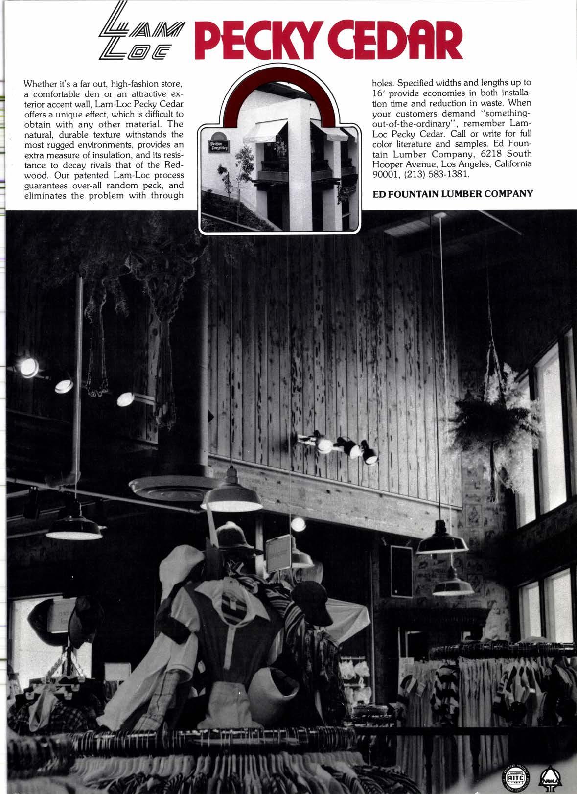 holes. Specified widths and lengths up to 16' provide economies in both installation time and reduction in waste. When your customers demand "somethingout-of-the-ordinary", remember LamLoc Pecky Cedar. Call or write for full color literafure and samples. Ed Fountain Lumber Company. 6218 South Hooper Avenue. Los Angeles, California 90001, (213) 583-1381.