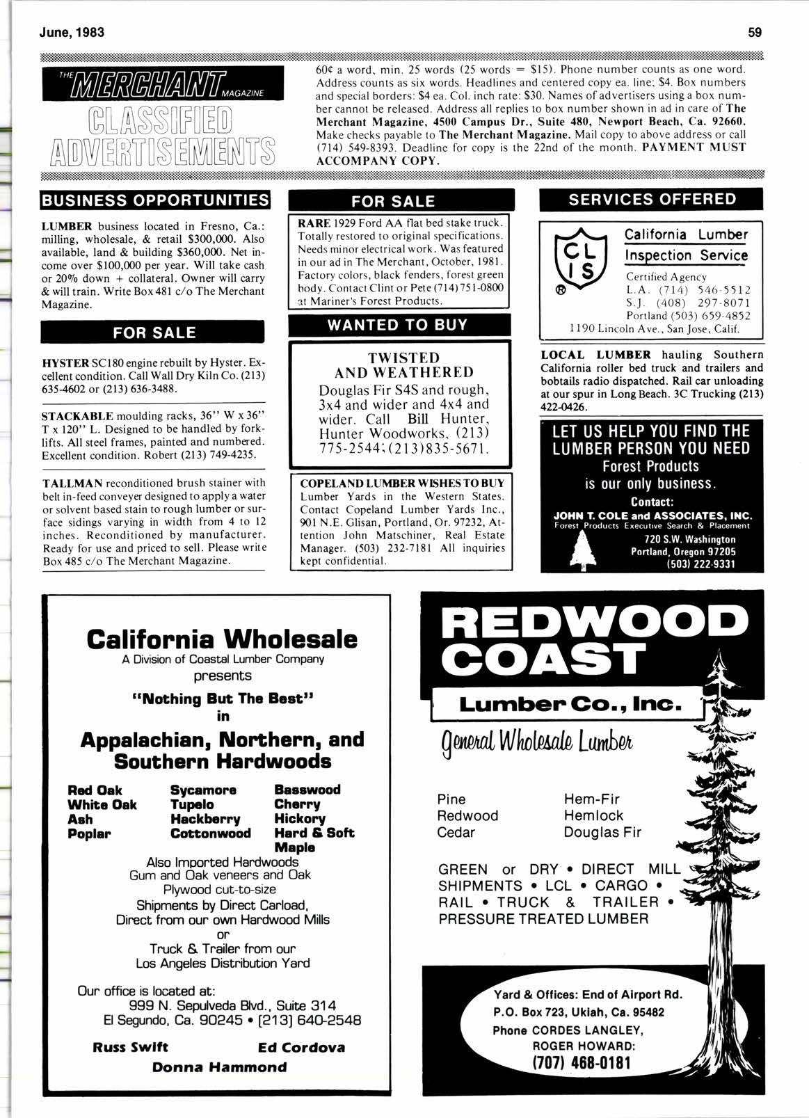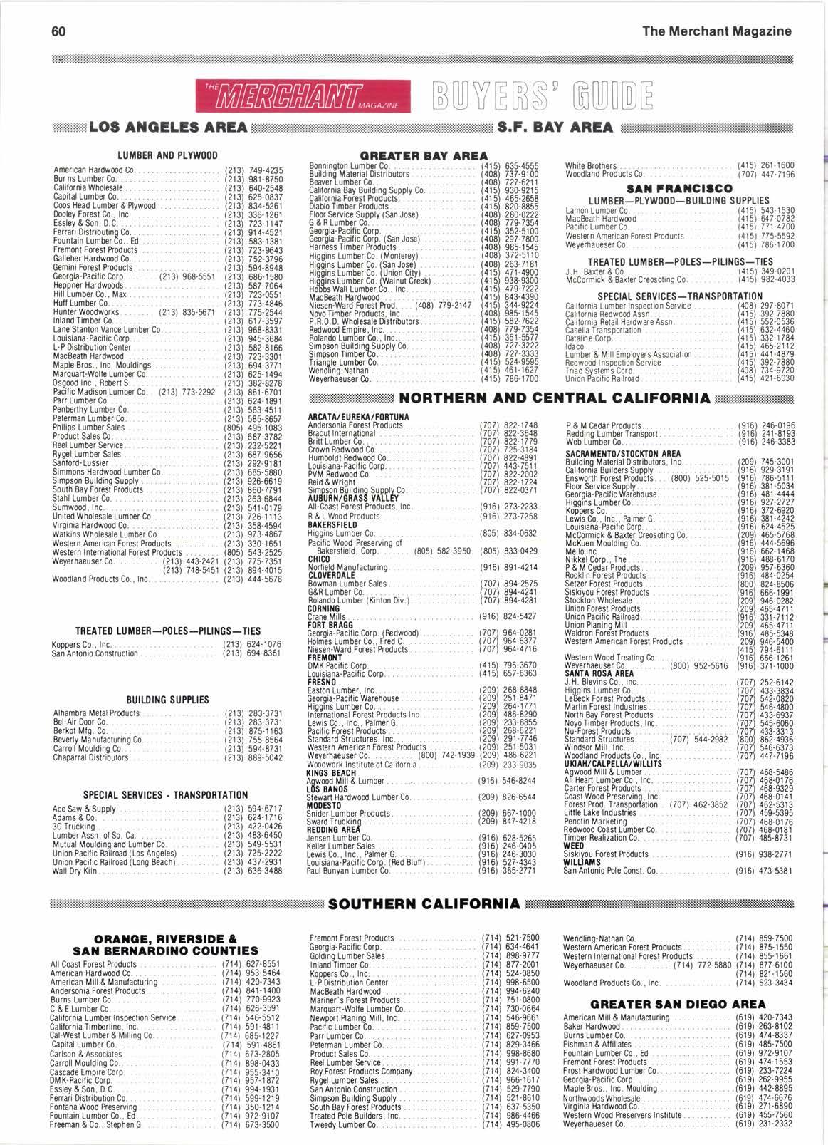 n lilMfEtilT |l RfE[R R' lllNlnll-FX HiLq.J U t-LUU U UCiEtJUO UUUt-VJLb/^\ American Hardwood Co.. ... .......... 26 Baxter & Co., J.H. 33 Beverly Manufacturing Co. 30 Bfevins Co., Inc., J.H. .. ... .... 24 Bowman Lumber Sales , ..... 49 Brrcutlnternrtional.. .......,. 62 Brand S. ........CoverIII 3CTrucking. .........61 CaliforniaForest Products. ... 4l CaliforniaWholessle 59 Cal-West Lumber & Milling. 'lt Carlson & Associates . .. ., .. 4 CascadeEmpireCorp. 17 CoastWood Preserving, Inc..,.. ....... 49 ColumbiaVistaCuttingMill 43 CrownRedwoodCo... 5l DMK-Pacific 26 Essfey&Son,D.C...,,....... 27 Fishman&Associates, 8i11...... 54 Fontrna WoodPrmerving,Inc. ........ 53 Fountain Lumber Co., Ed 5 Freeman &Co.,Stephen G.......... 25 Fremonl Forest Products ..... ..... 2E FurmanLumberCo. .......... 39 G&RlumberCo...,.. ......35 HepnerHardwoods.... ....... 52 HillLumberCo..Max. ....... 56 Hirt& Wood LumberCo,. Inc.... 3E Hobbs Wafl Lumber Co, .4 HolmeslumberCo.,Fred ..... 53 Huff LumberCo...... ....... 34 InlandTimberCo..,,. .......53 KellerLumberCo..... .......51 Lewis Co., Inc., Palmer G. 35 LittleLakeIndustries ......... 52 MacBeath HardwoodCo. 20 Mallco Lumber& BuildingMaterials .... 29 Marquart-Wolfe Lumber Co, . 20 Mutual Moulding and LumberCo.. 55 Norfield Manufacturing Co, .... ...., 40 Nu-Forest Products. 45 PacificForestProducts. Inc. 45 PacificLumberTerminal ...... 13 PacificWoodPreserving 22 PaulBunyanLumberCo. 56 Penberthy Lumber Co. .Cover IV Product Sales... 4 P.R.O.D.Wholesale. ......... 62 PublishersForest Products .... 41 R&LWoodProducls ........6 ReddinglumberTransport .... 50 Redwood Coast Lumber Co., Inc. ...... 59 RolandoLumberCo. .........25 Roy Forest Products 6 San Antonio Pole Construction Co. ..... 11 South Bay Forest Products. 1 Stovrrt Hrrdwood LumberCo. ..... ... 4E Sward Trucking ., 47 TiffanyTie&LumberCo. .....,lE TriadSystems ........ 19 UnionForestProducts ........ 41 Waldron Forest Products........... ... 50 Western Home Center Show Cover lI, 3 Western International Forest Products. 46 Western Wood Preservers Institute. ...., 23 Westem Wood Treating, Inc. .Cover I WeyerhaeuserCo...... 2l Wigand&Co. ........30 WoodlandProductsCo.. ...... 3l Woodwork Institute of California 15 P R O D . l%,hf.t','* Fi:J: iP,#ioJE,,,, 11 Traynor St., P.O. Box 4696 Hayward, Ca. 94540 (41s) s82-7622
