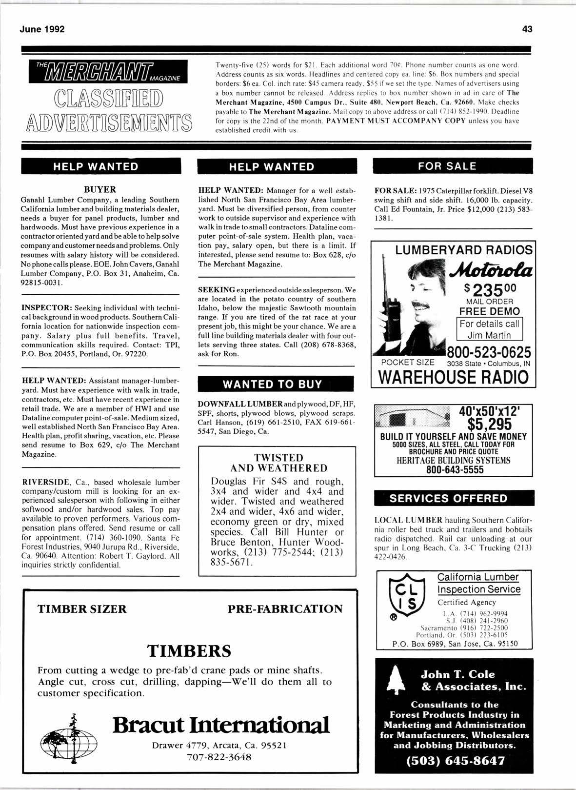 Ganahl Lumber Company, a leading Southern California lumbet and building materials dealer, needs a buyer for panel products, lumber and hardwoods. Must have previous expetience ih a conttactot oriented yard and be able to help solve company and customer needs and problems. Only resumes with salary history will be considered. No phonecalls please. EOE. John Cavers, Ganahl Lumber Company, P.O. Box 31, Anaheim, Ca. 928 r5-003 r.
