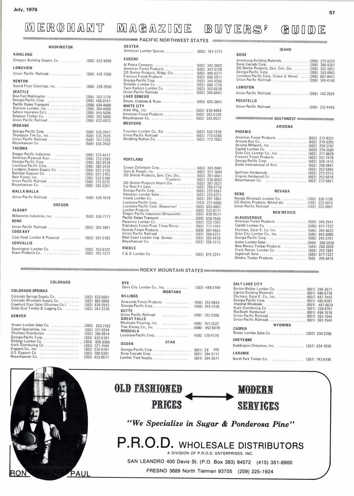 PACI F IC NORTHWEST STATES WASHIIIIGTON KIRKI"ANO Simpson Building Supply Co. 101{cvrEw Union Pacific Railroad REilT0il Sound Floor Coverings, Inc. SEATTTE Eonnington Lumber Co Evans Products Co. {206) 622.5098 (2061 425-i300 t206t 228.2550 EUGEIUE Al Peirce Conpany American Foret frodrrrt ...,.. DG ShelterProducts,Mldqs. 0iv........... Fremont Forest Products ...,. Georgia.Pacific Corp. Rolando Lumber C0........... Twin Harbors Lumber Co. Union Pacilic Railroad TAKE OSWEGO Simon, Crabtree& Rvan. WHITE CITY AlderMfg.,lnc. American Forest Products Weyerhaeuser Co. MEDFORO Founlain Lumber Co., Ed. Union Pacific Railroad Wendling Nathan Co...... July, 1976 57 (206) i63.ri76 (206) 486.0741 .{206} 6244680 {206} 3644000 {206) 545-5698 (206) 292-5000 (206) 623.6933 (509) 535.2947 {509) 535,2925 (509) 747-3165 (509) 535-2462 12061 5124417 12061 272-2283 (206) 3834578 (206) 383-2424 20il 627.2128 (206) 627-3r63 {206) 532,5100 1206) 272.2275 (206) 383.3361 (509) 529-16 t0 {503) 926-777 1 (503) 383-'t901 {503) 267-2r93 (503) 752-0123 (503) 753.121 r (503) 342.3663 (503) 342.5128 (503) 995-637r {503) 686.291 r {503) 345-4356 (503) 686-1 li8 (503) 342.65i9 (503) 345.8461 {503) 635-364r (503) 8264088 (503) 342,5128 {503) 342-5531 (503) 535-1526 (503) 773,5388 (503) 772-7063 DEXTER American LumberSpecies...... $03) j4j"7117 IDAHO BOISE Armstrong Euilding Materials... QlB) 375.6222 tsorse uascade corp. (209) 385.9361 DG Sheltsr Products, Seru. Crrs. Div. (208) 343-3651 Georgia-Pacific Corp. . (20Si 3434963 Louisiana Pacific Corp. (Coeur d'Atenel (20g) 667.9441 Union Pacitic Railroad. (Z0B) 345.4140 tEwtsT0N l.Jnion Pacific Railroad. - el'l 743-2524 SPOKAiIE Georgia.Pacific Corp. Thompson Tile Co., Inc. Union Pacific Railroad Weverhaeuser Co. TACOMA 0regon Pacitic Industries American Plywood Assn........... Georgia-Pacilic Corp. ..,. Louisiana Pacific Corp. ..,. Lundgren Dealers Supply Co. . National Gypsum Co. BainForest,lnc. Union Pacific Bailroad Weyerhaeuser Co. WAI.TA WA[[A Union Pacilic Railroad ORE GO N ALEAIIIY Willamette Industries, Inc. EEilD Union Pacific Railroad c00s 8AY CoosHead Lumber& Plywood c0 RvAtLts PO BTTAND Crown Zellerbach Corp... (503) 243-2401 Dant & Russe!|, Inc. -..... .. (503) 221-t644 DG ShelterProducrs,Sery. Ctrs. 0iv......... (S03) 297.4941 (Tuatarin) (503) 638-0663 DG Shelter Products Hearin Div. (503) 297-2531 FarwestFirSales (503) 256-4710 Georgia'PacificCorp...... (503) 222-Sb6t Hampton Lumber Sales . . {503) 223-6271 Inland Lumber Co. (503) 297.t001 Louisiana-PacilicCorp..... .. (503) 221-0800 Louisiana Pacific Corp. (Beaverton) .. (503) 643-4861 Lumber?roducts (503) 223.8171 0regon Pacific Indusrries (Witsonviile).. i503i 638.0bil Pacific States Transpon .1503) 63S-7526 Paramino Lumber Co. (503) 223-,|341 Publishers Forest Prod.,TimesMirror....... (b03) 771-ll6l SunriseForestProducts............. {b03) 297-4551 Union Pacific Raitroad iSOft Zeg.e22t West Coast Lumber Insp. Eureau .... (b03) 2924479 Weyerhaeuser Co. ... (b03) 226-1213 RIDD LE POCATETI.O Union Pacific Railroad ...... (208) 2324450 l||||1||||ll||||||||l||l||||||||||||||||||||||||||tl||isoUTHwEsT[i| ARtZ0l{A PH0Et{tx American Forest Products Arizona Box C0.....................::. Arizona Nlillwork. Inc....... Capital