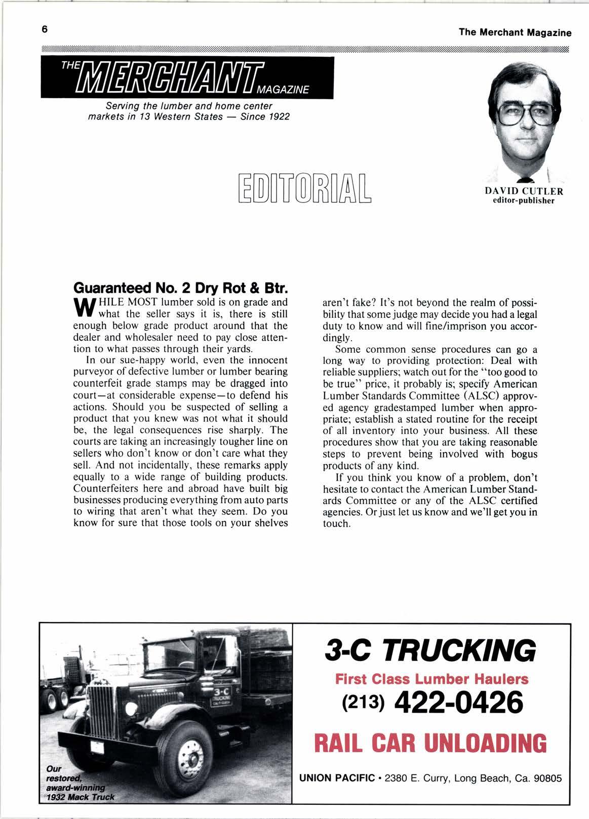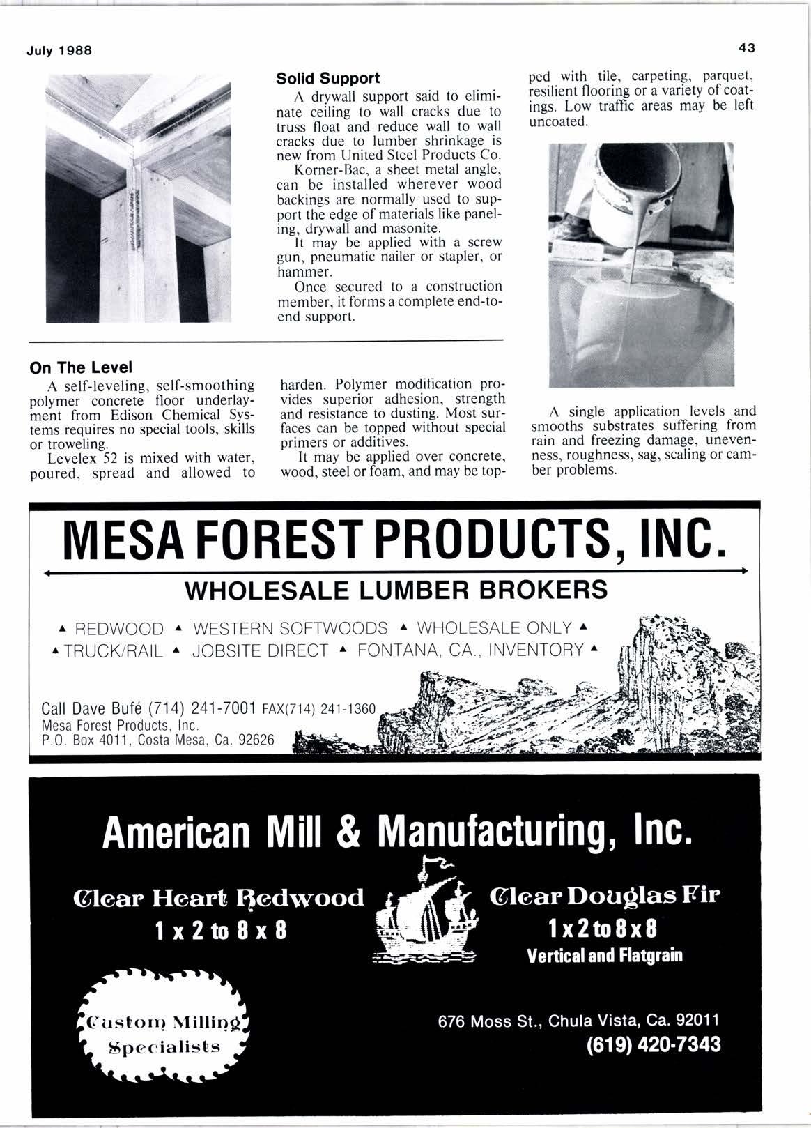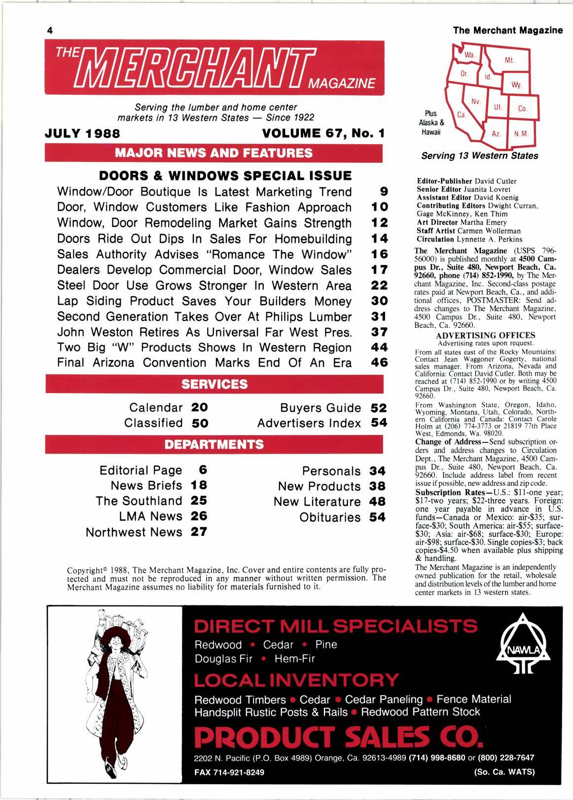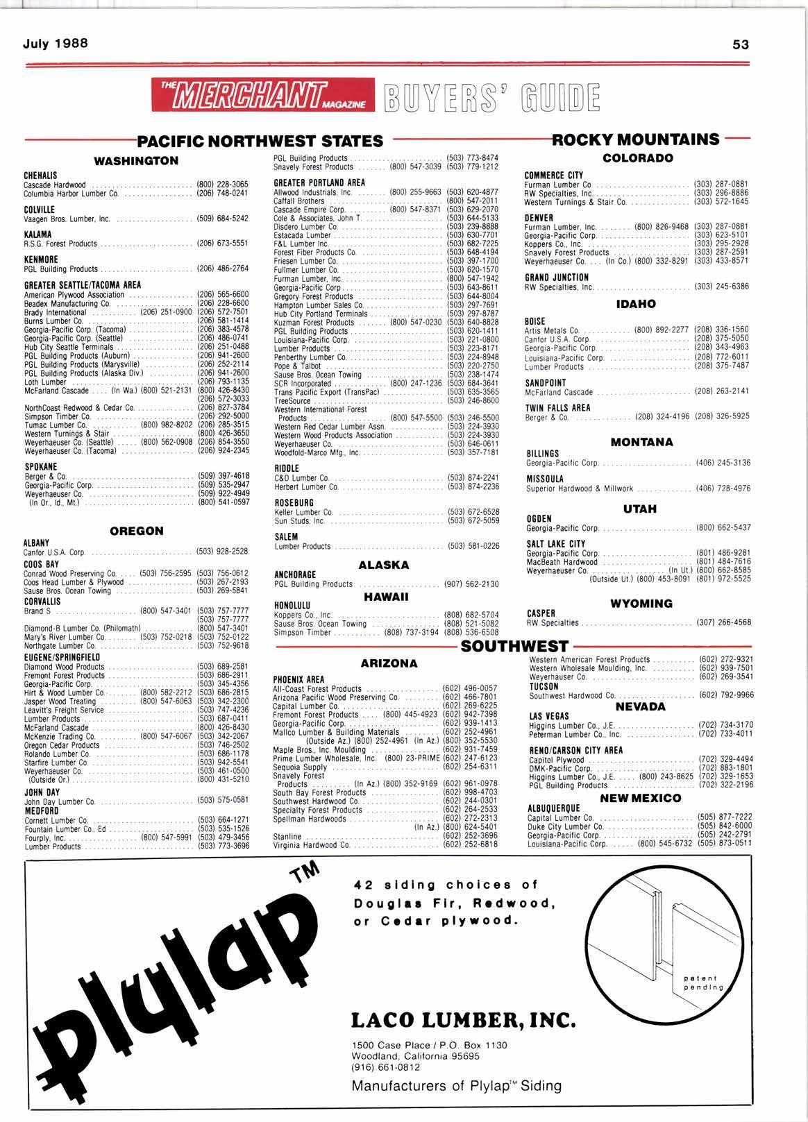 All-Coast Forest Products .........,.... 5 American Mill & Manufacturing, Inc., .43 Andersen Corp., A.W. .........13 Anfinson Lumber Sales.. ......35 Berkot Manufacturing Co.. .....54 Beverly Manufacturing Co,,.,....... , ..20 Blevins Sawmills. J.H. ,.. .....19 Blue Lake Forest Products ...... ...,...26 Bonnington Lumber Co.............,...4E Bracut International.. .........27 Cal Coast Wholesale Lumber, Inc. .47 Carroll Moulding Co. . 5l 3C Trucking 6 Columbia Harbor Lumber Co. ........41 Cornett Lumber Co...... .......49 Disdero Lumber ..... Cover III DMK-Pacific. .........30 Duke City Lumber Co..... .....30 Ensworth Forest Products .... ........23 Far West Fir Sales (UniversaD ..... 8 Fibreboard Corp. .. ....,. Cover IV Fontana Wholesale Lumber, Inc.. .31 Gemini Forest Products ..........,....50 Hedlund Lumber & Machine Staining. .40 Herbert Lumber Co. .... .......42 Hirt & Wood ,.........24 Hufr Lumber Co. ,,.. .,,,,.....25 Inland Timber Co..... .........42 Jones Wholesale Lumber Co. .... ...,32-33 Kanata Mills ....51 Kelleher Lumber Co..... 3 Keller Lumber Co..... .........23 Laco Lumber Inc..... ..........53 Little Lake Industries. .........31 Louisiana-Pacific ........, Cover ll. 2E-29 Mesa Forest Products. Inc. ,....... .43 Mutual Moulding & Lumber Co.........26 Navqio Forest Products Industries. ......23 NovaLumber .........34 Oregon Strand Board Co.. 7 PacificForest Products,,.......54 Philips Lumber Sales. ..... ....41 Product Sales Co. ...4. 17 Redwood Coast Lumber Co. ........42 Reliable Wholesale Lumber.............36 Sequoia Supply. .......27 Snavely Forest Products..,... ...,......24 Snider Lumber Products Co....,.,......48 Southwest Lumber & Plywood Corp. ....21 Stimson Trading Co...., ......,34 Thunderbolt Wood Treatine.............22 Tool & Nail Lumber Co. ...............40 TreeSource, Inc. ... .......Cover I Vaagen Bros. Lumber Inc...............19 Yent Vue Products, .36 Waldron Forest Products, Inc. ..,,... .20 Woodfold-Marco .......21