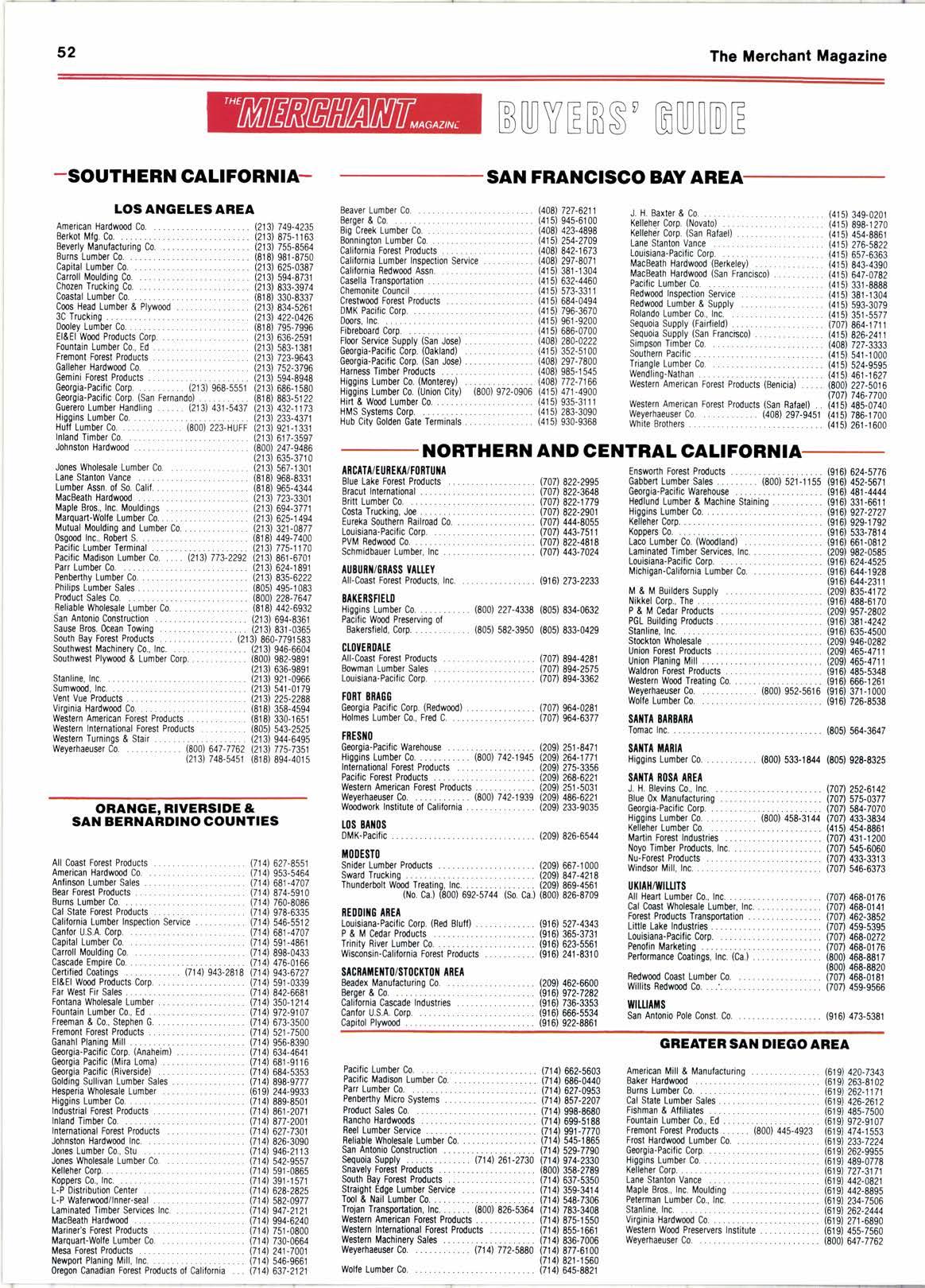 Pacific (Riverside) Golding Sullivan Lumber Sales H€soeria Wholesale Lumber Higgins Lumber Co. . Industrial Forest Pruducts Inland Timb€r Co. Intematiooal Forest Producls Johnslon Hardwood Inc. .. Jones Lumber Co., Slu Jones Wholesale Lumber Co. Kelleher Corp. Koppers Co., Inc. L-P Distribution Center L-P Waleilood/lnners€a| ............ Laminated Timber Seruices Inc. MacB€ath Hardwood Mariner's Forgst Products Marquart-Wolfe Lumber Co. Mesa Forest Products Newporl Planing Mill, Inc. oregon Canadian For6t Prcducts ol California (714) 627-8551 (714) 953-s464 (714) 681 -4707 (714) 874-59t0 (714) 760-8086 (714) 978-6335 (714) 546-551 2 (714) 681-4707 (714) 591-4861 (714) 898-0433 (714) 476-0166 (714) 943-6727 (714) 591-0339 (714) 842-6681 (714) 350-1214 (714) 972-9107 (714) 673-3s00 (714) 521 -7500 (714) 956-8390 (714) 634-4641 (714) 681 -91 t6 (714) 684-5353 (71 4) 898-9777 (619) 244-9933 (71 4) 889-8501 {71 4) 861-2071 (714) 877-2001 \714) 627-7301 (714) 826-3090 (714) 946-21 13 (714) 542-9557 (714) 591-0865 (714) 391-1 571 (714) 628-2825 (714) 582-0977 17141 947-2121 (714) 994-6240 (714) 751-0800 (714) 730.0664 1714) 241-7001 (714) 546-9661 t714) 637-2121 (209) 826-6s44 r00EsT0 Snider Lumber Products ., (209) 667-1000 Sward Trucking (209) 847.4218 Thunderbolt Wmd Treating, lnc. ..., , ,.., (209) 869-4561 (N0. Ca.) (800) 692-5744 (S0. Ca.) (800) 826-8709 RE00rr8 rnEr Louisiana-Pacific Corp. (Red Eluff) ,. P & M C€dar Products Trinity Biv6r Lumb€r Co. Wisconsin-Calitornia Forest Products 8tcnilElT0/sl|lct(T0t tnEt Beadex Manulacturing Co. (209) 462.6600 Bor0or & Co. (9161 972-7282 Calilornia Cascade Industries (916) 736.3353 Canfor U.S.A. Coro. (916) 666.5534 Capitol Plywmd ...... (916) 922-8861 (707) 468-01 76 (707) 468-0141 00n 462-852 (707) 459-5395 (707]. 4il-0272 , (707) 468-0176 (800) 160-8817 (800) 108-8820 (707) 468-0181 (707) 459-9566 (916) 47$5381 GREATER SAI{ DIEGO ABEA Pacilic Lumb€r Co. (714) 662-5603 Paclfic Madison Lumb€r Co. ....... (714) 68S0440 Paff Lumbor Co. (714) 627-0953 Penberlhy Micr0 Systems (7141 g'l-2207 Product Sales Co. 014) 999-8600 Rancho Hardwoods (Zt4) 69S5180 Ro€l Lumber Sorvice (714) 991-7770 Roilable wholesale Lumber Co. (714) 545-1865 San Antonio Constructi0n (714) 529.7790 Soquoia Supply 17141 261-2730 (7141 974.2530 Snavoly For€st Products (800) 358-2789 south Bay Focst Prcduds ................... (714) 637-5350 Slraiohl Edoe Lumb€r Seruice (714) 35$3414 Tool & tlail Lumber Co ....,... (714) 5,t8-7306 Troian Transporlation, tnc. (800) 826.5364 (714) 783-3408 W6tern American Fore6t Producls (714) 875-1550 Wastorn Inlemational Forest Producls (714) 855-1661 Western Machinery Sales .....,.......... (714) 836-7006 Weyerhaeus€r Co. 17141 772-5880 014) 877-6100 wo,eLumberco ... ... ... .. lilllSiil8il American Mill & Manufacturin0 ...... Baker Hardwood ..........:............... Burns Lumber Co. Cal State Lumb€r Salos..... Fishnan & Attlllatos Fountain Lumbor Co., Ed Fremont Forsst Producls ...., , (800) 445-4923 Frosl Hardwood Lumbor Co. Georoia-Paclflc Corp. liiCgins Lumb€r Co. . K6ll6har Corp. Lane Stanton Vance Maple Bros., lnc. Moulding Pelerman Lumhr Co., Inc. Shnline, Inc. Virginia Hardwood Co. Weslern Wood Preseruers lnstitute Weyeilaeus€r Co. (619) 420-7343 (619) 263-8102 (619) 262-1171 (619) 426-261 2 (619) 485-7500 (619) 972-9107 (619) 474-r553 \6191 233-7224 (619) 262-9955 (619) 489-0778 1619) 727-3171 (6'19) 442-0821 (6't9) 442-8895 (619) 234-7506 1619) 262.2444 (619) 271-6890 (619) 455-7560 1800) 647-7762