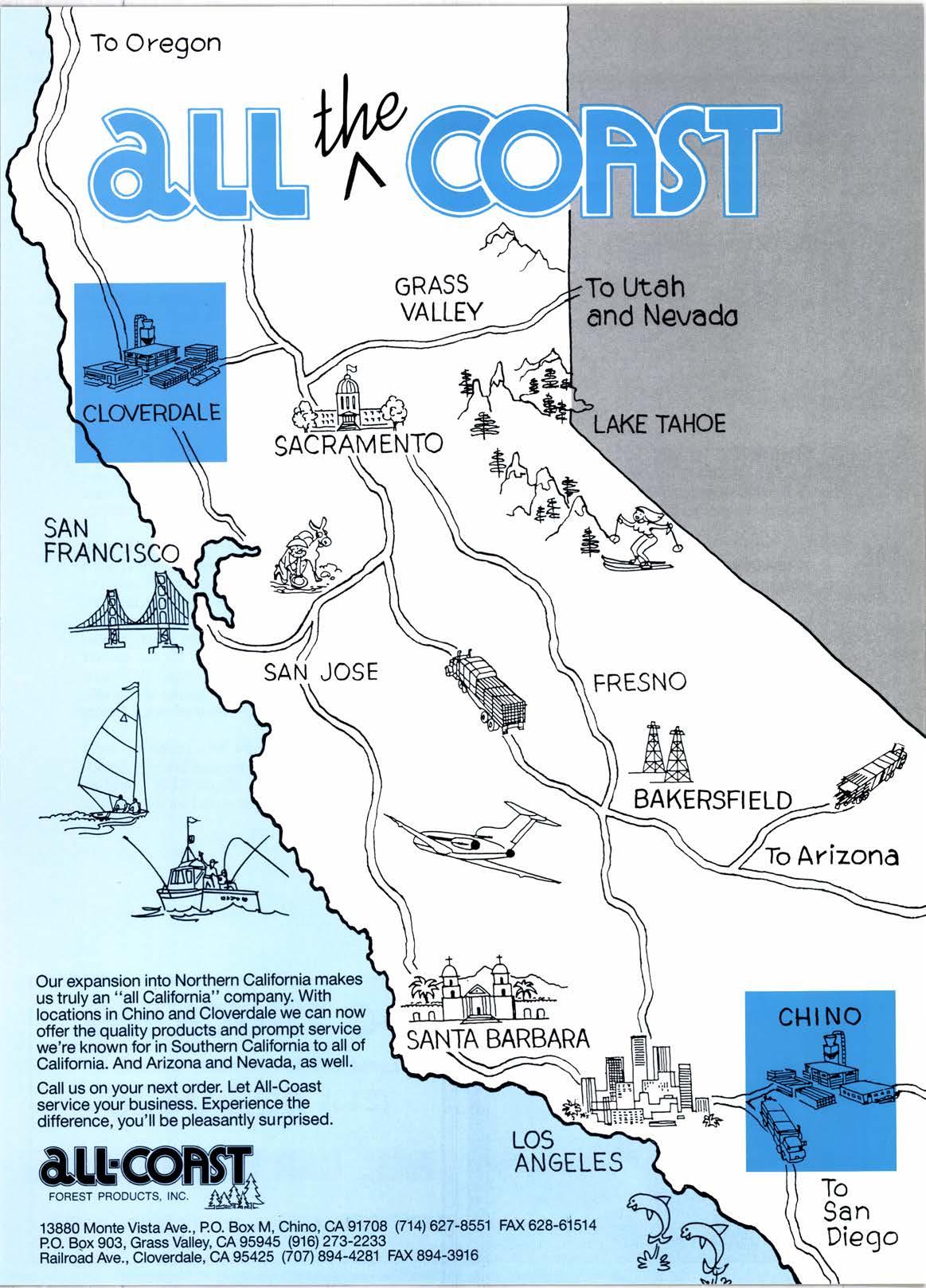 Our exoansion into Northern California makes us truly an "all California" company. With locations in Chino and Cloverdale we can now offer the quality products and prompt service we're known f6r in Southern California to all of California. And Arizona and Nevada, as well. Call us on vour next order. Let All-Coast service vour business. Experience the differen6e, you'll be pleasantly surprised.