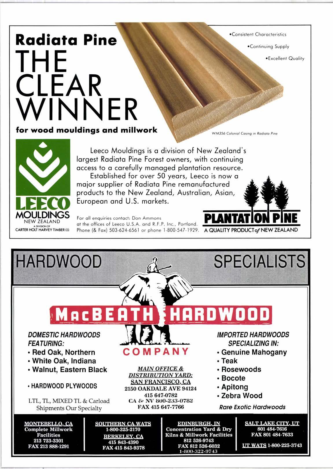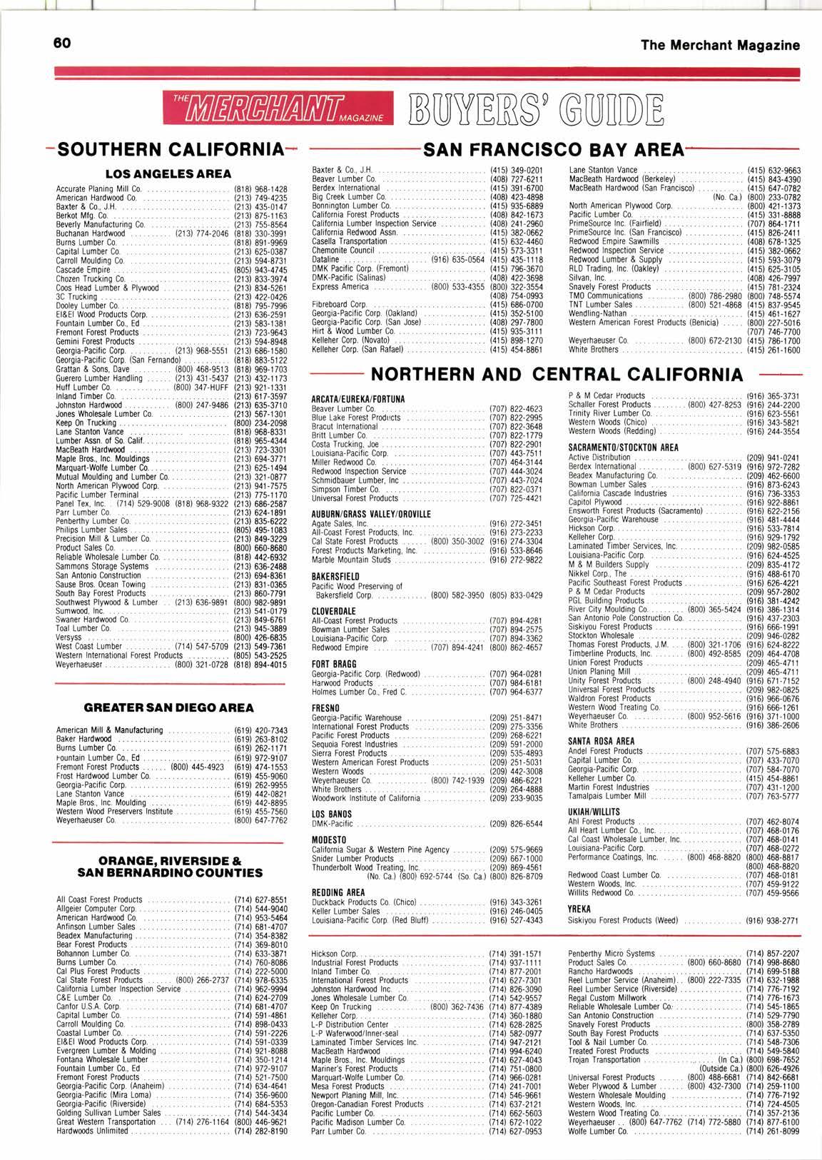 FI,ASSIAFF Stone Foresl Induslries (800) 528-3670 (602) 774-8199 PHOEI{IT AREI All-Coast Foresl Products (602) 496-0057 Arizona Pacific Wood Preserving Co. (602) 466-7801 Calilornia Lumber Inspection Service (602) 969-0090 Capital Lumber Co. ..... ... (602) 269-6225 Fremont Forest Products (800) 445-4923 (602) 942-7398 Georgia-Pacific Corp. (602) 939-1413 Mallco Lumber & Building Materials ... (602) 252-4961 (ourside Az.) (800) 252-4961 (tn Az.) (800) 352-5530 lraple 8r0s., Inc. lvoulding ...... (602) 931-7459 Primesource Inc. (602) 278-2603 Boane Co. (602) 268-1441 Snavely Forest Products 0n Az.) (800) 352-9169 (602) 961-0978 South EayForest Products (602)998-4703 Spellman Hardwoods . 16021 272-2313 (ln Az.) (800) 624-5401 Universal Forest Products {602) 961-0833 Western American Forest Producls western Wholesale Moulding, Inc. Weyerhauser Co. {800) 283-5678 rucs0[ Southwest Hardwood C0. ltEwtExrco ft8U0UEi0UE Capilal Lumber Co. Georgia-Pacilic corp. 1{EVADA NEil(l/CARS|llI CITY AREI Capitol Plywood 0MK-Pacific Corp. PGL BuildinO Products (800) 488-0833 (602) 272-9321 (602) 939-7501 (602) 269-3541 (602) 792-9966 (5051 877-7222 (505) 242-2791 1702) 329-4494 (702) 883-1 80r 1702t 322-2196 3.C TRUCKING Flrst Class Lumber Haulers (213) 422-0426 FAX 213-423-6283 RAII CAR U]{IOADI]IG UNION PACIFIC 2380 E. Curry, Long Beach, Ca.90805