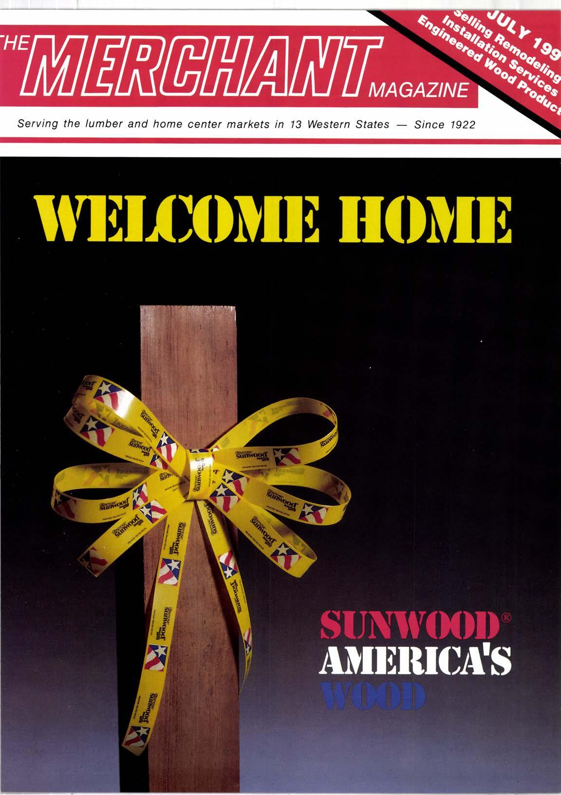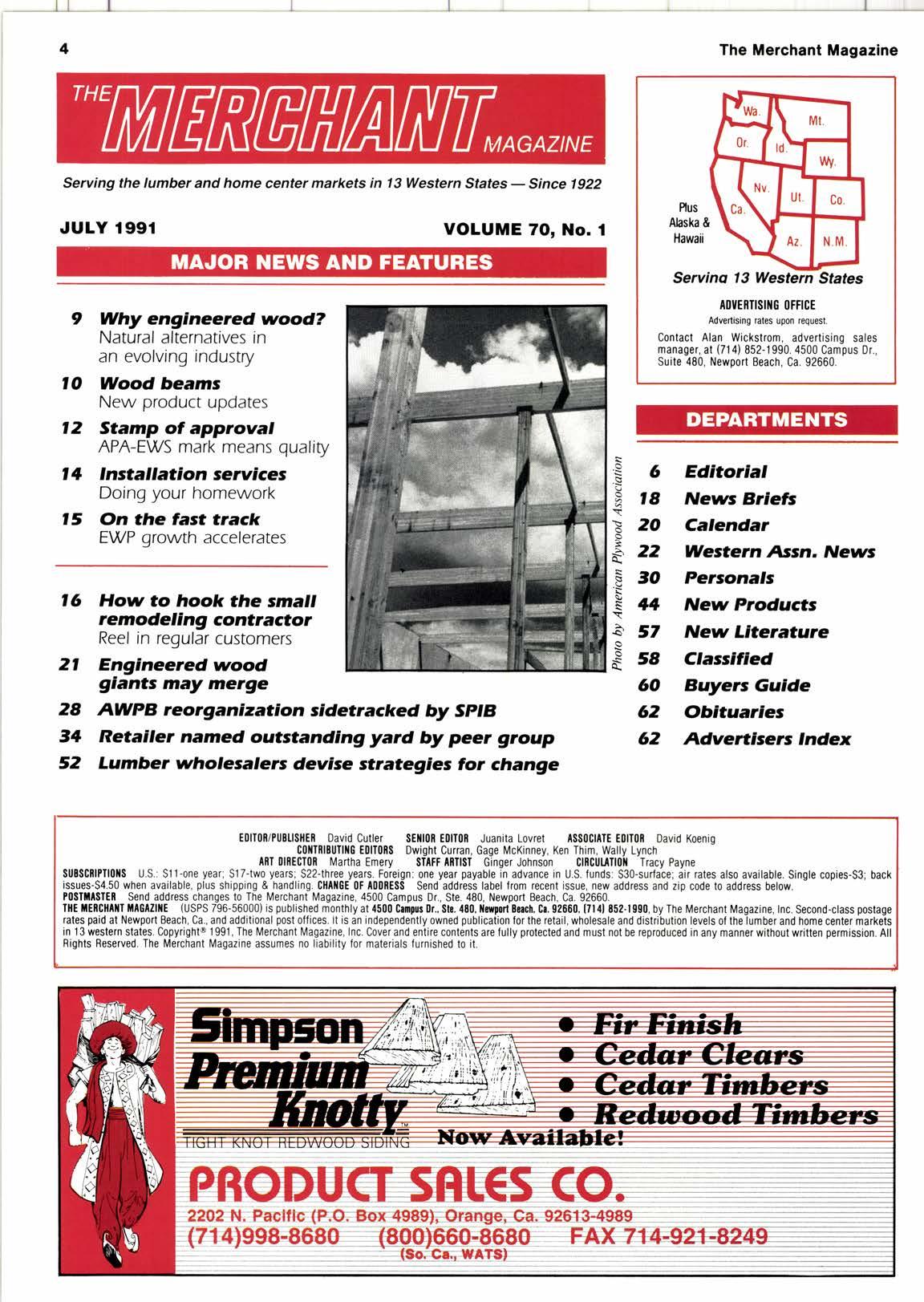 tl 4 VOLUME 7O, No. I The Merchant Magazlne 6 Edltorlal 18 NeYvr BrleB 20 Calendar 22 WesJem Assn,llleHrs tO Personals ffi New ProdlusCs 57 lllew Llterature 58 ClasslJled 60 Buyers Gulde 62 Obltuarles 62 Advertlsers Index JULY 1991 9 Why englneered wood? Natural alternatives in an evolving industry lO Wood beams New product updates 12 Stamp of approval APA-EWS mark means quality 14 lnstallatlon seruices Doing your homework 15 On the Jast track EWP qrowth accelerates 16 How to hook the small remodellng contrector Reel in regular customers 2l Engineered wood glants may merge 28 AWPB reorganlzatlon sldetracked by SPiB t4 Reteiter named outstandlng yard by peer group 52 Lumber wholesalers devlse ttrategies for change \ d F' G * Serving the lumber and home center markets in 13 Western StatesSince 1922 Plus Alaska & Hawaii AIIUERIISIlIG llFFICE Adverlisin0 rates upon request. Contact Alan Wickstrom, advertising sales manager, at (71 4) 852-1 990. 4500 Campus Dr., Suite 480, Newport Beach, Ca. 92660. E0lT0n/PU0l.lSilEn David Cutler SEtl|ln E0|T0R Juanita Lovret tSS||CltTE ElllT|ln David Koenio Cll[InlSUTllG EIllT|lfiS Dwight Cunan, Gage McKinney, Ken Thim, Wally Lynch tnT 0lnECT0R Martha Emery STIFF tnTlSI Ginger Johnson ClnCUUIl0f Tracy Payne issues-S4.so when available, plus shipping & handling. CllttGE 0F I00RESS Send address label from recent issue, new address and zip code to address below. PoSTtlSICn Send address changes to The Merchant Magazine, 4500 Campus Dr., Ste. 480, Newporl Beach, Ca.92660. Rights Beserved. The Merchant Magazine assumes no liability lor materials furnished t0 it.