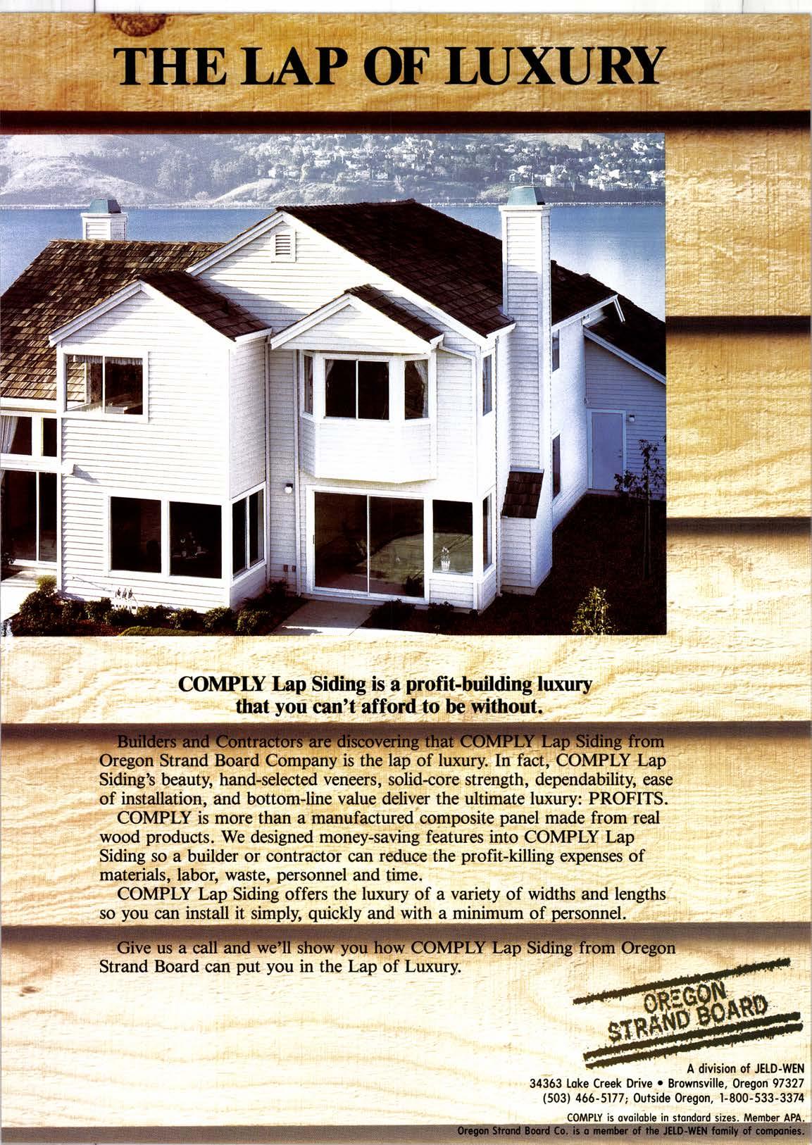 Oregon Strand Board Company is the lap of luxury. In fact, COMPLY Lap Siding's beauty, hand-selected veneers, solid-core strength, dependability, ease of installation, and bottomJine value deliver the ultimate luxury: PROFITS.