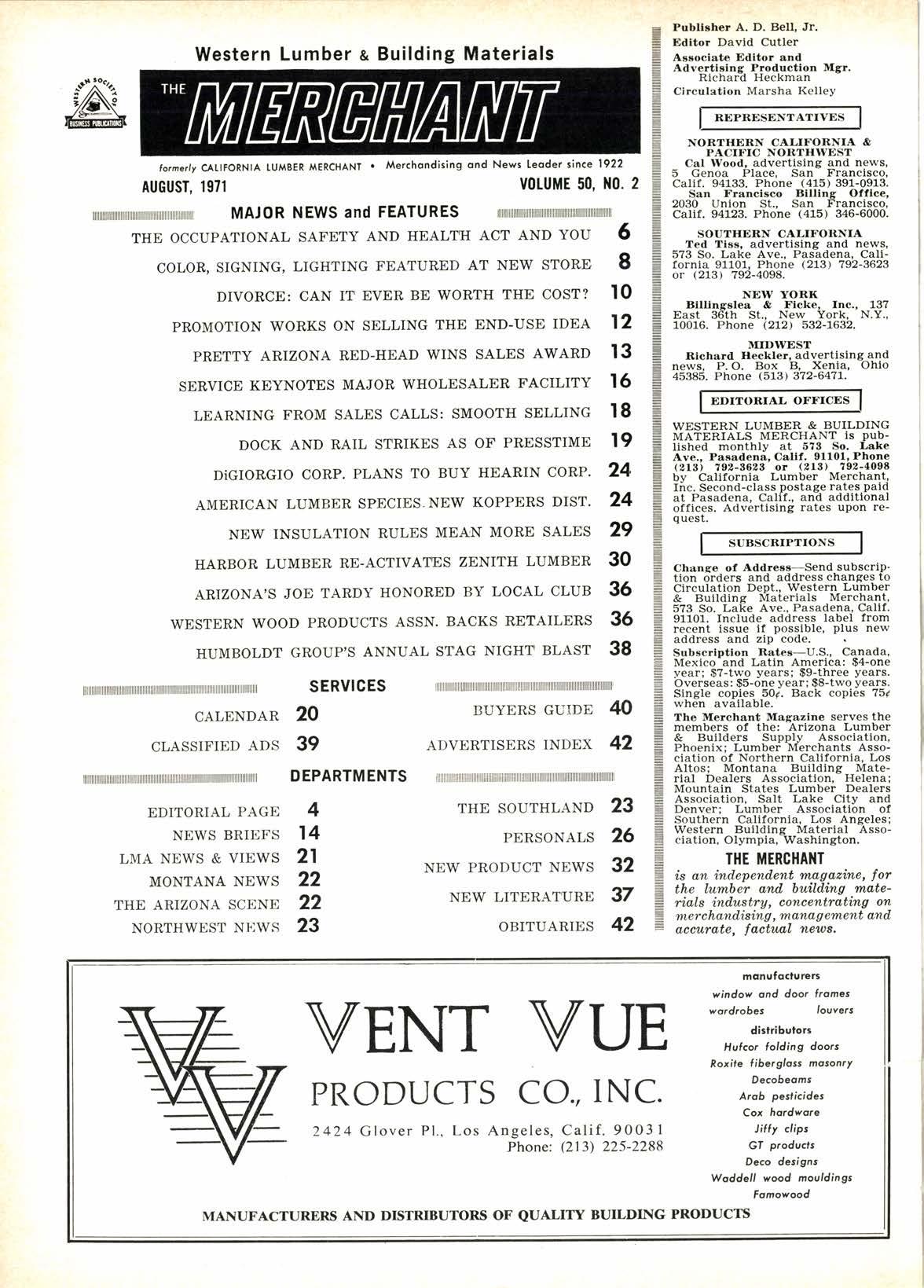 Western Lumber a Building Materials forncrly CAUFORNTA TUMBER A,iERCHANI Merchondising ond News Leoder since 1922 AUGUST, 1971 v0ruilE 50. ilo. 2 THE OCCUPATIONAL SAFETY AND HEALTH ACT AND YOU 6 COLOR, SIGNING, LIGHTING FEATUR,ED AT NEW STOR,E 8 DIVORCE: CAN IT EVER BE WORTH THE COST? I0 PROMOTION WORKS ON SELLING THE END-USE IDEA 12 PRETTY ARIZONA RED-HEAD WINS SALES AWARD I3 SER,VICE KEYNOTES MAJOR WHOLESALER FACILITY I6 LEARNING FROM SALES CALLS: SMOOTH SELLING I8 DOCK AND RAIL STRIKES AS OF PRESSTIME 19 DiGIOR,GIO CORP. PLANS TO BUY HEARIN CORP. 24 AMERICAN LUMBER SPECIES. NEW KOPPERS DIST' 24 NEW INSULATION RULES MEAN MORE SALES 29 HARBOR LUMBER RE-ACTIVATES ZENITH LUMBER 30 ARIZONA'S JOE TARDY HONORED BY LOCAL CLUB 36 WESTERN WOOD PRODUCTS ASSN. BACKS RETAILERS 36 HUMBOLDT GROUP'S ANNUAL STAG NIGHT BLAST 38 SERVtCES CALENDAR 20 CLASSIFIED ADS 39 BUYERS GUIDE 40 ADVERTISERS INDEX 42 EDITORIAL PAGE NEWS BRIEFS LMA NEWS & VIEWS MONTANA NEWS THE ARIZONA SCDNE NORTIIWEST NT]WS DEPARTMENTS 4 l4 2l 22 22 23 THE SOUTHLAND PERSONALS NEW PRODUCT NEWS NEW LITERATURE OBITUARIES 23 26 32 37 42 mcrrufocturerg vindov ond door lrames VENT VUE wordrobes PRODUCTS CO., INC. distribulors Hufcor lolding doors Roxile fibergloss mosonr/ Dacobeoms Arob peslicides Cax hardvore Jilly clips Gf producfs Deco designs V{addall vood mouldings Famowood 2424 Glover Pl., Los Angeles, Calif. 90031 Phone: QIT 225-2288 MANUFACTURERS AND DISTRIBUTORS OF QUALITY BUILDING PRODUCTS