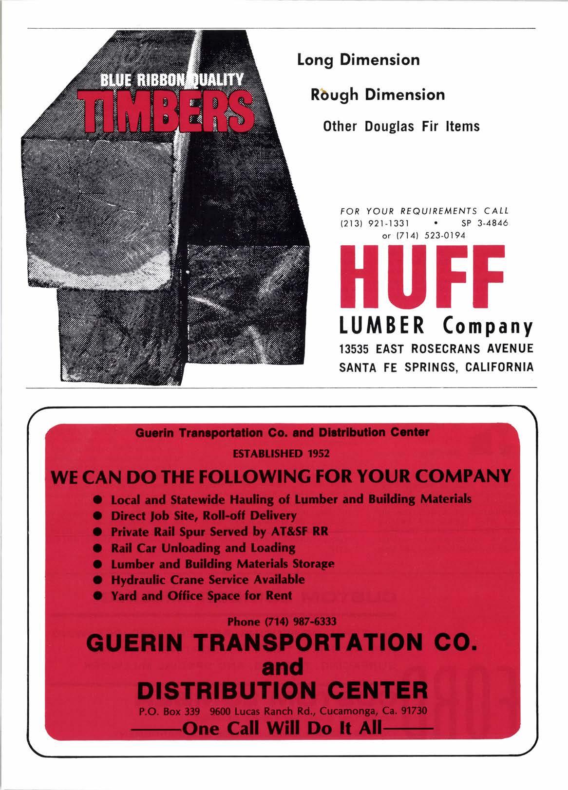 ilIililililililililt Los ANGELES AREA0ilililililililil| LUMBER AND LUMBER PRODUCTS Abitibi ................. (714) 546-6444 Al Peirce Company (213) 680-0874 All Coast Forest Products (213) 698-3711 American Forest Products (Rialto) ..,, (714) E75-1550 American Forest Products (Cerritos) (2L3) 773-9200 American Forest Products (van Nuys) (2r3) 786-7056 American Hardwood Co, ...............-... (2L3) 749-4235 American Lumber Species, Inc. (213) 830-2E60 Burns Lumber Co. ....-.....................-. (2f3) 9E1-8750 Clear Fir Sales .........-....-....-,,........., (2r3) 2E3-0447 Connor Lumber Sales .,...................... (213) 287-lLE7 Coos Head Lumber & Plywood ......-. (2f3) 834-5261 Crown Cedar Co. ..,..............-............ (714\ 637-1570 Davidson Plywood and Lumber Co. (213) 537.2540 (213) 549-3600 Dooley Redwood Lumber Co, .......... (213) ED 6-126f Essley & Son, D. C. (213) RA 3-r147 Far West Fir Sales....(213) 627-5844, (2t3) 592"1327 Fountain Lumber Co., Ed. ...-............ (213) LU 3-13E1 Fremont Forest Products ..--..-.....--.. (213) RA 3-9643 Galleher Hardwood Co. -,,,-..-..-.-....... (213) PL 2-3796 GeorgiaPacilic Corp. (Lumber) ..-.- (2f3) 968-3733 Georgia-Pacific Corp. (Plywood) .-.. (2f3) 968-555f Georgia-Pacific Corp. (Redwood) (213) 445-4710 GeorgiaPacitic Corp. ......-----.-...-....... (213) 686-f580 Globe International (213) 870-6456, (213) 839-1185 Harris Trucking Co. ..-..-....-.............-. (213) 623-5608 Hexberg Lumber Sales .........-,,-,.,...... (213) 775-6107 HiSh Sierra Lumber Sales (213) 445-0112 Hill Lumber Co., Max ......,..---.-.......... (213) 684.26r0 Hutf Lumber c0. .._.......___............... (2r3) sP 3-4646 Hughes Lumber Sales Co. (2r3) 245-5553 & 244-5840 Hunter Woodworks....(213) 835-567r, Qril 775-2544 lnland Lumber Co. (714) 877-200r & OL4) 544-4451 International Forest Products, Inc. (Chino) ................ (7lq 627-7301 Lane-Stanton Lumber Co. (213) 968-8331 Larry Larson Lumber Co. (2f3) 59E.6651 Louisianapaciric corD. .. Slii 3?l-3131 Lumber 0ivision of Davidson Plyrr/ood (213) 549.3080 (z'3t 775-8029 Marquart-Wolfe Lumber Co. ............ (714\ 558-2855 (213) 625.1494 & (714) 998-1212 Neth Lumber Sales, A. W. (213) 872-L280 osgood, fnc., Robert S. (213) 382-8278 Pacific Madison Lumber Co. (213\ 773-2292 & (213) 861-6701 Pan Asiatic Trading Co., Inc. (213) 268-2721 Penberthy Lumber Co. (213) LU 3.4511 Philips Lumber Sales .,...................... (805) 495-f083 R & L Wood Products .....,.,,,,.,,, (213) 698-9851 Rolando Lumber Co., lnc. -....... (2f3) ZEnith 9.8E43 Rounds Lumber Co.,.,-,--..........-.......... (213) 686-0917 Reel Lumber Service .,,,,,,-.,,, -....... Ql3') 232-522L Simmons Hardwood Lumber Co. (213) 685-5880 Simpson Building Supply Co. ,,.,...... (213) 773-8178 South Bay Redwood Co. (213) 860-7791 South Bay Redwood Co. (714) 637-5350 Southwest Forest lndustries .....-.. (273\ 33G7451 Sterling Lumber C0. ..................... (273\722.6363 Swaner Hardwood Co. ..................... (213) 849-6761 Tacoma Lumber Sales, Inc. ........... (213) 968.8491 Tweedy Lumber Co. (213) 272-987f Twin Harbors Lumber Co. (213) 625.8133 United Wholesale Lumber Co. (213) 726.1113 Vance Lumber Co. ...,............... (213) 968-8353 Virginia Hardwood Co. (213) 358-4594 Wendling-Nathan Co. -.............. (213) CU 3-9078 Weyerhaeuser Co. (213) 748-5451 Warehouse (Araheim) OL4') 772-5880 Weyerhaeuser Co. (Sepulveda) (213) 894-4015 (Long Beach) (213\ 775-887r Woodland Products Co.Qr! 444-3678 or (213) 443-4567 TREATEO LUMBER_POLES-PILINGS-TIES Koppers Co., lnc. (213) 775-6868 (213) 830-2860 Treated Pole Builders, Inc. (714) 986-4466 San Antonio Const. (213) 865-1245 & (213) 773-4503 BUILDING MATERIALS-PAINT-HAROWARE-ETC. M LLWORK_DOOR}-MOULD I NGS Alhambra Metal Products (2l3i' 283-3731 American Forest Products (Cerritos) (213\ 773-9200 Bel-Air Door Co. .-............,............... (213) CU 3-3731 Berkot Mfg. Co. (213) 875-1163 Beverly Manufacturing Co. ....,,,,..... (213) 755-8564 Carved Doors, Inc. -......-............,...... (213) 575.2545 Carrofl Moulding Co. ......,,..-.,,,,........ (213\ 775-2038 Colony Paints (213) 222-5171 Diamond W. Supply Co. (213) 685-9303 James P. Kinney Co. (213) 269.7411 National Gypsum Co. (213) 435-4465 Porter Co., lnc., H. K., Disston Div. (213) 358.4563 Reeve Co. (273\ 723-4797 So-Cal Commercial (213) 685-5170 Tri-County Wholesale Co. (805) 642-6724 Vent Vue .- .- (273\ 225-2288 Western Duo-Fast (213) 263.6873 SPECIAL SERVICES California Lumber lnsDection Service .,,.......,........-... (714) 548-5136 Guerin Transoortation (rail car unloadinC) (714) 987-6333 l.C.R. Corporation (213) 684-0333 Mutual Moulding and lumber Co. (Custom Millins) (2131 32r-o877 w. Coast Lbr. InsD. Bureau (213) 794-2134 HANDLING AND SHIPPING CARRIERS C-Q Trucking, Inc. (213) 538-7851 cuerin TransDortation (7L4) 987-6333 Lee Lumber Hauling (213) 596-1555 osterkamp Trucking,