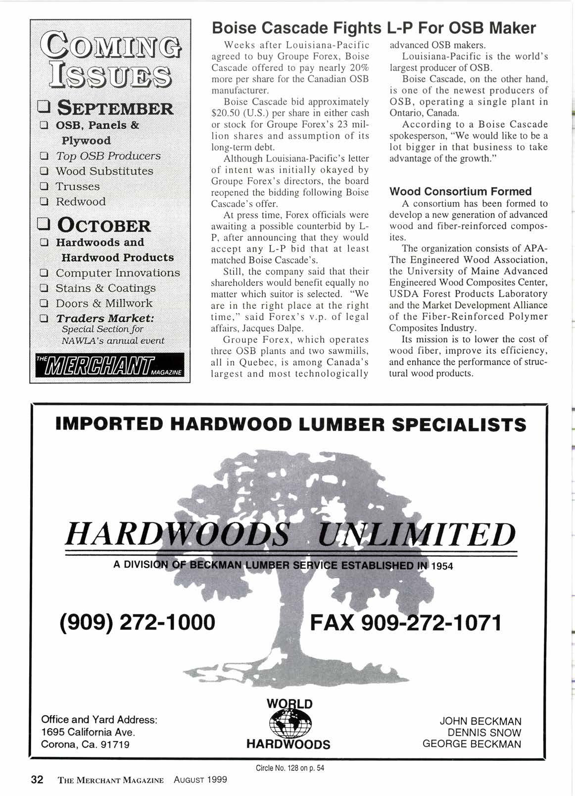 Chino, CA Division: 800.864.6881 Cloverdale, CA Divisi1n: 800.767.2237 Englewood, C0 Division: 800.525.8427 New Diyision: Salt Lake Citv: 877.263.7847 Nlt all sidings available in all aras. Chuk with y1u l1al All-C\ast dealet fot availabiliU ":."r .s i-;& ut:. Ai 3. ld} "tr ""i :;t:! r"*: t;l li; ri w;:"+mi-.ta;";,q €^-^;'1:-":il:{ i i'X" i ;. '. T :ii-i.".-.I::: "", i: ; -;+{f r "}*.: .:t:::; f fa" 3:v ti: :& -i-:: l- ;;'t :";: r -;' FOREST PRODUCTS. INC. Circle No. 105 on D. 54 Auausr 1999 ThB MrncrHrr Mlclzrnr 5