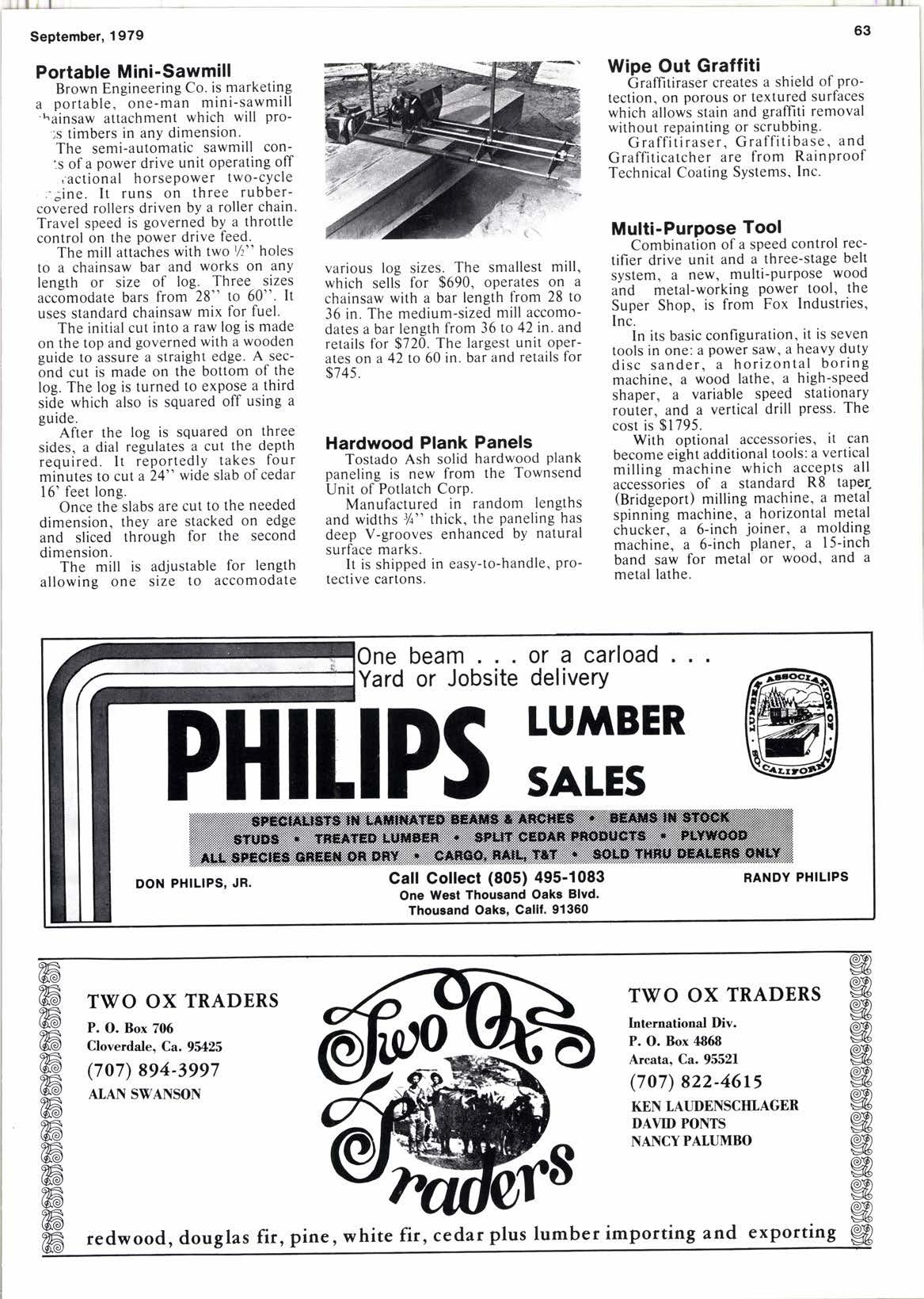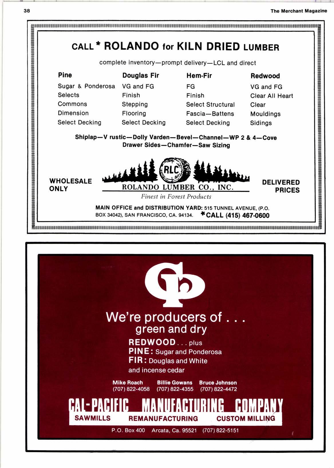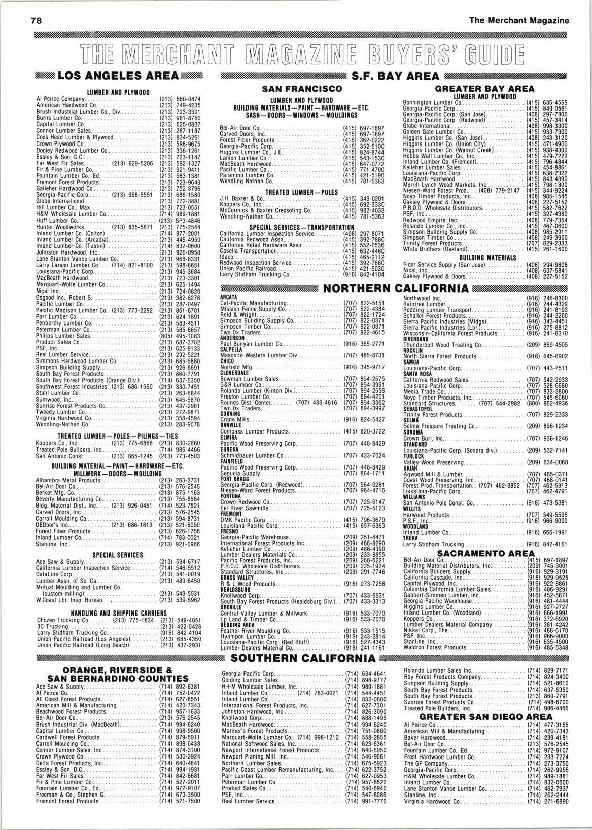 ACE SAW & SUPPLY............................ 19 ALPEIRCECO... ..........,..32 AMERTCAN MILL I MFG. INC,. , .. ,. '7 BEL-AIR DOOR CO.............,....,........,.. l0 BERKOT MFG. CO............................... 6r BEVERLY Mrc. CO..............................59 BnITT LUMBER. .6t BURNS LUMBER CO.. 39 c e D LUMBER CO..................,........... a3 CALIFORNIA BUILDERS SUPPLY.............. 55 CAL-PACIFIC MFG. CO.......................... 3t cAPtrAL LUMBER CO............... 29 CARDWELL FOREST PRODUCTS. 6r CEDAR TOREST PRODUCTS.. 69 coAsT wooD PRESERVTNG. 72 COLUMBIA CALITORNIA LUMBER SALES.. ,. , '5 coos HEAD LUMBER CO....................... 3l CRANE MILLS... 33 cnowN BURL, INC.....,....................... 55 cRowN PLYWOOD.............................. 5 cRowN LEDWOOD CO.. ...............27 DANT & RUSSELL, INC......................... 45 DMK-PACIFIC... .............30 DOOLEY REDWOOD CO.. 5r ESSLEY & SONS, D.C.. 3s EUGENE-WILLAMETTE LUMBER CO... ., 62 FIR. I PrNE LUMBEn CO... t0 FREEMAN & CO.. STEPHEN G.. 65 FOnEST FIBER PRODUCTS.. ? FOR,EST PRODUCTS TRANSPORTATION. ,. 69 GOLDEN GATE LUMBEn CO... .. 34 GOLDING LUMBER SALES... 60 GOETL'S METAL PnODUCTS.. 20 HILL LUMBER CO.. M4X....................... 27 HIRT & WOOD LUMBEn CO.....................ar HOBBS WALL LUMEER CO.. s. HUFF LUMBEn CO.. .... r|,6 HUNTER WOODWOnTS................. COVEn It HYAMPON LUMBER CO,.. .. .. .. .. .. .. .. .. .. .. a3 IDACO.. . a5 INDUSTR,IAL METAL PRODUCTS.,............. 3? TNLAND LUMBER CO,. ., .. ,. .. .. COVEn rV JERSTEDT LUMBEn CO... .., 33 JOHNSTON HARDWOOD, INC.. .. .. .. .. 6t rusTUS LUMBEn SALES.. .. .. .5t KINZUA CORP.,..,............................. 2a LAMON LUMBER CO............................ a,| LEWIS CO.. PALMEn G..,.........,............ a9 LOUISIANA.PACIFIC...,.,.....,...,.... COVER t LUMBER ASSOCTATTON OF SO. CA.. ,. 50 MAnQUAnT-WOLFE. 50 MARY'S ntvEn LUMBEn CO.. .65 MEDIA TIADE CO...................... COVER ttl MUTUAL MOULDING AND LUMf,ER CO........50 MCCLELLAN PLANING MILL..,.............,. 66 MCFAnLAND CASCADE.. .. .. .. .. ,, .. .. 2l N4WLA.......... .............36 NORTHERN LUMBER SALES. 22 NORFIELD MFG.........,.................,...., 76 NORTHWEST HAnDWOODS, tNC,............,.. 9 NOnTHWOOD. INC............................... 6 NlcAL. INC...... .............59 onEGoN LUMBER EXPOnT CO.. .. 56 oscooD, tNc., RoBEnT s.......,.............. 72 PAC|FIC COMMERCTAL tNC.................... 35 PAnR LUMBER CO..,,.....,.................... la PAUL BUNYAN LUMBER CO.. ,. , 73 PHTLTPS LUMBER SALES....................... 63 P.R.O.D. WHOLESALE. .. .. ., ,.. 6l PnoDUCTSALES a PSF. lNC... .. . '12 R t L WOOD PRODUCTS CO.. .. ., ., .. ,. ... , 73 RAINTREE LUMBER INC........................ 56 R,EDDING LUMBER TRANSPORT. ., , 20 Rf,DWqlD COAST LUMBER CO.................52 REDWOOD EMP|RE, .. .. ..4r noLANDO LUMEET CO..... .. .. ,. 3t noY FotEsT PRODUCTS... 56 SCHALLER FOTEST PIODUCTS.. ., .. 2t sIEnnA PAC|F|C INDUSTRIES.. .. .. ., 5l slMPsoN TIMBER CO... . 3 souTH BAY FOnESIT PnODUCTS. ,.. 57 STADELMAN. nUSSELL........................ 67 STAYTON W(X)D PnODUCTS. .. .. ., ., .. a? suNRtsE FotEsT pnoDucTs., .. ., ., .. .. .. 17 THUNDENBOLT Wq)D TREATING.. , 79 TRINITY FOnEST PnODUCTS. 49 TWEEDY LUMBEn CO........................... 6t TWO OX TIADEnS.....................,........ 63 VALLEY WOOD PnESEnVING. .,, a0 WALDnON FOBEST PRODUCTS.... .. .. .. .. 67 WEAVER FOnEST PRODUCTS..,...,........... 23 WILLAMETTE INDUSTR|ES, INC... 25-26