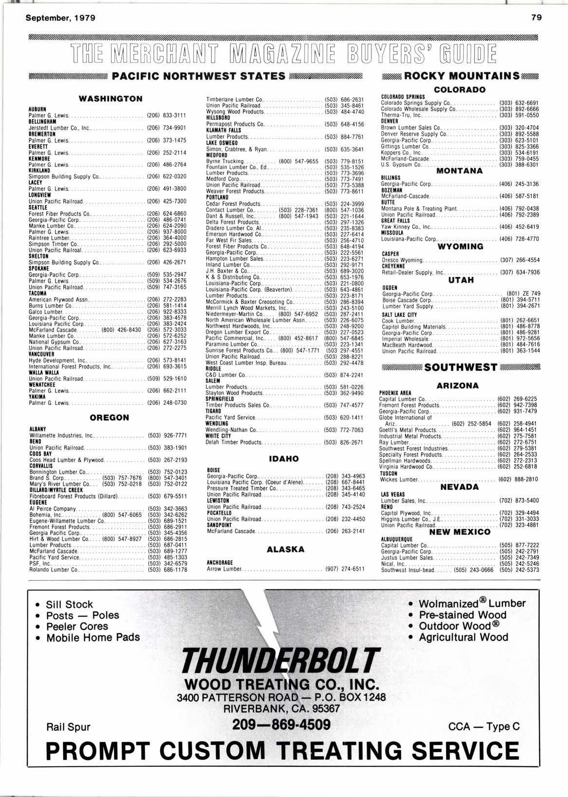 (206) 833-3111 (206) 734-9901 (206) 373-1475 \206) 252-2114 (206) 486-2764 (206) 622-0320 (206) 491-3800 t206) 425-7300 (206) 624-6860 (206) 486-0741 (206) 624-2090 (206) 937-8000 (206) 364-4000 (206) 292-5000 (206) 623-6933 (206) 426-2671 (509) 535-2947 (509) 534-2676 (509) 747-3165 12061 272-2283 (206) 581-1414 (206) 922-8333 (206) 383-4578 (206) 383-2424 (206) 572-3033 (206) 572-62s2 (206) 627-3r63 12061 272-2275 (206) 573-8r4r (206) 693-361s (509) 529-r6r0 (206) 662-2111 (206) 248-0730 {503) 926-7771 (503) 383-1901 (503) 267-2193 (s03) 752-0123 (800) 547-3401 (503) 7s2-0122 (503) 679-5511 (503) 686-2631 (503) 345-8461 (503) 484-4740 (503) 648-4156 (503) 884-7761 12081 743-2524 (208) 232-44s0 (206) 263-2141 (907) 274-651 1 (303) 632-669r (303) 892-6666 (303) 591-0550 (303) 320-4704 ...... (303) 892-5588 ...... (303) 623-s101 (303) 82s-3366 (303) 534-6191 (303) 759-04ss (303) 388-6301 (406) 245-3136 (406) 587-5181 (406) 792-0438 {406) 792-2389 (406) 452-6419 (s03) 224-3999 (800) 547-1036 {503) 22r-1644 (503) 297-1326 (s03) 235-8383 (503) 227-6414 (503) 256-4710 (s03) 648-4194 (503) 222-5561 (5031 223-6271 (503) 292-9171 (503) 689-3020 (503) 653-r976 (503) 221-0800 (503) 643-4861 (503) 223-8171 (503) 286-8394 (503) 243-5100 (503) 287-241 1 (503) 226-6075 (503) 248-9200 (503) 227-0523 (800) 547-684s (503) 223-134r (503 297-4551 (503) 288-8221 (503) 292-4478 |'503) 874-2241 t503) 581 -0226 (503) 362-9490 \503) 747-4577 (503) 620-1411 (503) 772-7063 (503) 826-2671 Timberlane Lumber C0...... Union Pacific Railroad...... Wysono Wood Products..... xil,tt!0t0 Permapost Products C0...... [ut|l[ ttut Lumber Products.......... UTE (|EIE6O Simon, Crabtree, & Ryan... . (503) 635-3641 tE0f0iD Byrne Trucking. (800) 547-9655 (503) 779-8151 Fountain Lumber C0., Ed..... .... (503) 535-1526 Lumber Producls. (503) 773-3696 Medlord Corp.. (503) 773-7491 Union Pacilic Railroad... (503) 773-5388 Weaver Forest Products... ...... (503) 773-8611 P||ITUIO Colorado Springs Supply C0........ Colorado Wholesale Supply C0.. Therma-Tru, Inc... 0Etl:t Brown Lumber Sales C0........... oenver Reserve Supply C0......... Georgia-Pacific Corp.............. Gittings Lumber C0............... KoppersCo., Inc....... McFarland-Cascade. U.S. Gypsum c0................. Cedar