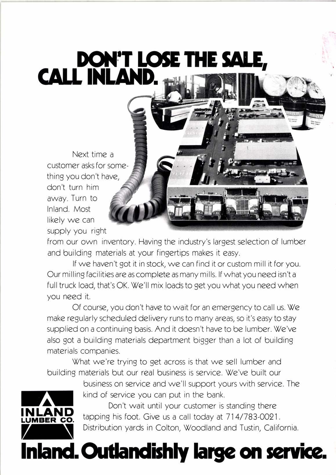 Next time a customer asks for something you don't have, don't turn him awdy. Turn to Inland. Most likely we can supply you right from our own inventory. Having the industry's largest selection of lumber and building materials at your fingertips makes it easy.