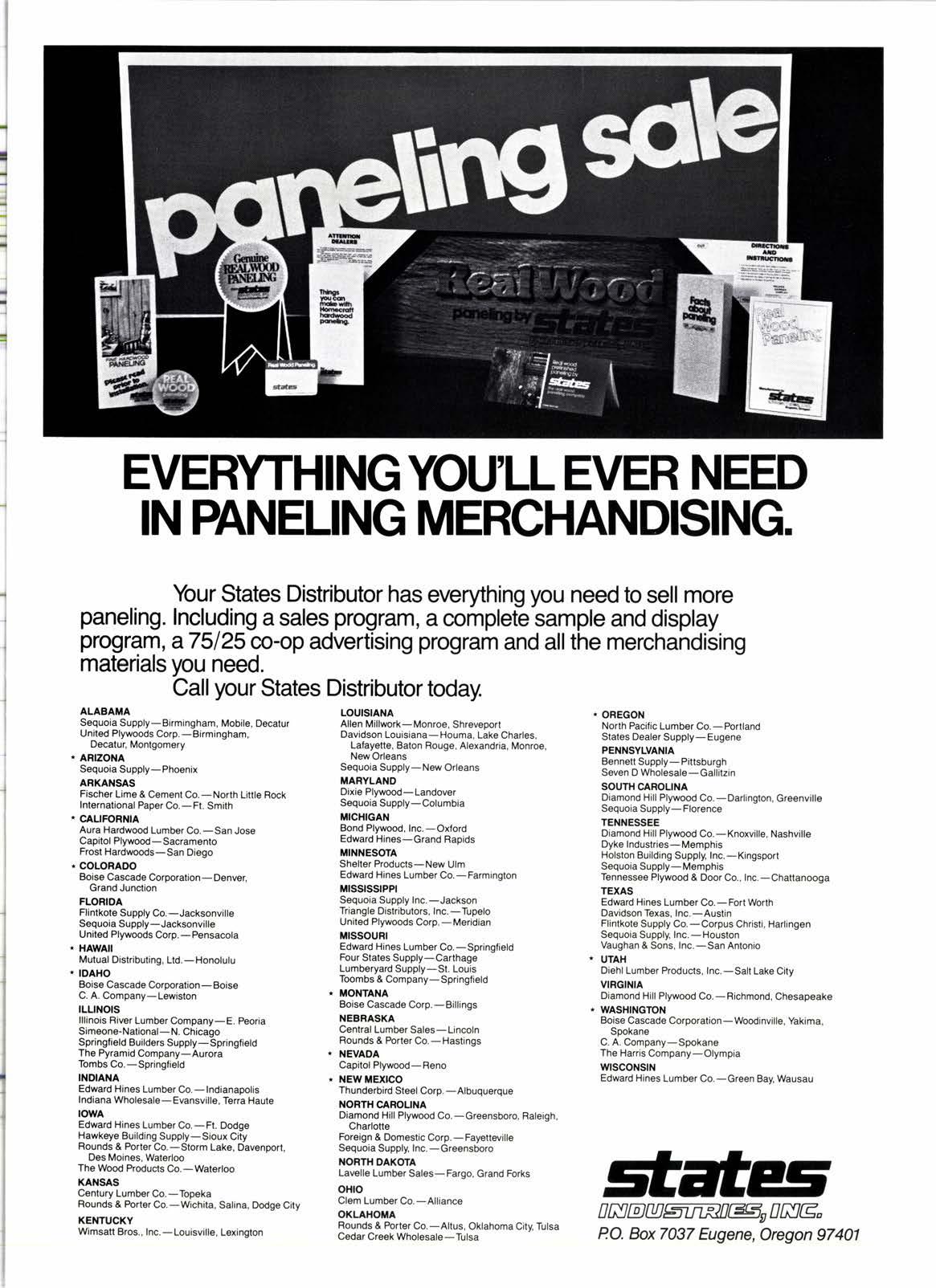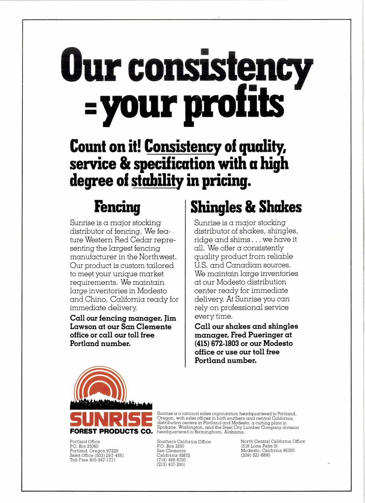 SERVTCES CALENDAR 20 BUYERS GUIDE CLASSIFIED 72 ADVERTISERS INDEX DEPARTMENTS I 10 t3 14 16 27 30 38 40 60 62 o4 67 68 74 76 EDITORIAL PAGE NEWS BRIEFS NORTHWEST NEWS MOUNTAIN STATES HOME CTR. MERCHANT PERSONALS NEW PRODUCTS LETTERS NEW LITERATURE OBITUARIES 42 48 70 71 76 6 18 22 22 29 WRIITEN PERAAISSION MUST BE OETAINEO FOR REPRODUCTION OF MATERIAI, IN THIS ISSUE DIRECT MILL SPECIALISTS RedwoodoCedar.Pine Douglas Fir o Hem-Fir LOCALINVENTORY Redwood Timbers r Cedar o Fence Material Handsplit Rustic Posts & Rails o Cedar Ridge Paneling T,RODUCT SALES CO. 2202 N. Pacific (P.O. Box 5310) Orange, Ca. 92667 (714) ggE EOSO or (213) 667'5782 Additional distribution yard at 113 E. Goetz Ave', Santa Ana, Ca.