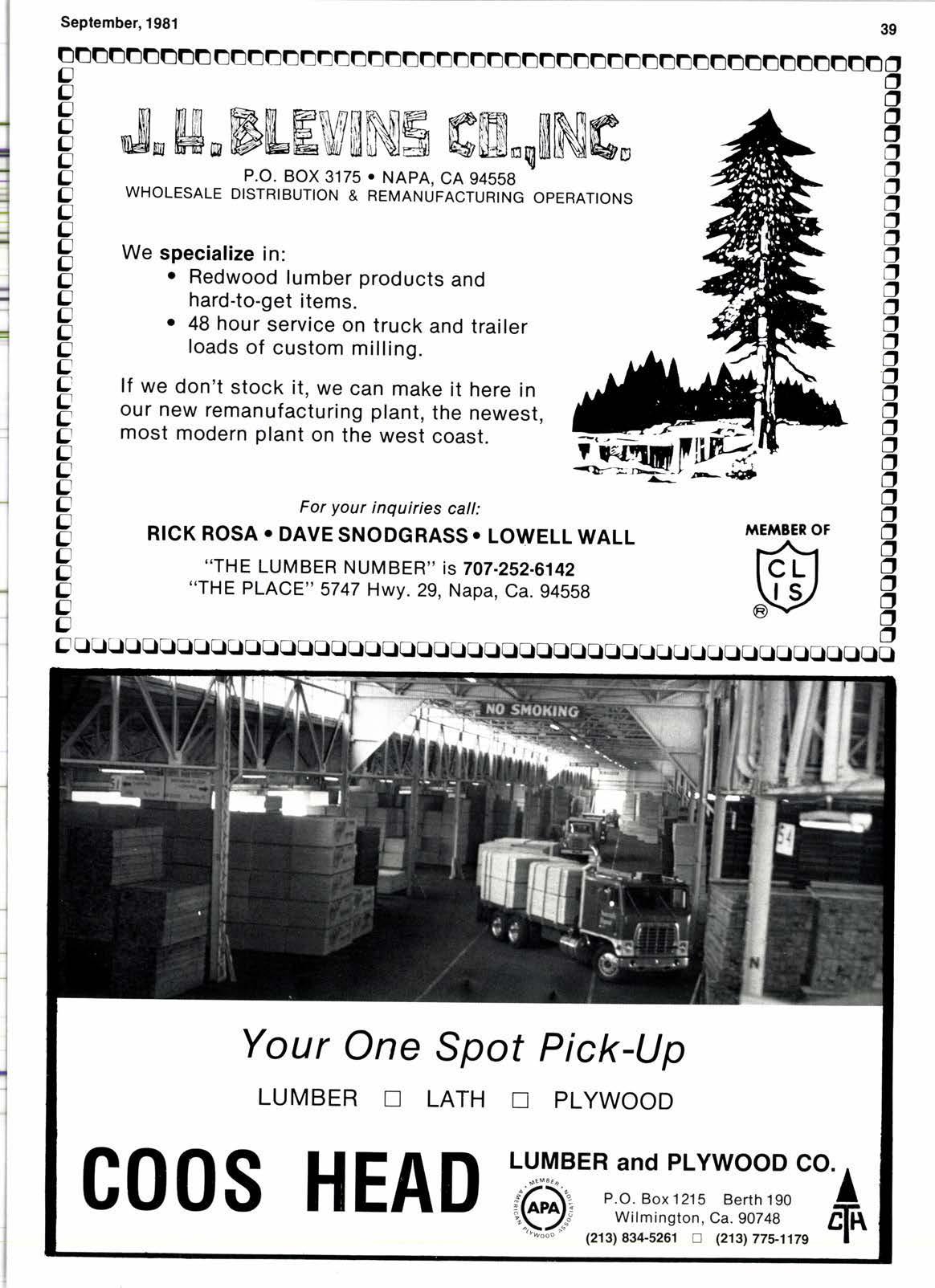 Floor Service Supply Freeman &Co., StephenG. .......... Furman Lumber Co. Gabbert-Simmen Lumber Co. G&RLumberCo.....,. Gemini Forest Products Georgia-Pacific Corp. . Cover I GFCo. 33 Goettl's Metal Products Co. 6l Herbert Lumber Co. 60 Higgins Lumber Co. 23 Hill Lumber Co., Max. . 20 Hirt & Wood Lumber Co.. 10 Hobbs Wall Lumber Co. 51 HufflumberCo...... 36 HunterWoodworks... 12 JersledtLumberCo 55 KellerlumberCo..... 59 Kinzua Corp. 69 KoppersCo.,Inc.... 2E LamonLumberCo..... 29 LeBeck Forest Products 56 Lewis Co.. Inc.. Palmer G. 43 Little Lake Industries 21 MallcoDistributols.... 34 ManrgementResourceAssociates...., 12 Mary's River Lumber Co, 45 MutualMoulding&LumberCo....... 59 Newport Planing Mill, Inc.. Cover III North Pacific Lumber Co. 67 Osgood, Inc., R.S. 57 PacificForestProducts,Inc. 53 PacificLumberCo.... 25'26 Paramino Lumber Co. 5l Paul Bunyan Lumber Co, 62 Petermrn Lumber Co,. 54 PhilipsLumberSales... 62 Product Sales Co. 4 P.R.O.D.Wholesale 56 Publishers Forest Products 65 Redding LumberTransport ...... . 64 Redwood Coast Lumber Co. 6l Reid&Wright, Inc. ... 63 Rocklin Forest Producls 2l Rolando Lumber Co. 38 Roj,ForestProducts.. 44 Rygel Forest Products 52 Sierrs Pacific Industries 35 Simpson Building Supply Co. 1l Snider Lumber Products 58 States Industries 5 Sumwood 55 SunriseForestProducts........ CoverIV TweedylumberCo. .. 63 Union Forest Products 22 Valley West Lumber Sales. 52 WebLumberCo, .... 76 Weslern International Forest Products 68 WillametteIndustries.Inc..... 24 OtsITUARIES 75 61 47 46 37 66 42 60 {"uut$