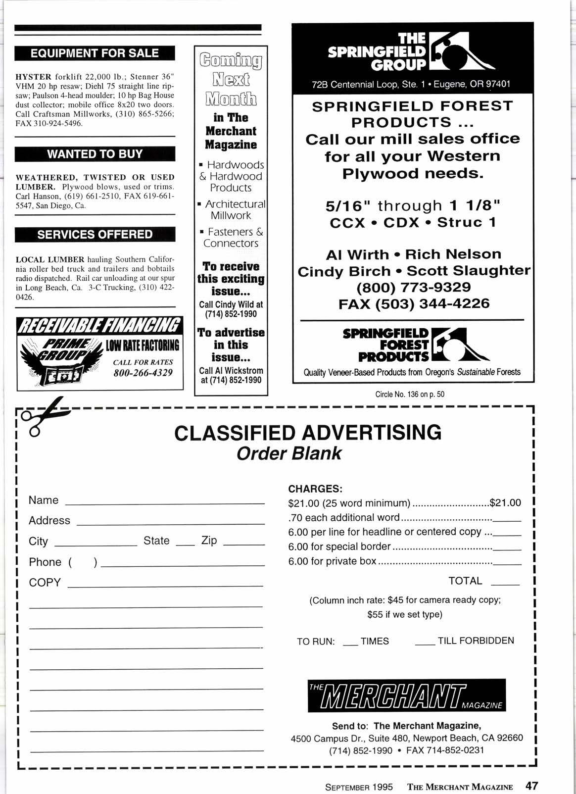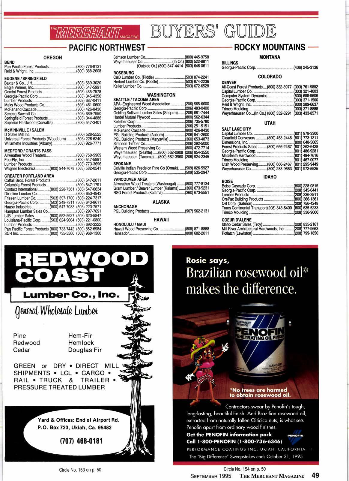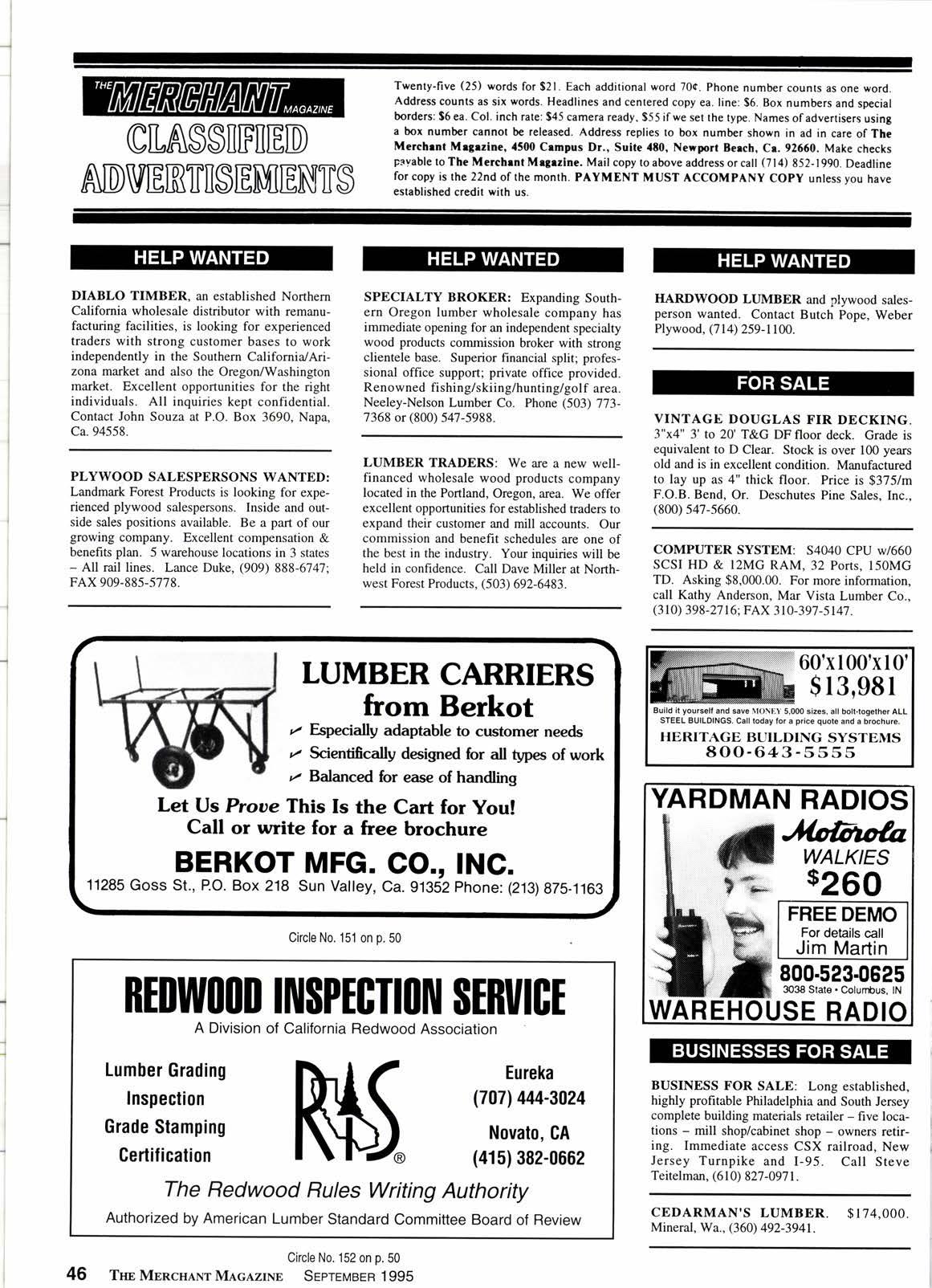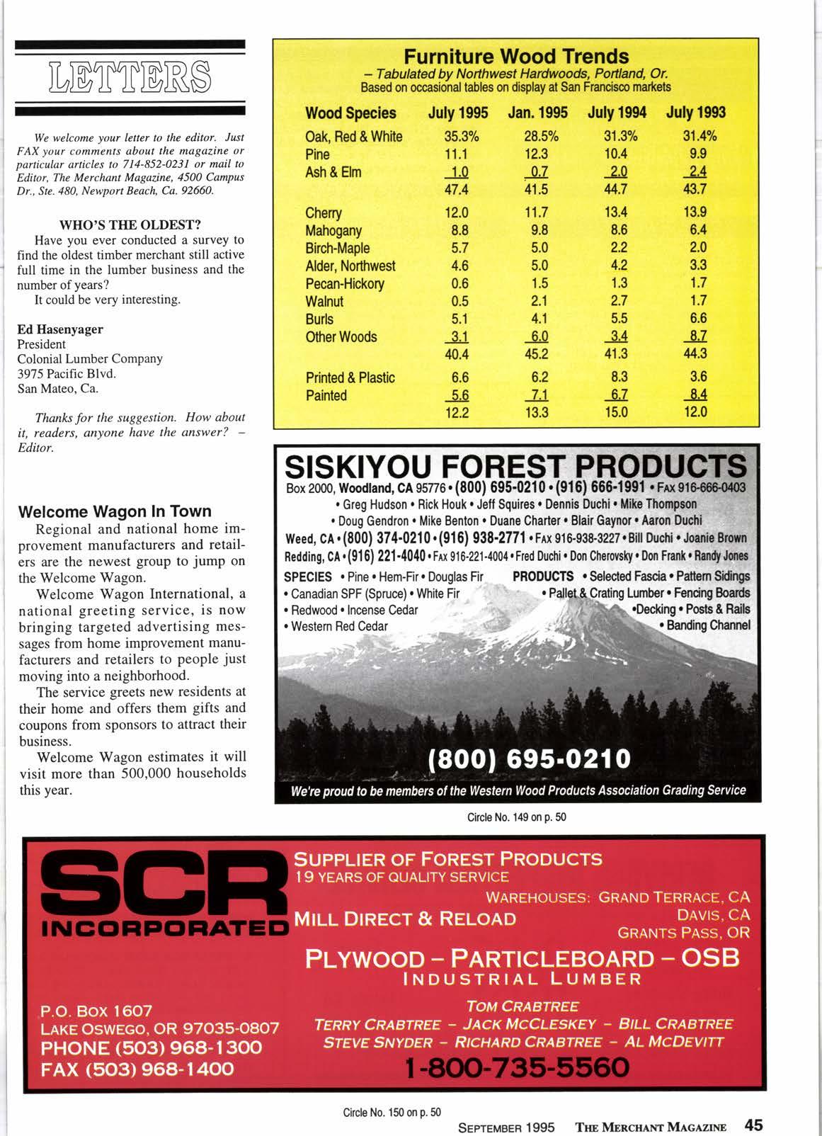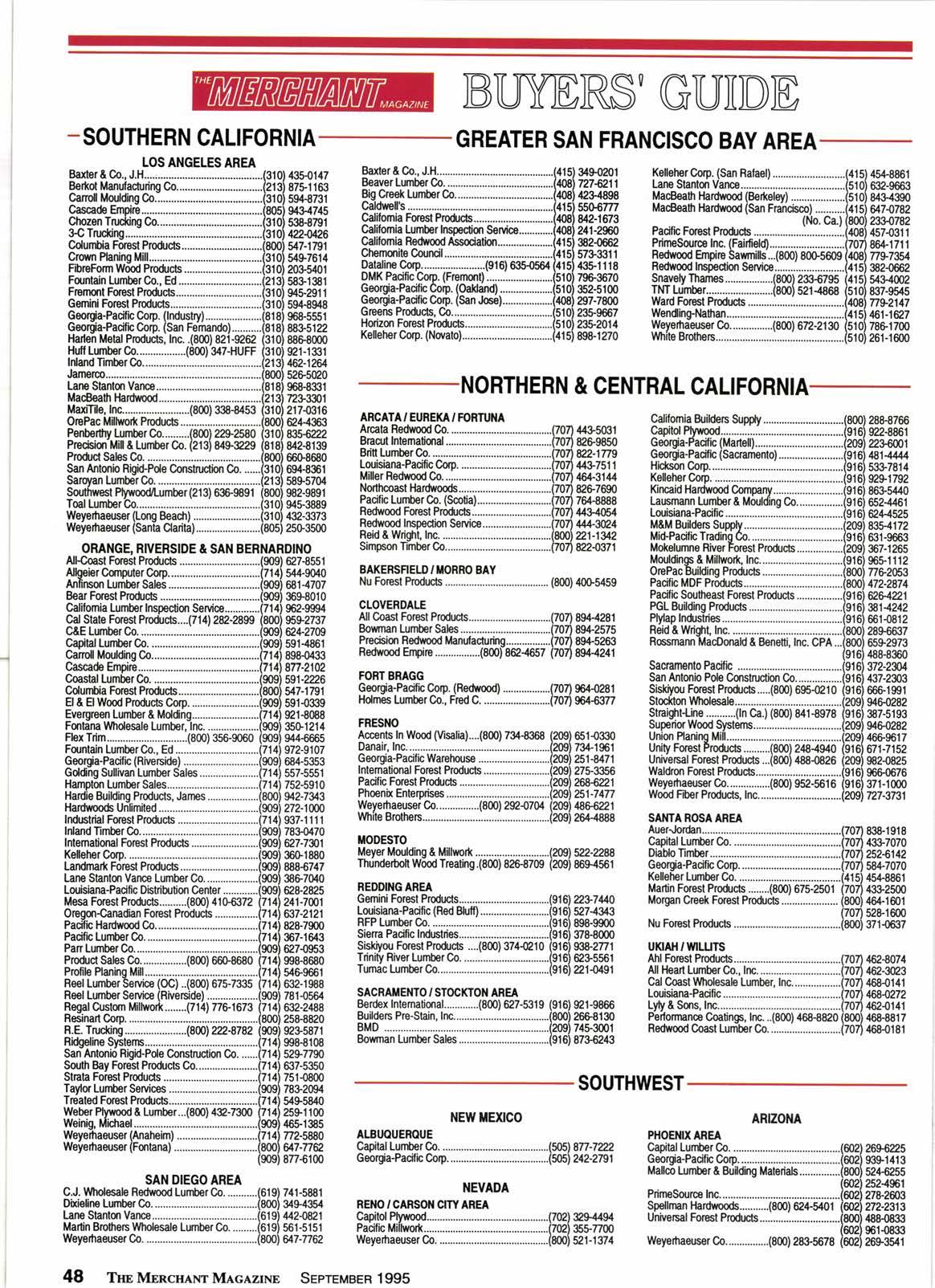 Seruing the lumber and home center markets in SEPTEMBER 1995 l3 Western States - Since 1922 VOLUME 74, NO.3 Serving 13 Western states ADVERNSNG OFF|CES Advertsing iates upon request USA: Alan Wickstrom, 4500 Campus Dr., Suite 480, Net{port Boach, Ca.9660. Telephons (714) 852-1990 Fu 7 1 44524231 E-mail msrchantowitGtrom.beach.nst CHILE: Chades Hallifax, Av. Americo Vsspucio Norte 322, Ol. 13, Las C,mdes, Santiago, Chile. Tel: (01 1)-5& 2 207 1257 FAX 01 1-5&2 207 1262 6 Editorial 18 Neuts Briefs 20 Calendar 22 Western Assn- News 25 Quote of the Month 28 Personals 36 Neus Prod.ucts 44 Neut Literature 45 Letters 46 Classified. Ad,s 48 Buyers'Guid.e 50 Reader Response Form 50 Ad.Inder s { 70 12 osB Q&a How reuised, Quality Assura,nce progran will affect auailable sizes, span ratings Why OSB? How the Panel of the '90s got so hot and wfure it's headed to by 2000 New lumber substitute erops up Straw panels and euen bales emerging as uiable building materials Metnories in redutood L4 15 Veteran lumberman reminisces about a uery different era Red.wood on the insid.e Noted for its exterior uses, redwood is also a fine choice for interior applications such as paneling, trim and columns Should you add a truss plant? Pros and cons of building and operating your own facility Visiting the huge National Build.ing Products E*po Chicago show at new site features record 405 exhibitors 16 42 E Drro R P U B LTSH Et 33li+fi H1i+'r3'!b?f.1?ttr1,'.BiEl[fr '8.,3i,tPf; '*lt EDrroR sara Darv ART DIRECToR MarrhaEmerv STAFFARTISI MarvSion tmcuuftof cindvwitd sUBscR|PnoNsU.S.:$1l.oneyear;$17-twoyears;$22-threeyears.Forei{n:onsyearpayab|sinadvanceinU.s.lunds:suad.$0; Es-u-s!:!1{! !he! available, dus ship6ing and handling. CHANGE 0F ADDRESS Send