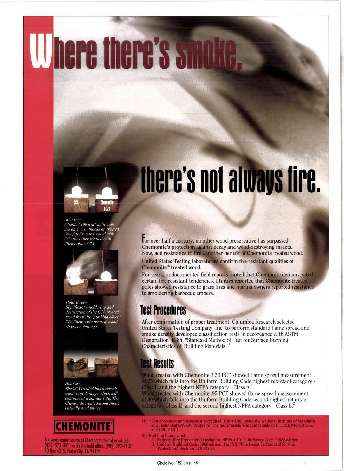 I or over half a century, no other wood preservative has surpassed Chemon ite's protectioqpSlainst decay and wood-destroyi ng i nsects. Now. add resistance to futher benefit of Chemonite treated wood. United States Testing laboratffi confirm fire resistant qualities of Chemonite(a treated wood.