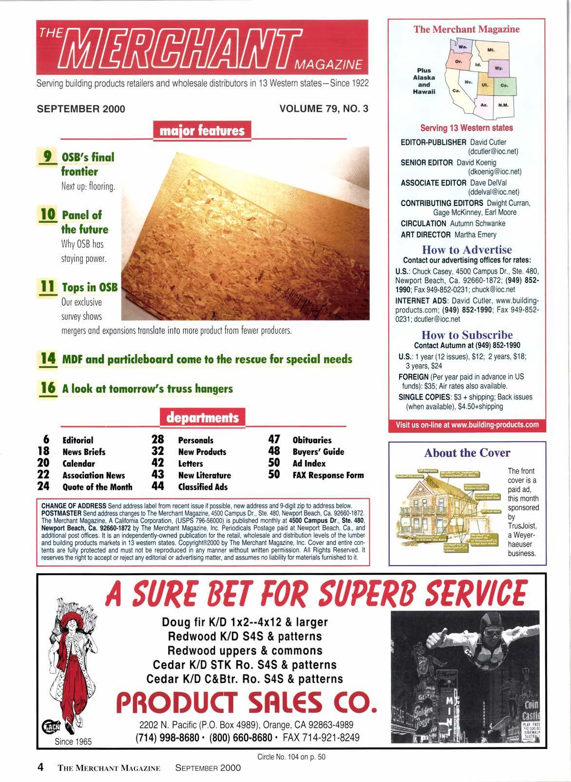 ,f SEPTEMBER 2OOO OSB'g finol lronlier Nexi up: flooring. l0 Ponel ol the future Why 0SB hos $oying power. ll lops in 0SB 0ur exclusive survey shows Ediforial llews Briefs Colendor Assciolion llews Quofe of the lhonth Personols llew Producfs lelfers llew liferoture Clossified Ads VOLUME 79. NO.3 Obituories Buyers'Guide Ad lndex FAX Response lorn 47 48 50 50 28 32 42 43 44 TI t6 5 r8 20 22 24 mergers ond exponsions tronslote into more product from fewer producers. MDI ond podicleboord cone to the lescue for spedol needs A look ol lomorrods lruss hongers CHAi'|GE 0F ADDRESS Send address label trom recenl issje if possible, new address and g-digit zip to address below. POSTiIIASTER Send addrsss changes to The Merchant Magazine, 4500 Campus Dr., Ste. 480, Newport Beach, Ca. 9m60J872. 'lhe Merchant Magazine, A Calitomia Corporation, (USPS 796-56t000) is published monthly at 4500 Campus Dr., Ste. 480, llEnport Beach, Ca. 92660"1872 by The Merchant Magazine, Inc. Periodicals Postage paid at Newport Beach, Ca., and additional post ottices. lt is an independenlly-owned publication for the retail, wholesale and distribution levels of the lumber and building producls markets in 13 westem states. Copydghto2oo0 by The Merchant Magazine, Inc. Cover and entire contents are fully protected and must nol be reproduced in any manner without written permissron. All Rights Reserved. lt reserves the right to accept or reject any editorial or advenising matter, and assumes no liability for materials furnished to it. Circle No. 104 on p. 50 4 THn MrncnnNr Mlc.q.zrNp SepreMaEn 2000 About the Cover The front cover is a paid ad, this month sponsore0 0y TrusJoist, a Weyernaeuser business. Since 1965 A SURE BET FOR SAPERB SERVIf.E Doug fir KID 1x2--4x12 & larger Redwood l(lD S4S & patterns Redwood uppers & commons Cedar IVD STK Ro. S4$ & patterns Cedar K/D C&Btr. Ro. S4S & patterns PRODUCT SRI€S CO. 2202N. Pacific (P.0. Box 4989), Orange, CA 92863-4989 (714) 998-8680 (800) 660-8680 . FAX714-921-8249