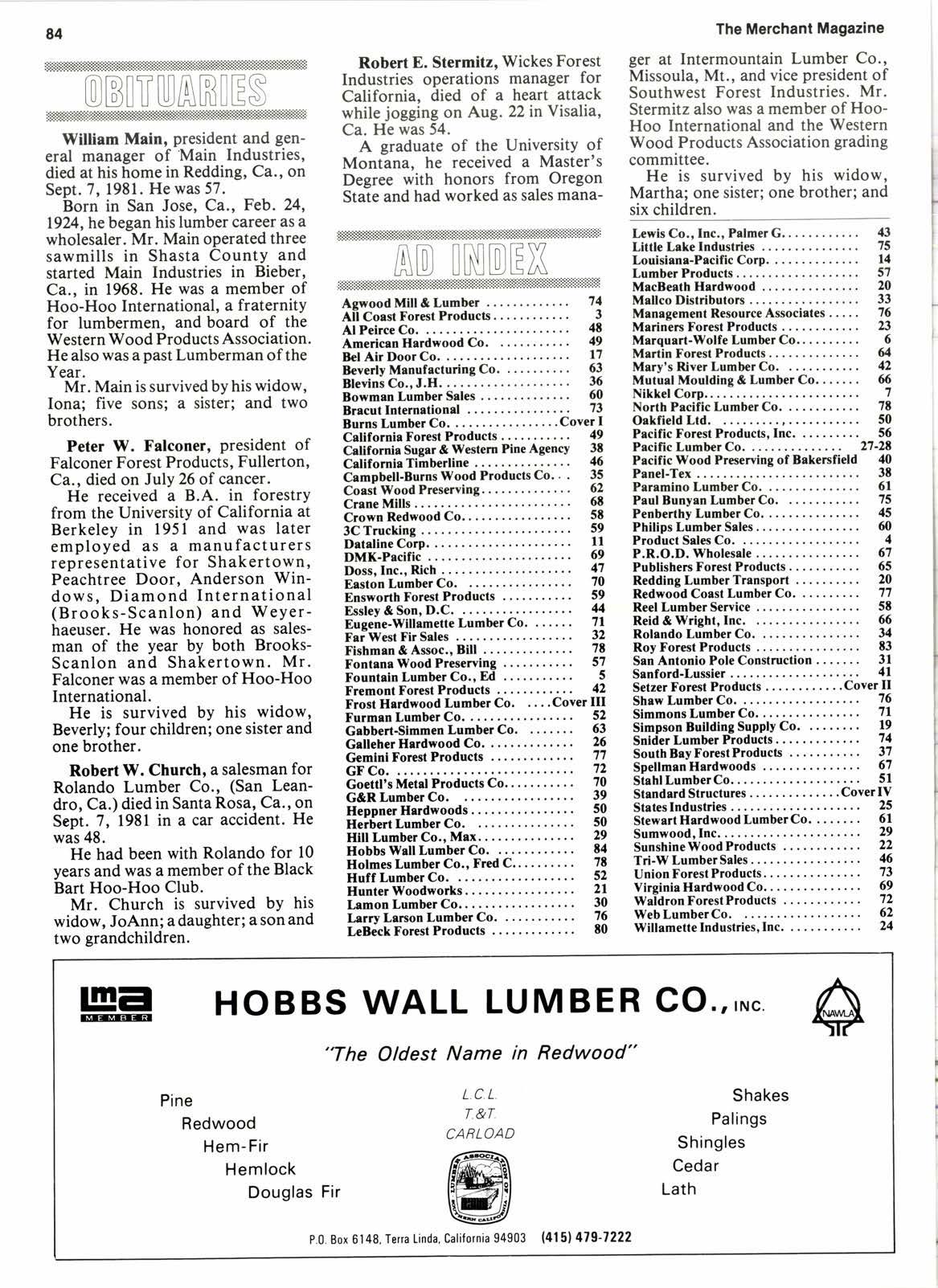 Born in San Jose, Ca., Feb. 24, l9A,he began his lumber career as a wholesaler. Mr. Main operated three sawmills in Shasta County and started Main Industries in Bieber, Ca., in 1968. He was a member of Hoo-Hoo International, a fraternity for lumbermen, and board of the Western Wood Products Association. He also was apast Lumberman of the Year.
