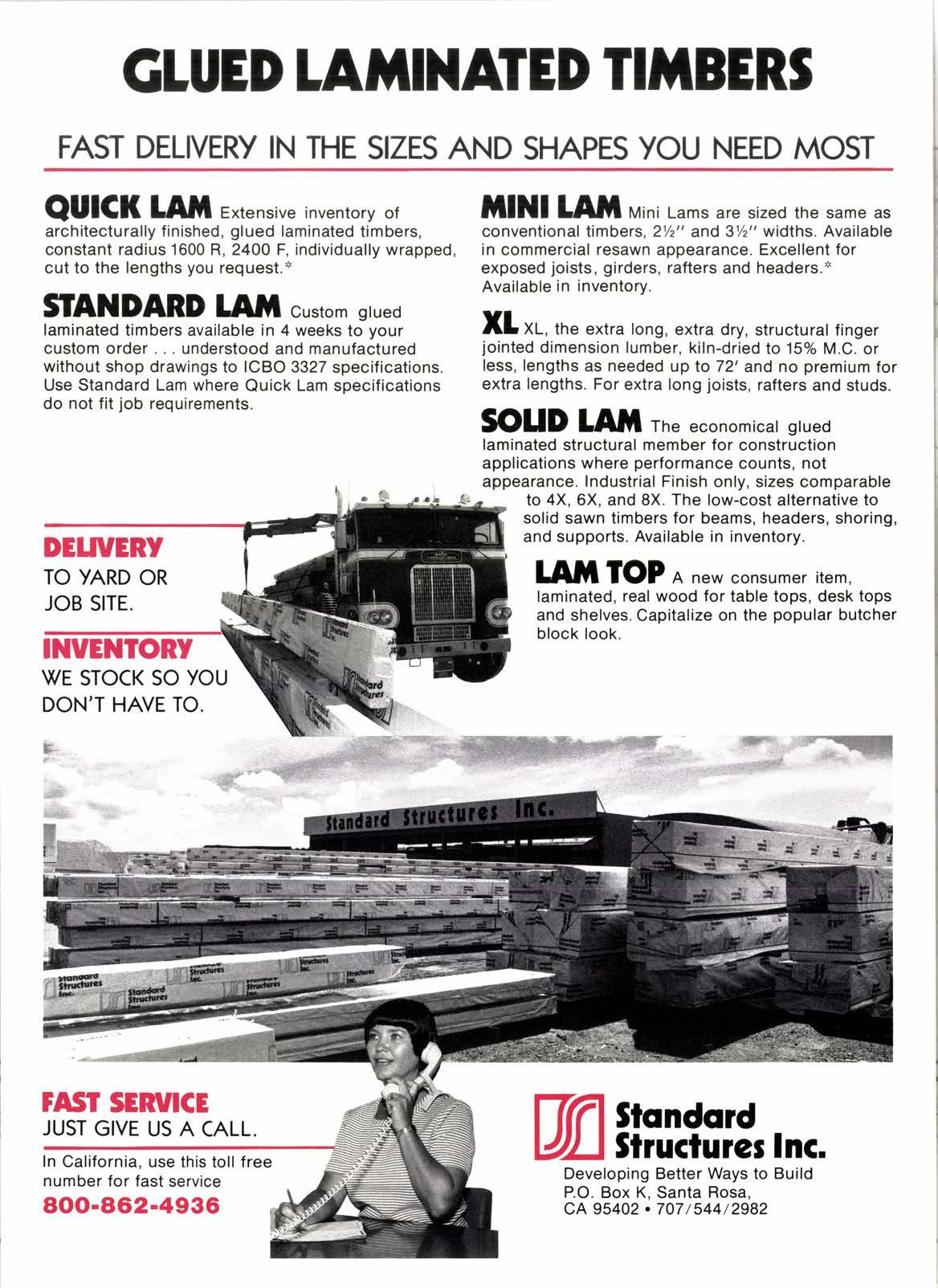 laminated timbers available in 4 weeks to your custom order understood and manufactured without shop drawings to ICBO 3327 specifications. Use Standard Lam where Quick Lam specifications do not fit job requirements.