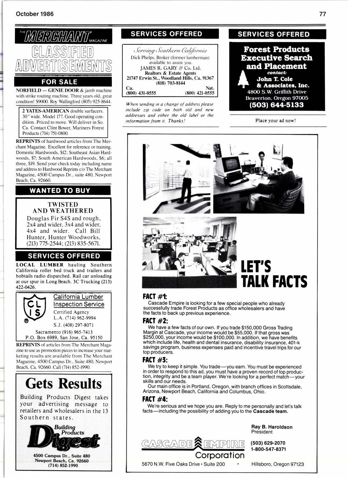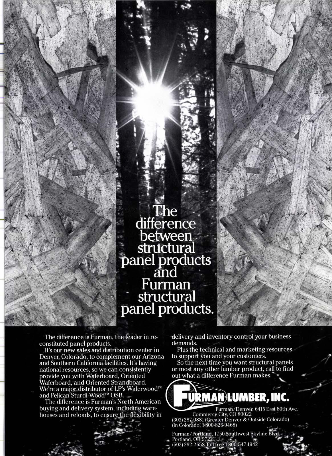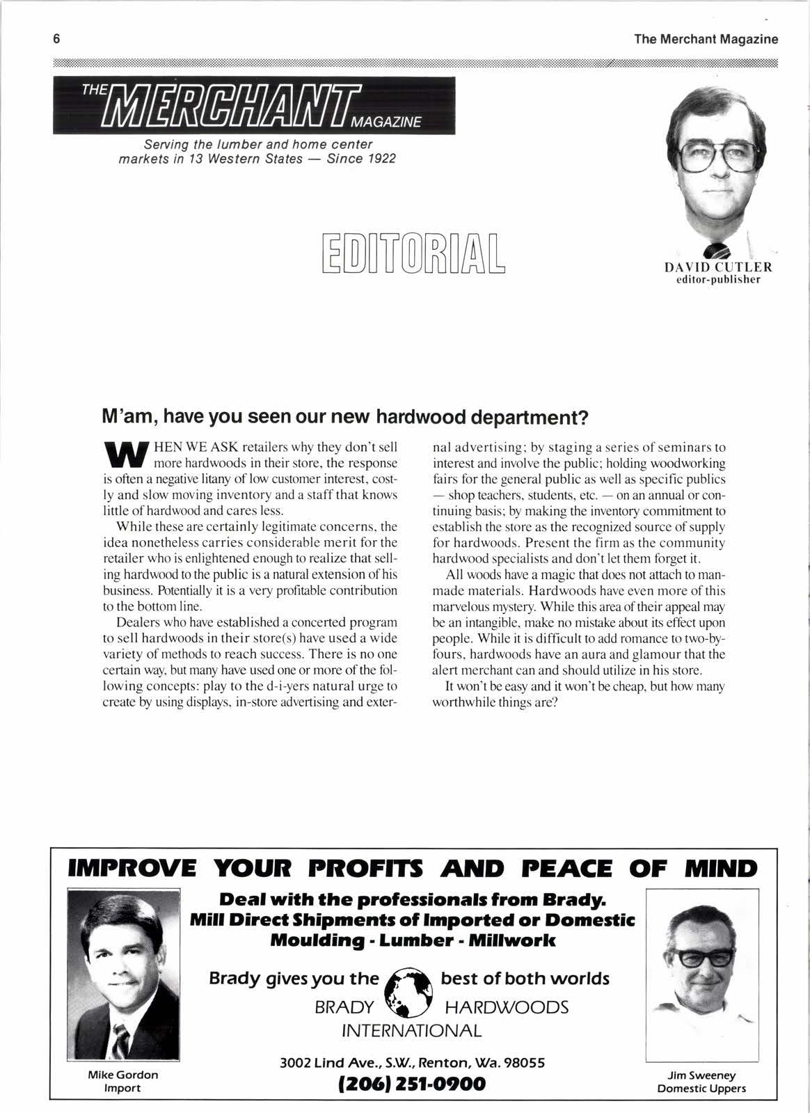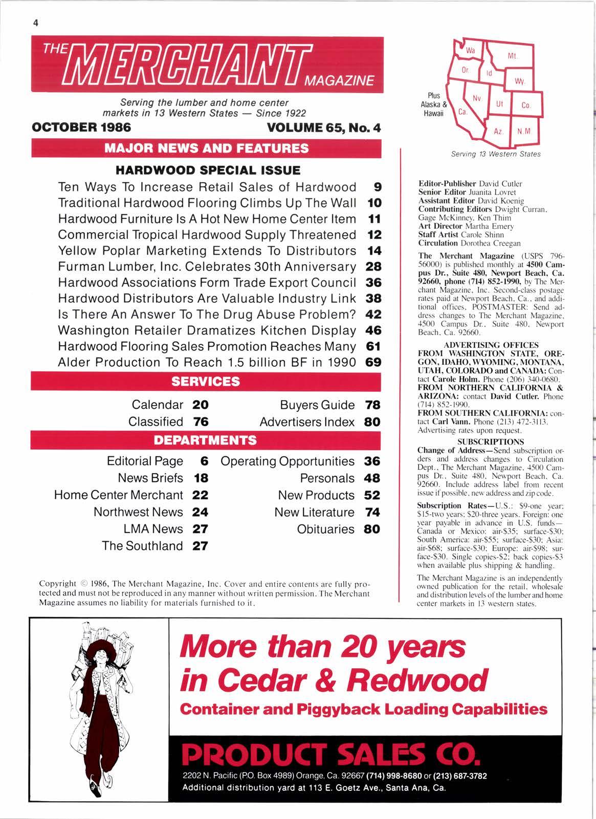 Serving the lumber and home center markets in 13 Western SfatesSince 1922 ocToBER 1986 VOLUME 65, No.4 Ten Ways To Increase Retail Sales of Hardwood Traditional Hardwood Flooring Climbs Up The Wall Hardwood Furniture ls A Hot New Home Center ltem Commercial Tiopical Hardwood Supply Threatened Yellow Poplar Marketing Extends To Distributors Furman Lumber, Inc. Celebrates 30th Anniversary Hardwood Associations Form Trade Export Council Hardwood Distributors Are Valuable lndustry Link ls There An Answer To The Drug Abuse Problem? Washington Retailer Dramatizes Kitchen Display Hardwood Flooring Sales Promotion Reaches Many Alder Production To Reach 1.5 billion BF in 1990 9 ro 11 12 14 2A 36 38 42 46 61 69 Calendar Classified Buyers Guide 78 Advertisers Index 80 Editorial Page News Briefs Home Center Merchant Northwest News LMA News The Southland 6 Operating Opportunities 36