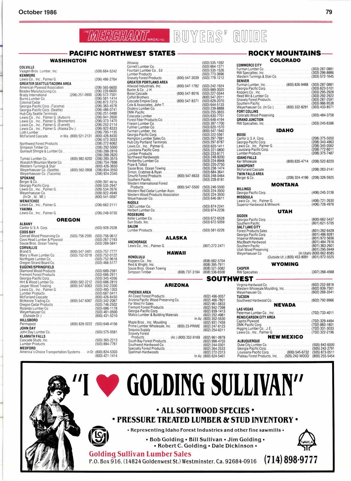 (808) 682-5704 i8o8i3s5-7s11 WYO]f,ll{G (808) 521-5082 CASPER (808)737-3194 (808)s36-6508 Rwspecialties. ........(307)266-4568 ARtZOI{A PHOElIIX AREA All-Coast Forest Products Arazona Pacific Wood Preseruing Co. FarWest Fir Sales. Fremont Forest Products Georgia-Pacitic Corp. MallcoLumber&EuildinqMaterials...... Virginia Hardwood Co. WesternWh0lesale Moulding, Inc.. Weyerhaeuser Co. TUC801{ SoulhweslHardwoodco.............. 1{EVADA tAs VEGAS Peterman Lumber Co., Inc. REI{O'CABSOI{ CIIY AREA Capitol Plywood DMK-Pacific Corc. Higgins Lumber Co., J.E Lewisco..lnc..PalmerG. (602) 252-6818 (602) 939-7501 (602) 269-3541 (602) 792.9966 Intu. (so())23-cRrME (602) 496-0057 (602) 466-7801 (602) 961-0833 (602) 942-7398 (602) 939-1413 (602) 252-4961 (800) 352-5530 (602) 931-7459 (6021247-6123 (602) 254-631 1 (702) 733-401 1 17021329-4494 (702) 883-1801 (702) 331.3033 1702J322-2196 Maple Bros., Inc. MouldinO Prime Lumber Wholesale, Inc. Sequoia Supply Snavely Forest Products. . South Bay Forest Products Southwest Hardwood Co. Specialty Forest Products. SpellmanHardwoods... (Az.) (800) 352.s16e (602)s61-0e78 llEW MEXICO (602)998-4703 ALIU0UERoUE (602)244-0301 oukecityLumberCo.. (505)842-6000 (602)264-2533 Georoia-Pacificoorp. .. (505)242-2791 16021272-2313 Louisiana-Pacilicoorp. ........ (800)545-6732 (505)873-0511 h A2. (800) 624.5401 Plateau Forest Products, lnc. (505) 242-W000 (800) 255-5454 ,,1? OOIDINO SUIIIVAN" . ALL SOFTTOOD SPDCIES . . PKDSSURE TRDATND ruMBEK & STUD INVDNTORY . Representing Idaho Forest Industries and other fine sawmllls Bob Golding. Bill Sullivan Jim Golding. i. RobertC. Golding. Dale Dickinson . Golding Sullivan Lumber Sales ;;, il nl;ift;?tffi;ffi i r'i jirXtm i n ste r, ca. e2 68 4-0e 16 (7 141 898'97 7 7